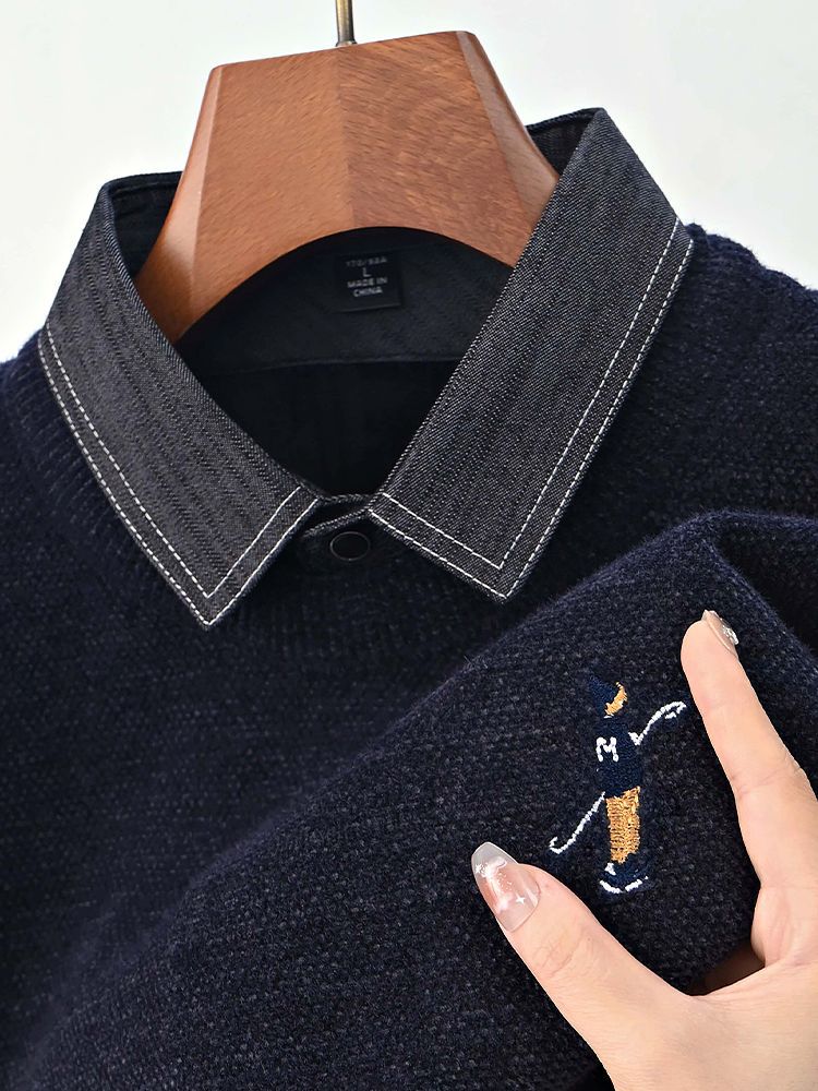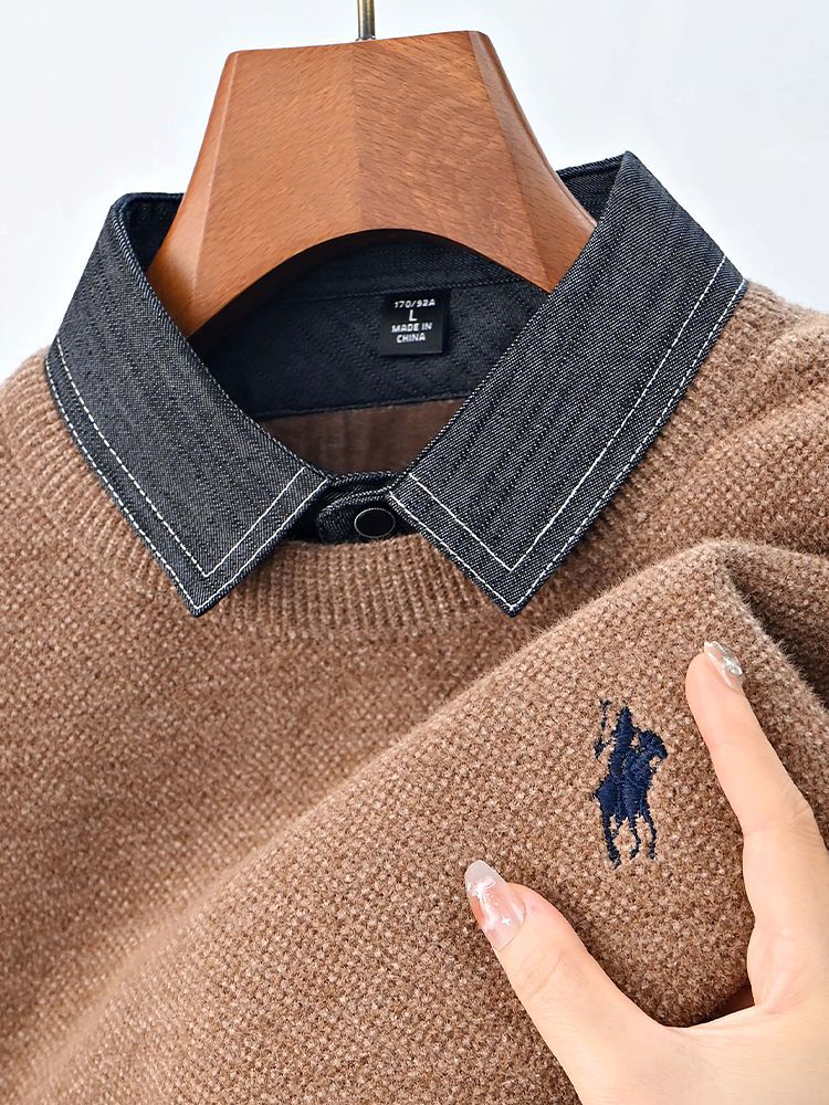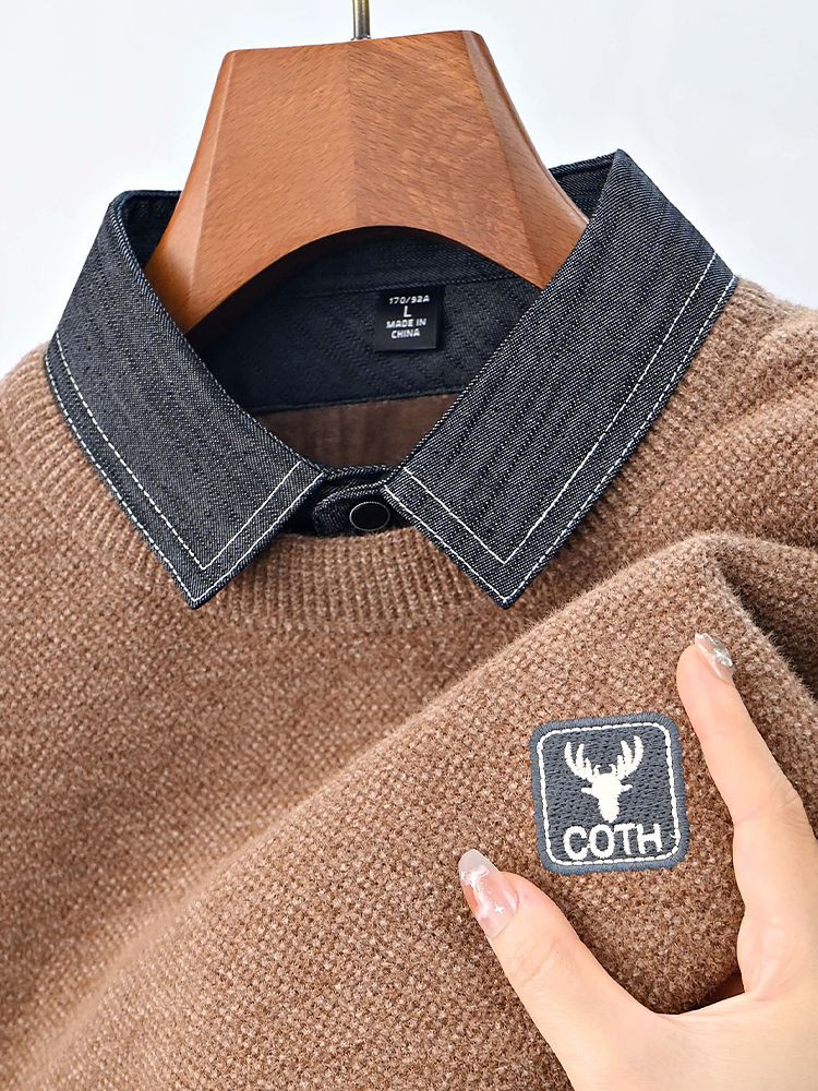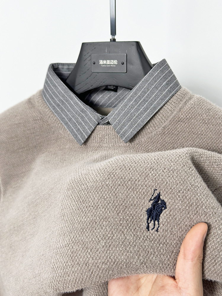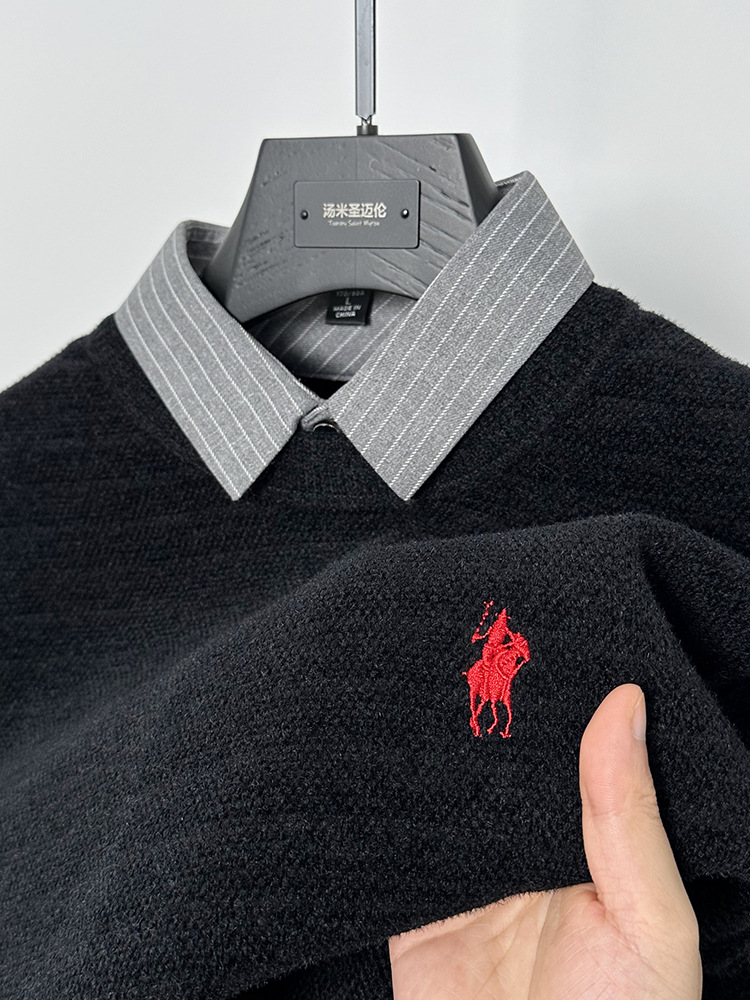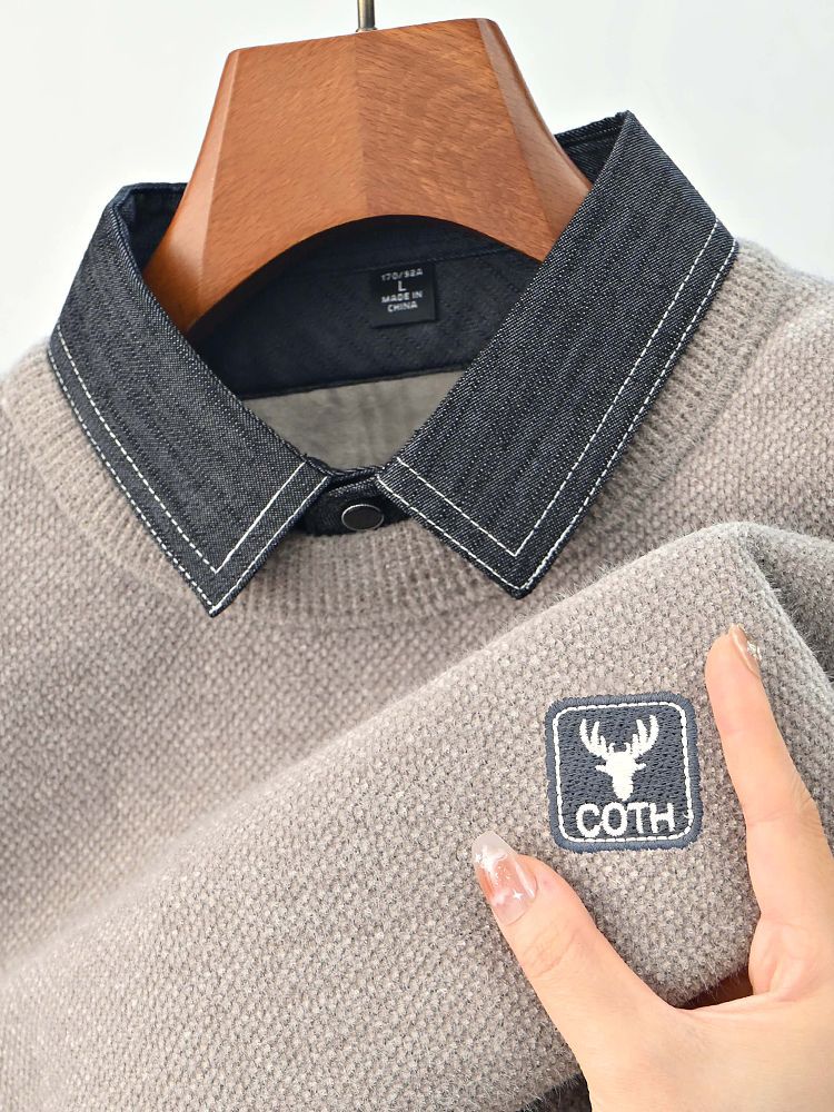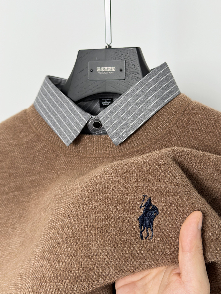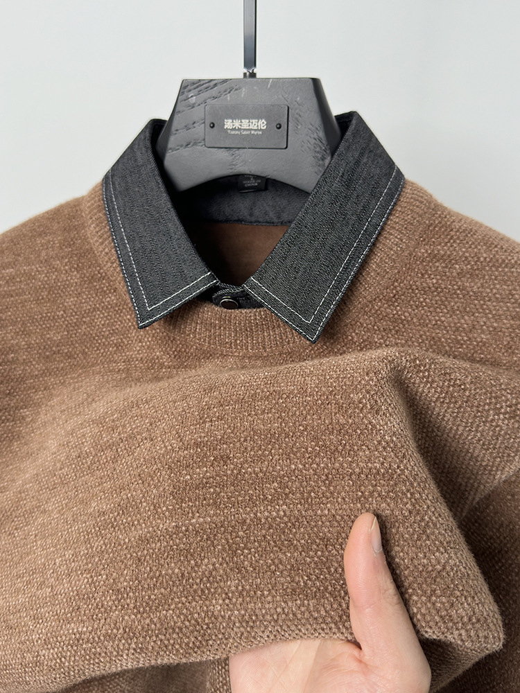 원피스 벨벳 기모 두꺼운 남성용 스웨터 새 남성용 셔츠 칼라 가짜 투피스 겨울 따뜻한 니트 베이스 셔츠