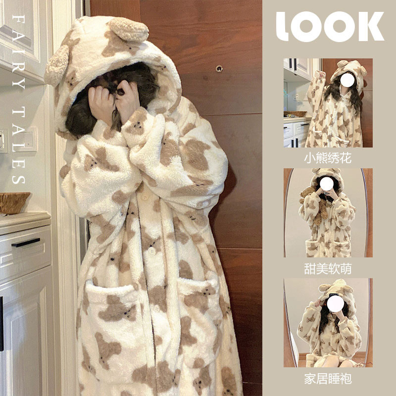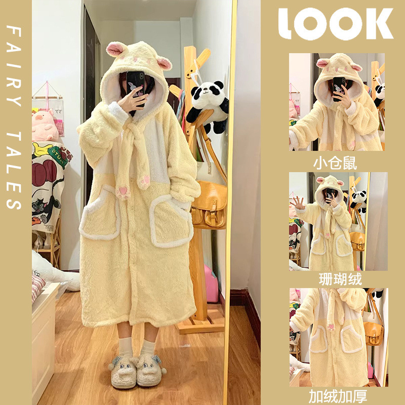 小仓鼠珊瑚绒睡衣女冬季加绒加厚保暖长款连帽法兰绒冬天学生睡袍스토어 가기