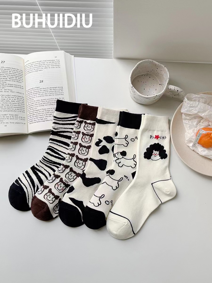 여성용 흑백 만화 양말 외주 여성용 일본 스타일 귀여운 커플 Ins 세련된 양말 코튼 스타킹
