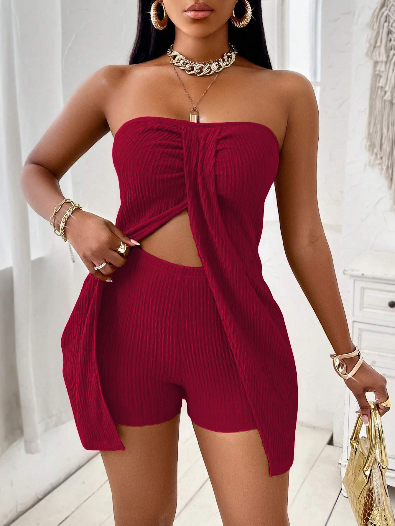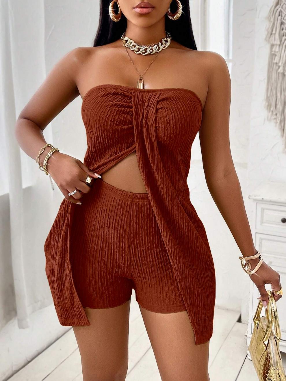 실제 샷 재고 shein cross-border 독립 스테이션 1688 베스트 셀러 유럽과 미국의 단색 끈이없는 탑 반바지 세트스토어 가기