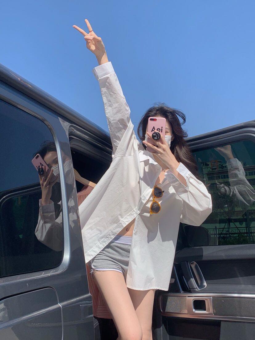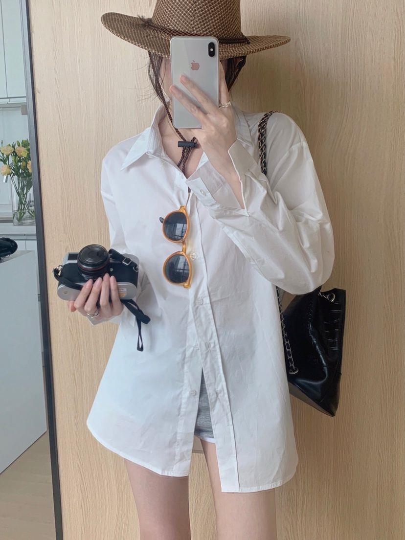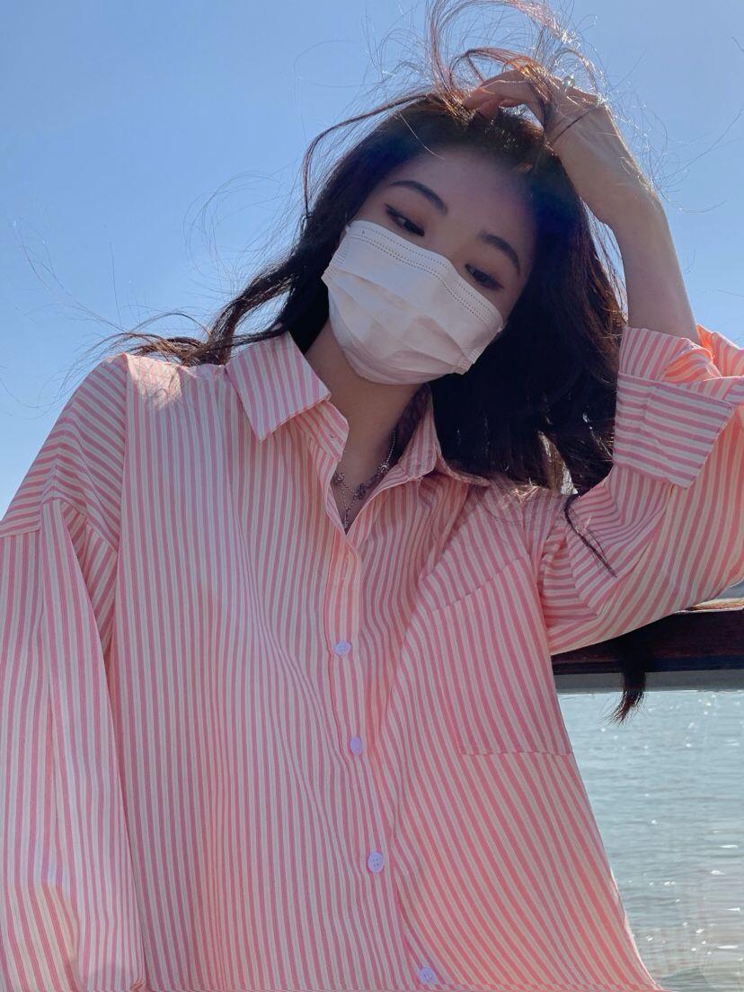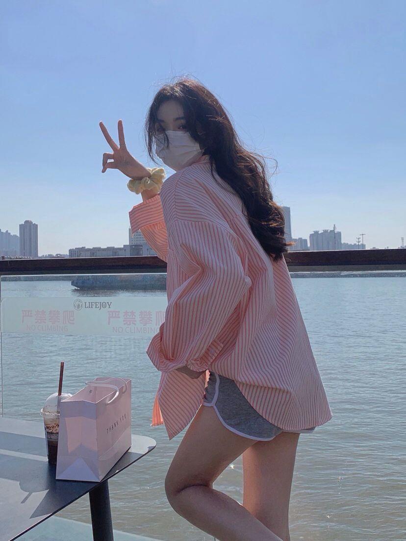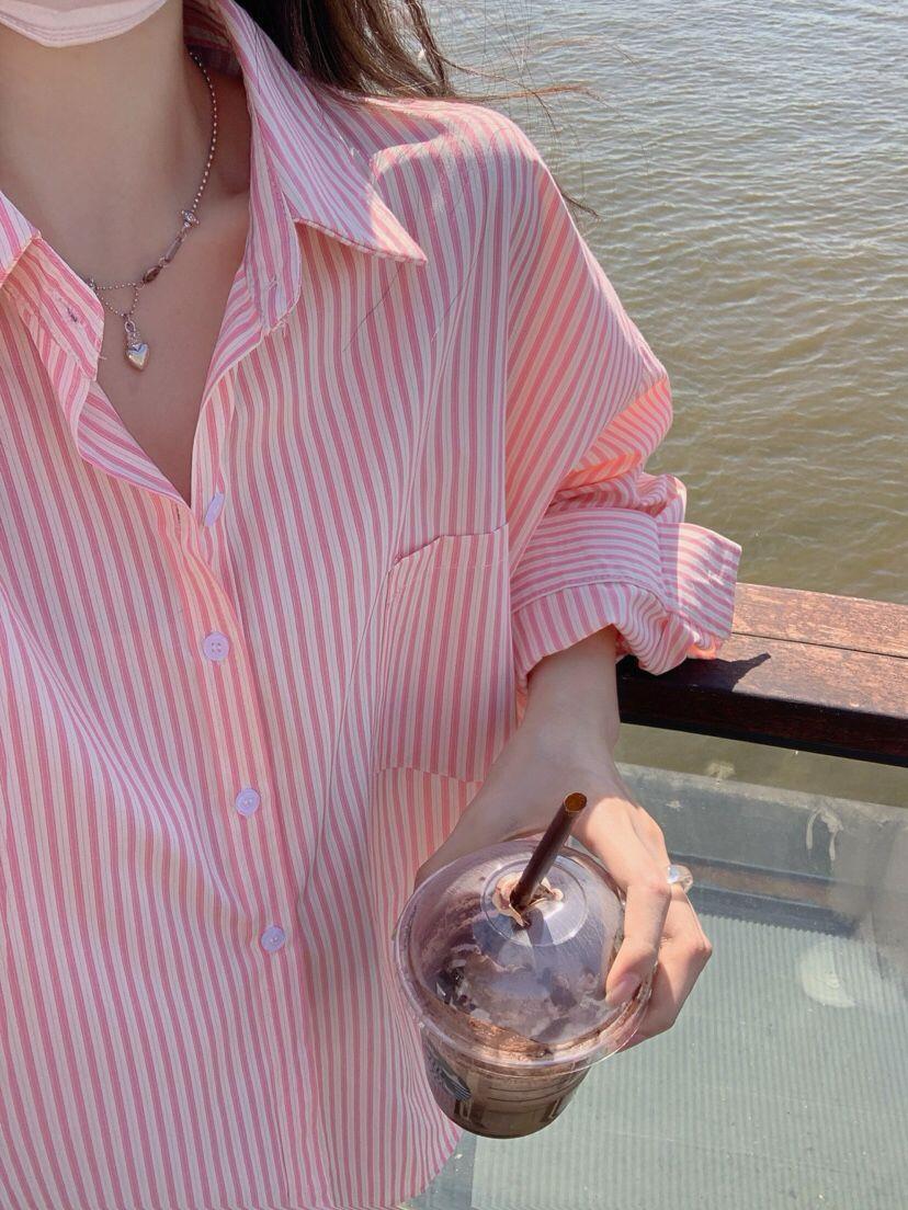 고급 녹색 선 스크린 줄무늬 셔츠 여성의 봄과 여름 얇은 디자인 감각 틈새 중간 길이 소금 탑 코트스토어 가기