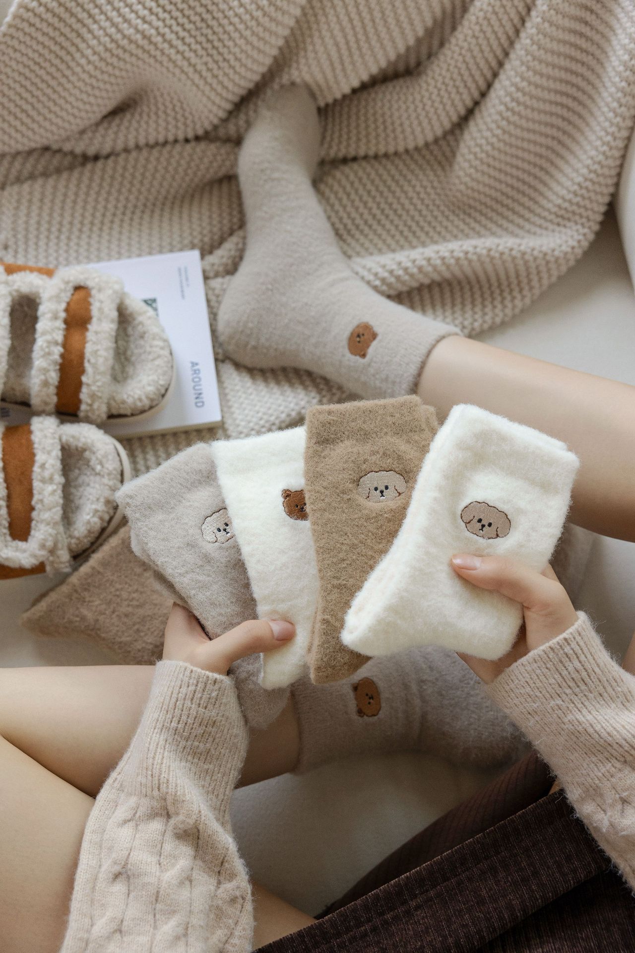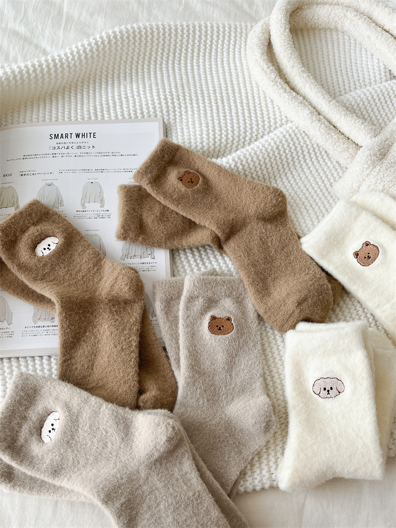 호주 벨벳 패딩 따뜻한 튜브 양말 어린이를위한 귀여운 곰 강아지 자수 흰색 두꺼운 양말 가을과 겨울 여성 바닥 양말