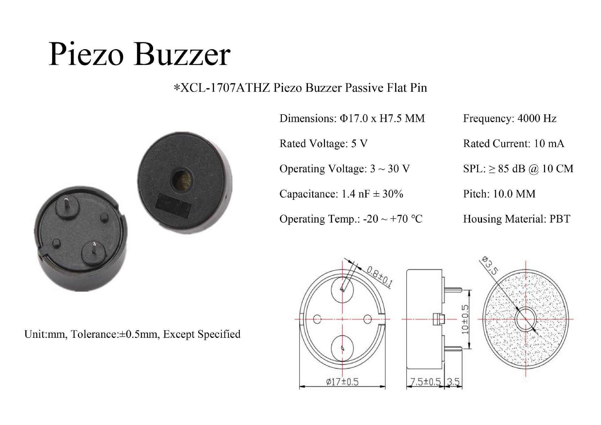 XCL-1707ATHZ 압전 버저 스프링 핀 수동 높은 데시벨 4KHz 소형 기기 컨트롤러 전용스토어 가기