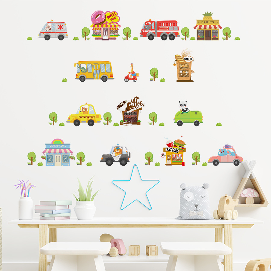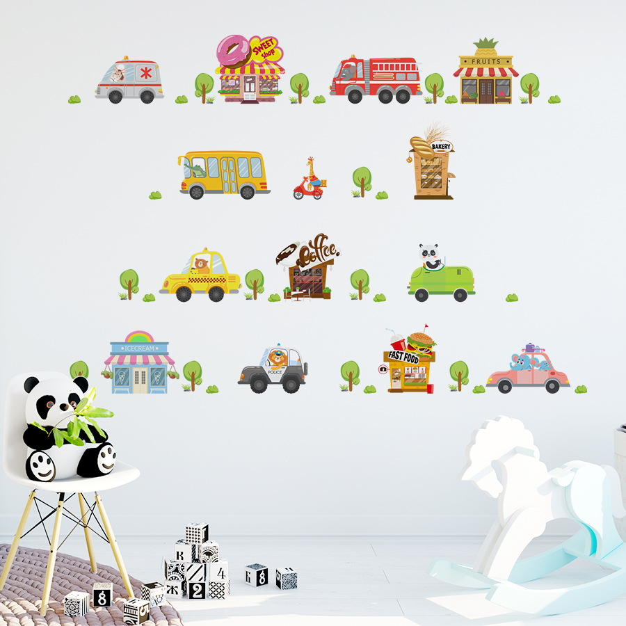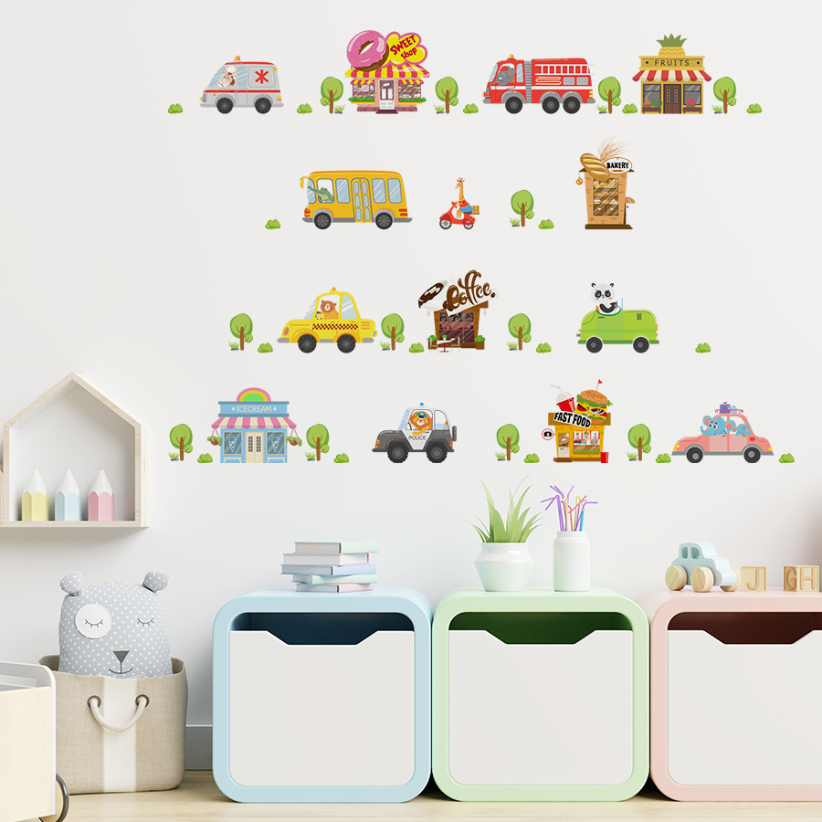 ZN3100E 만화 자동차 레스토랑 편의점 자체 접착 벽 스티커 ins 어린이 방 배경 벽 장식 스티커