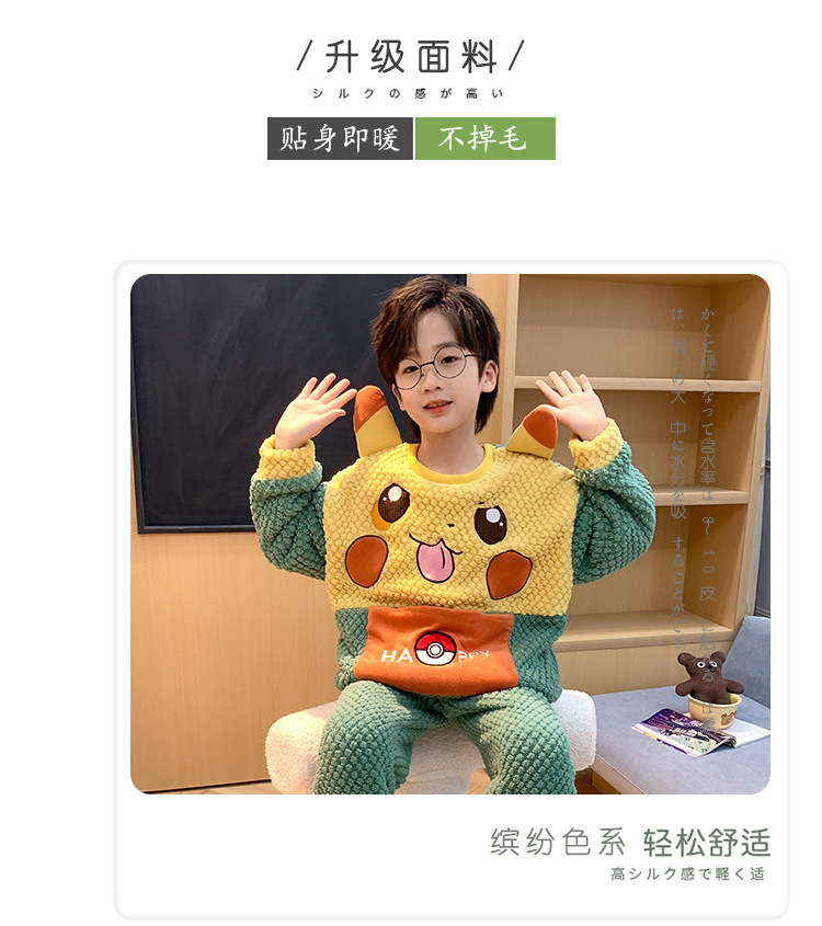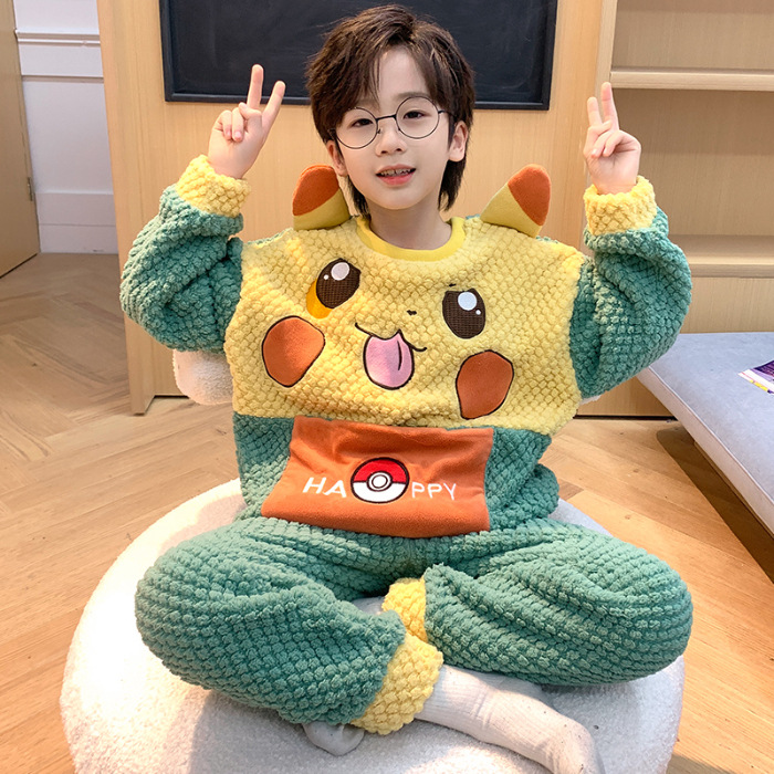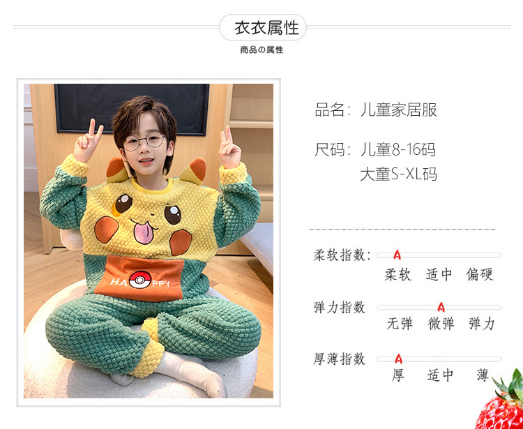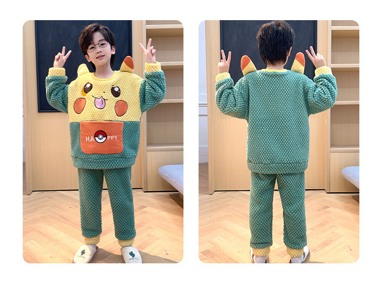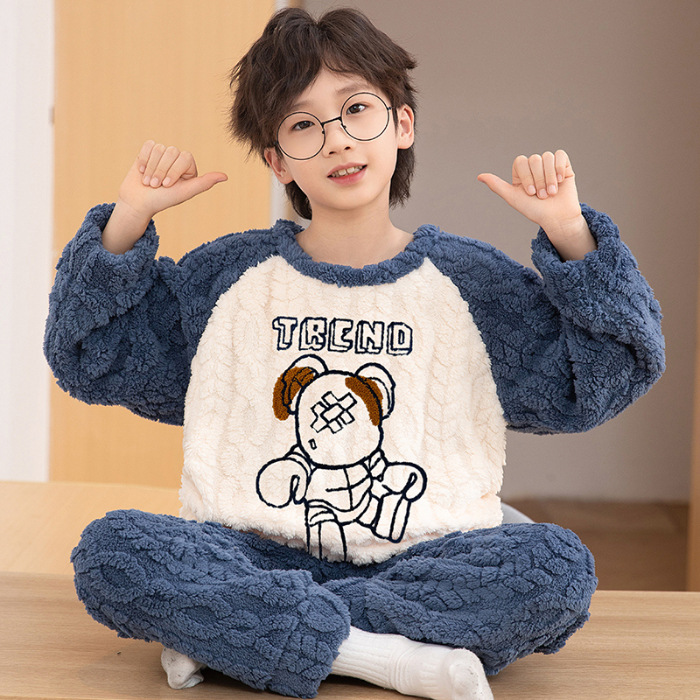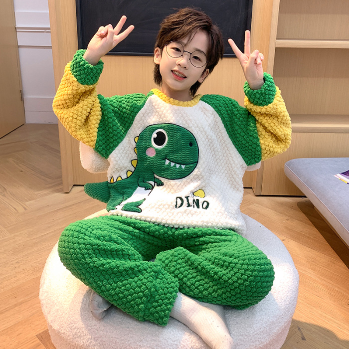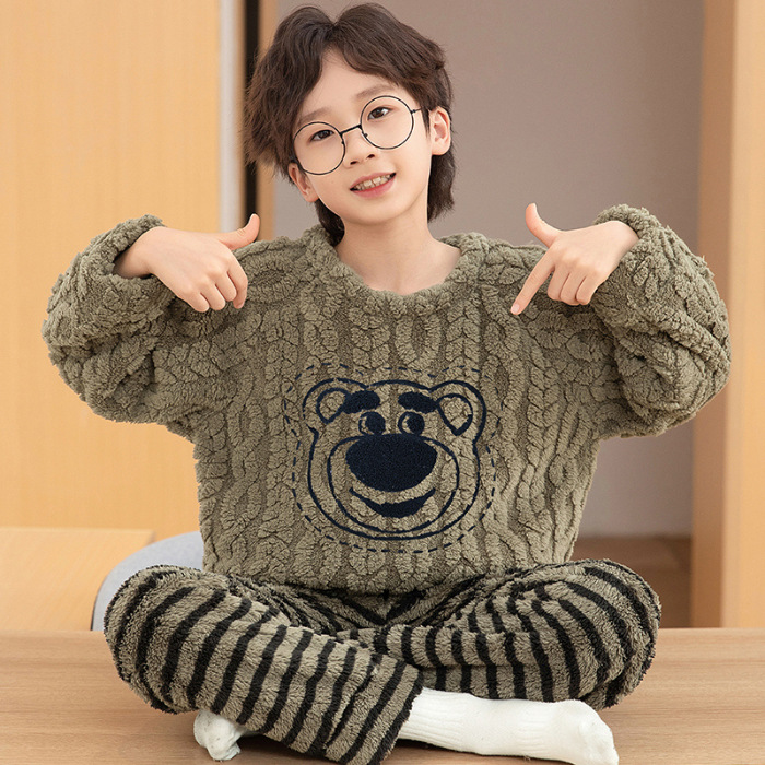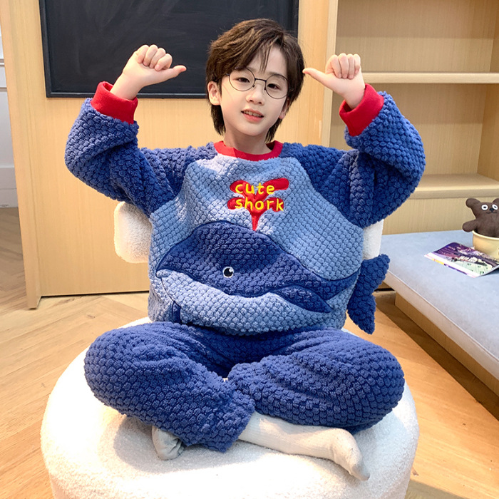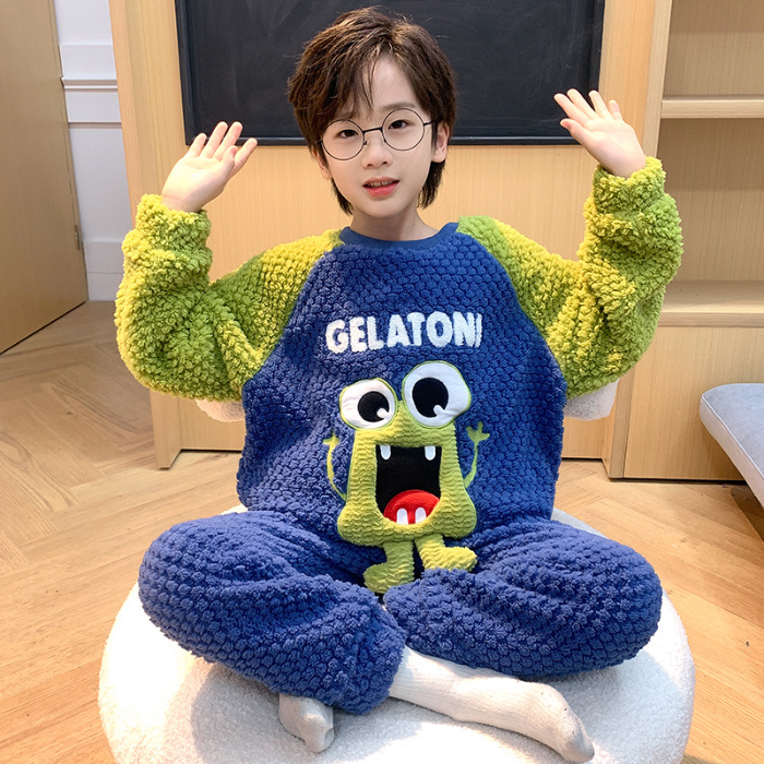 어린이 잠옷 산호 양털 가을과 겨울 귀여운 만화 소년 둥근 목 두꺼운 따뜻한 중대형 어린이 가정 옷 세트