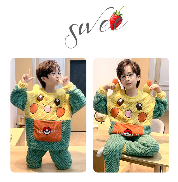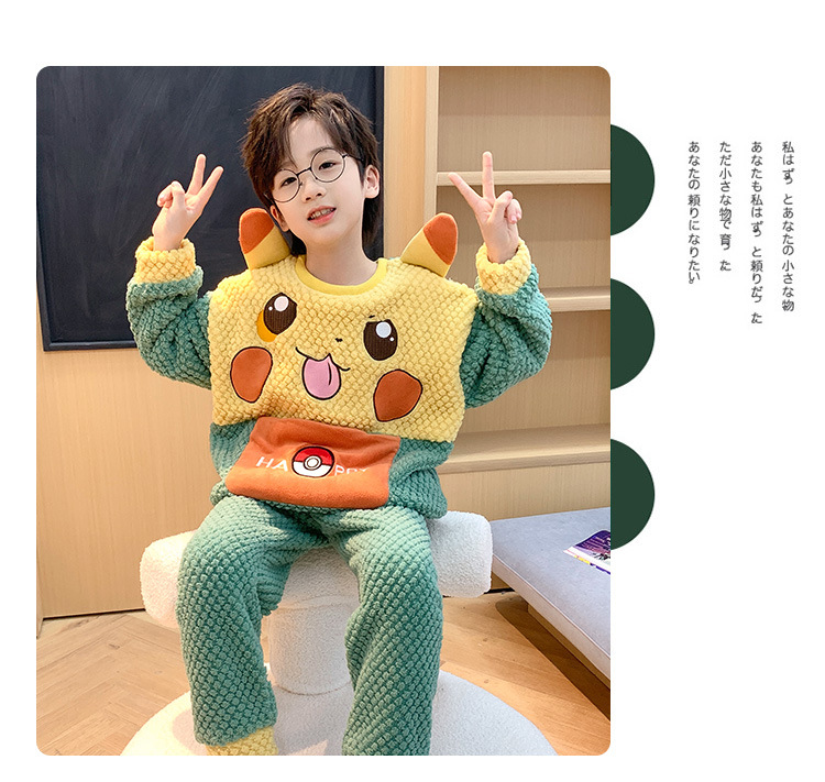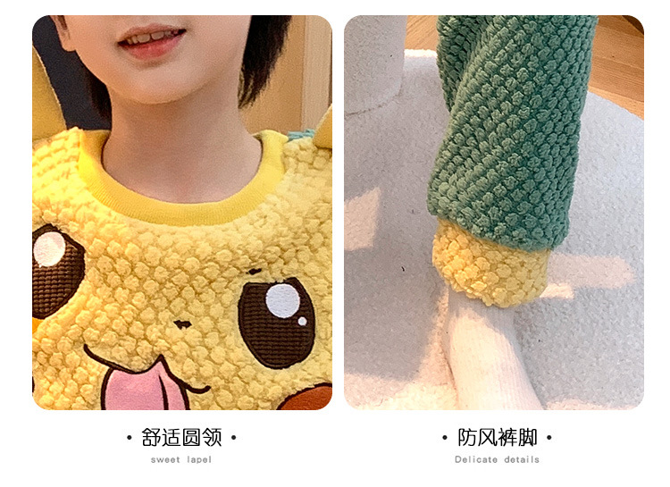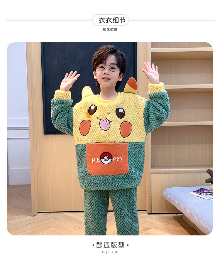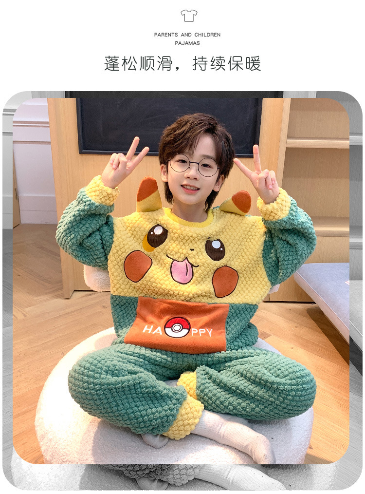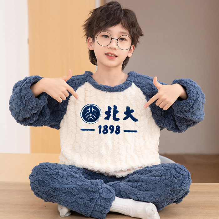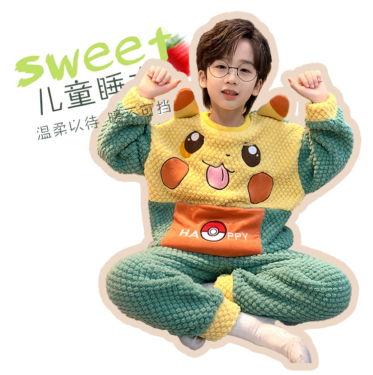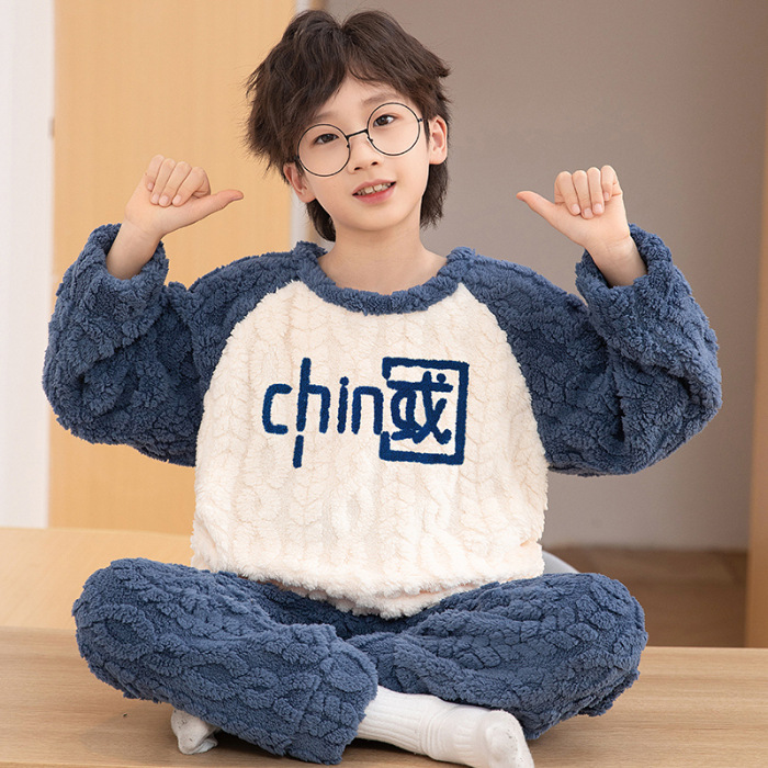 어린이 잠옷 산호 양털 가을과 겨울 귀여운 만화 소년 둥근 목 두꺼운 따뜻한 중대형 어린이 가정 옷 세트