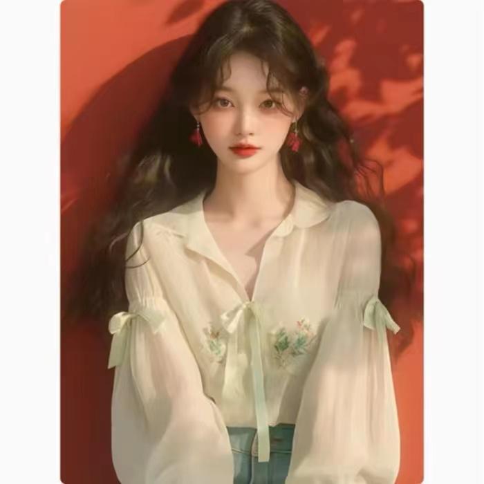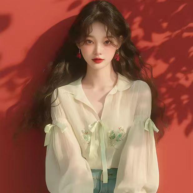 녹색 선 스크린 쉬폰 셔츠 여성의 이른 가을 새로운 디자인 달콤한 공주 스타일 독특한 슈퍼 잘 생긴 긴 소매 탑스토어 가기