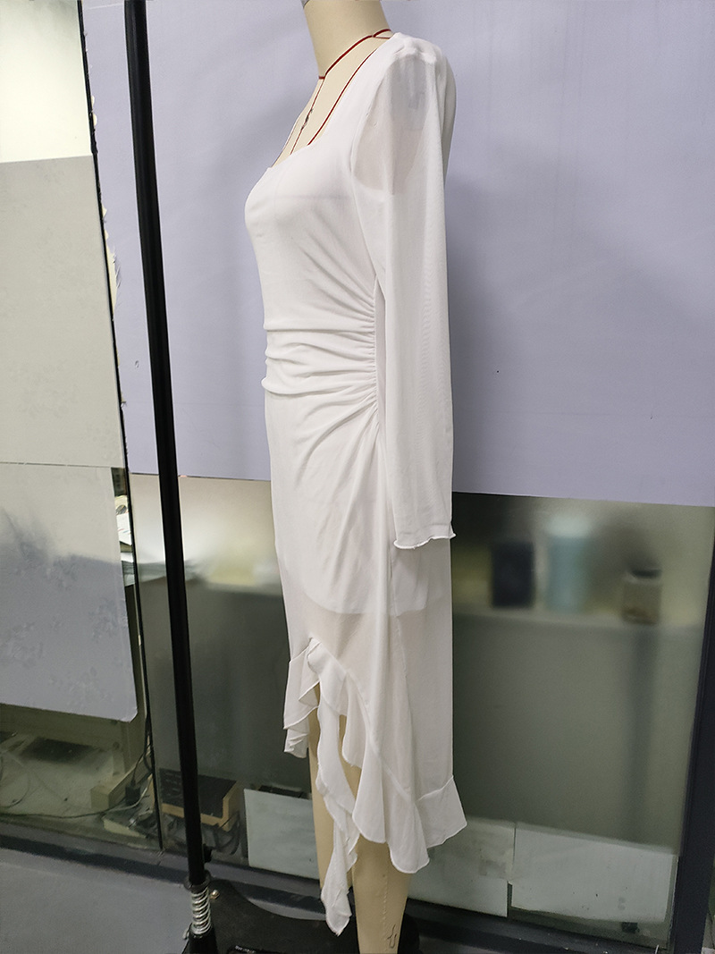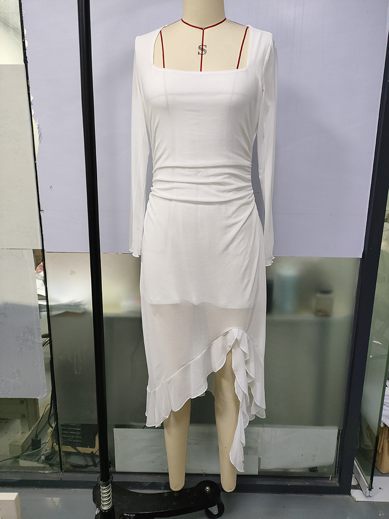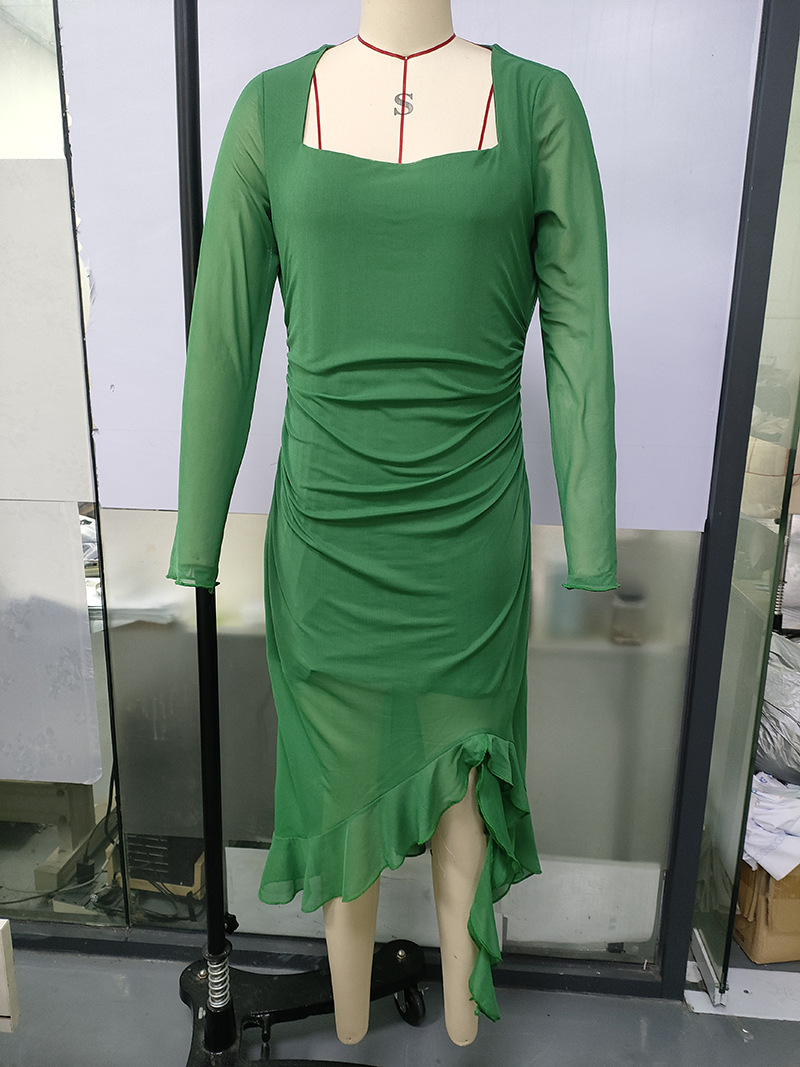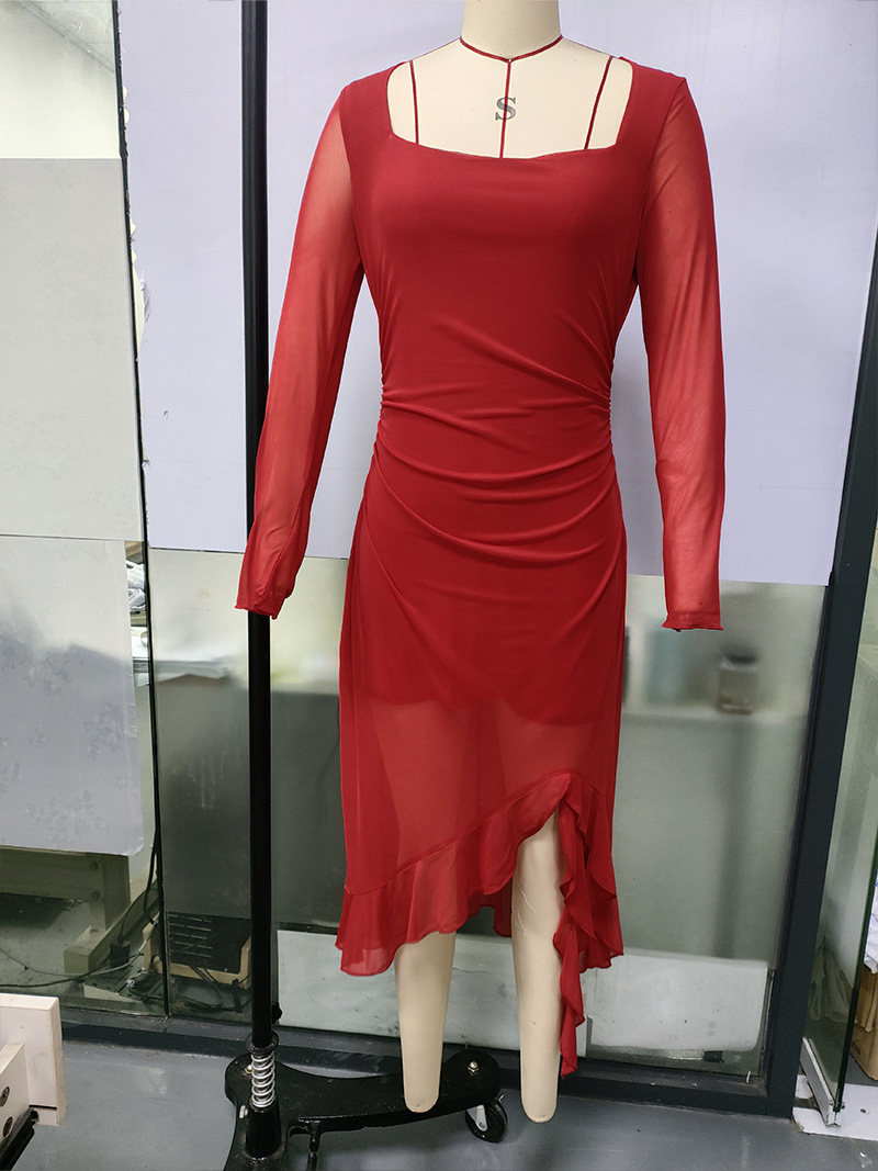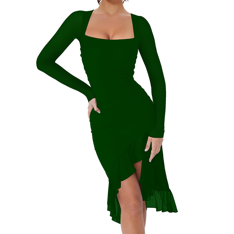 유럽과 미국의 크로스보더 여성 의류 봄 여름 신상 섹시하고 트렌디한 스퀘어 넥 슬림핏 긴팔 패치워크 힙허깅 드레스스토어 가기