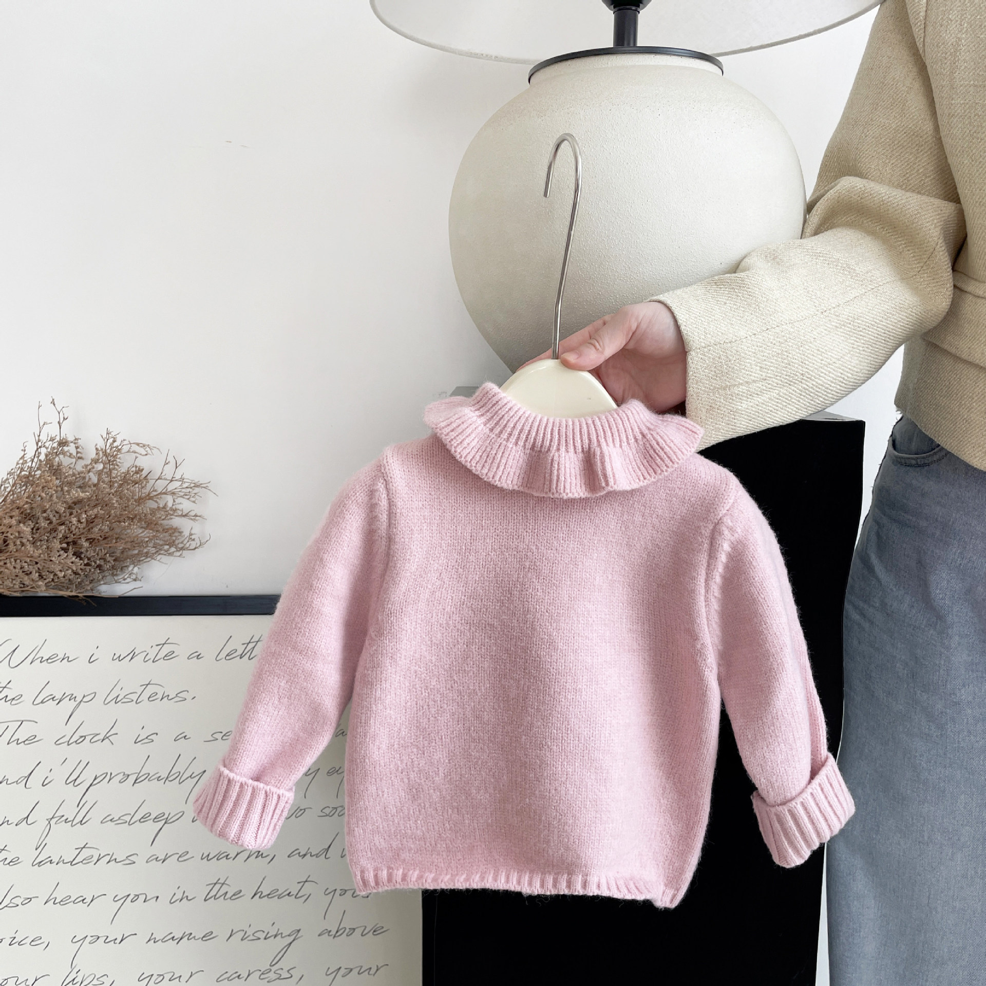 여자 세련된 연꽃 칼라 솔리드 컬러 스웨터 2024 새로운 겨울 어린 소녀 따뜻한 올 매치 스트레치베이스 셔츠