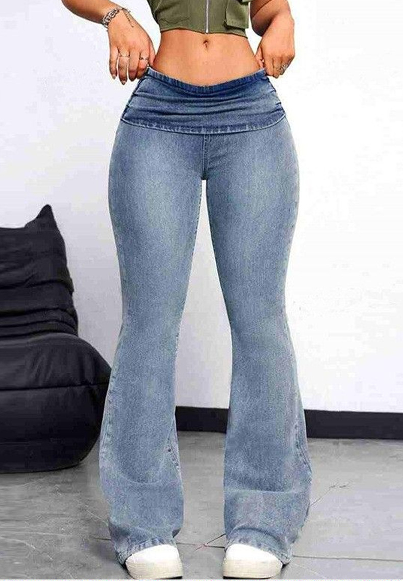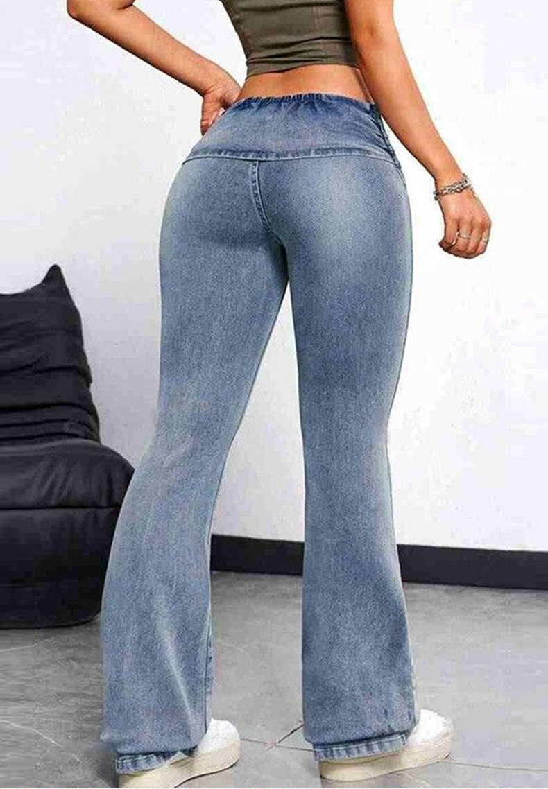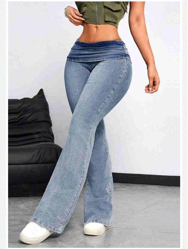 유럽 사이즈 크로스보더 유럽 및 미국 스타일 복숭아 엉덩이 데님 팬츠 여성용 타이트한 신축성 긴바지 슬림한 힙업 하이웨이스트 약간의 플레어 팬츠스토어 가기