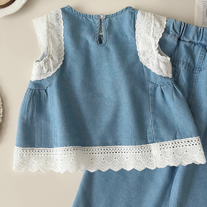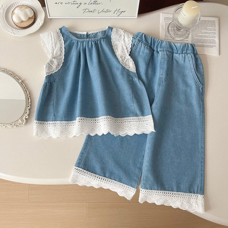 한국 스타일 소녀 데님 정장 여름 새로운 스타일 2025 어린이 레이스 민소매 조끼 바지 투피스 트렌디 세트스토어 가기