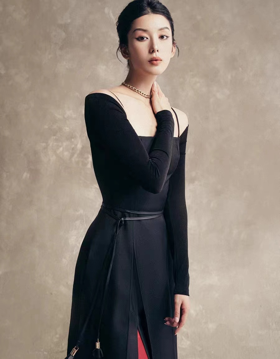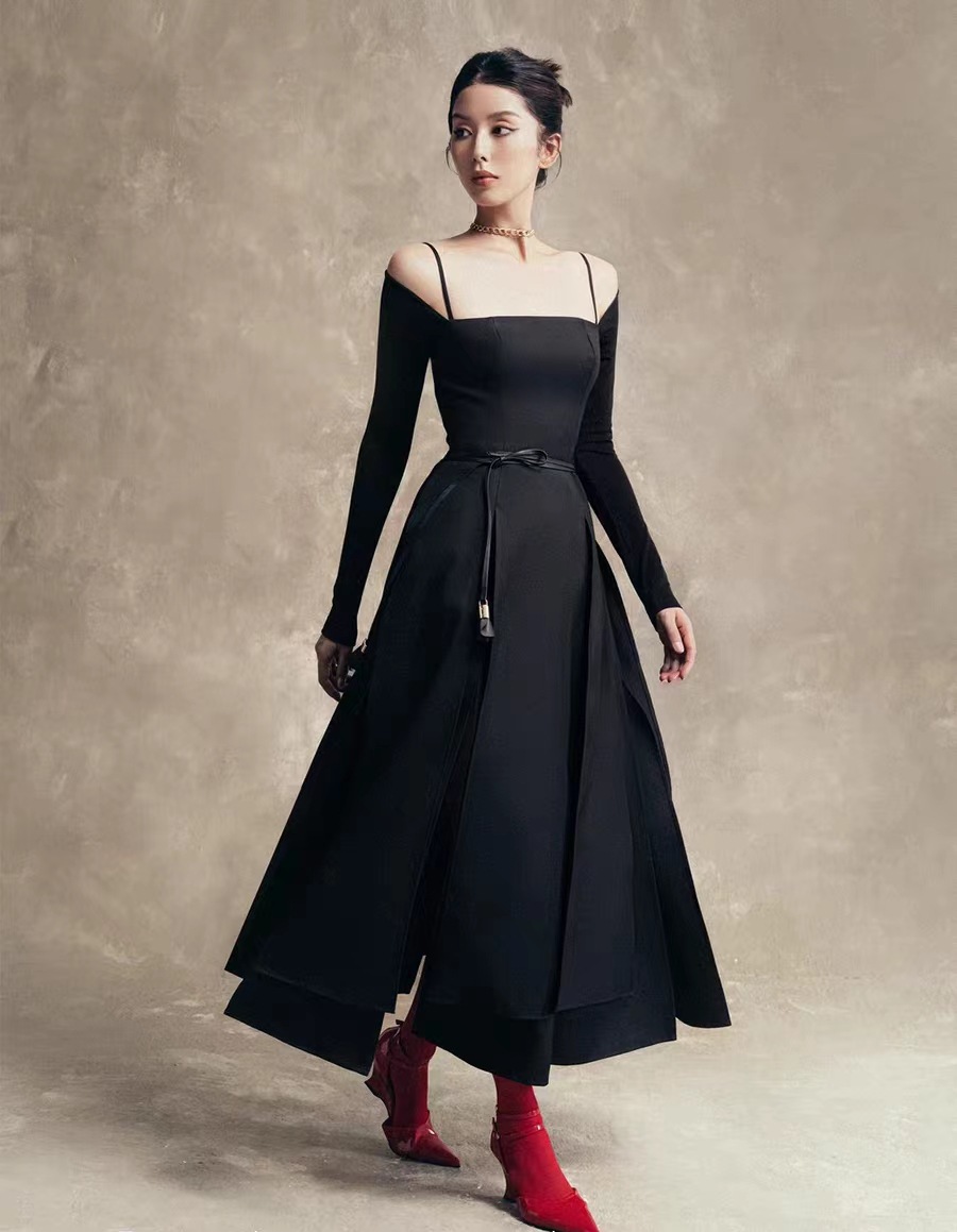 하이 엔드 스플릿 숄더 원피스 새로운 우아한 우아한 허리 단색 긴 소매 원피스 40283스토어 가기