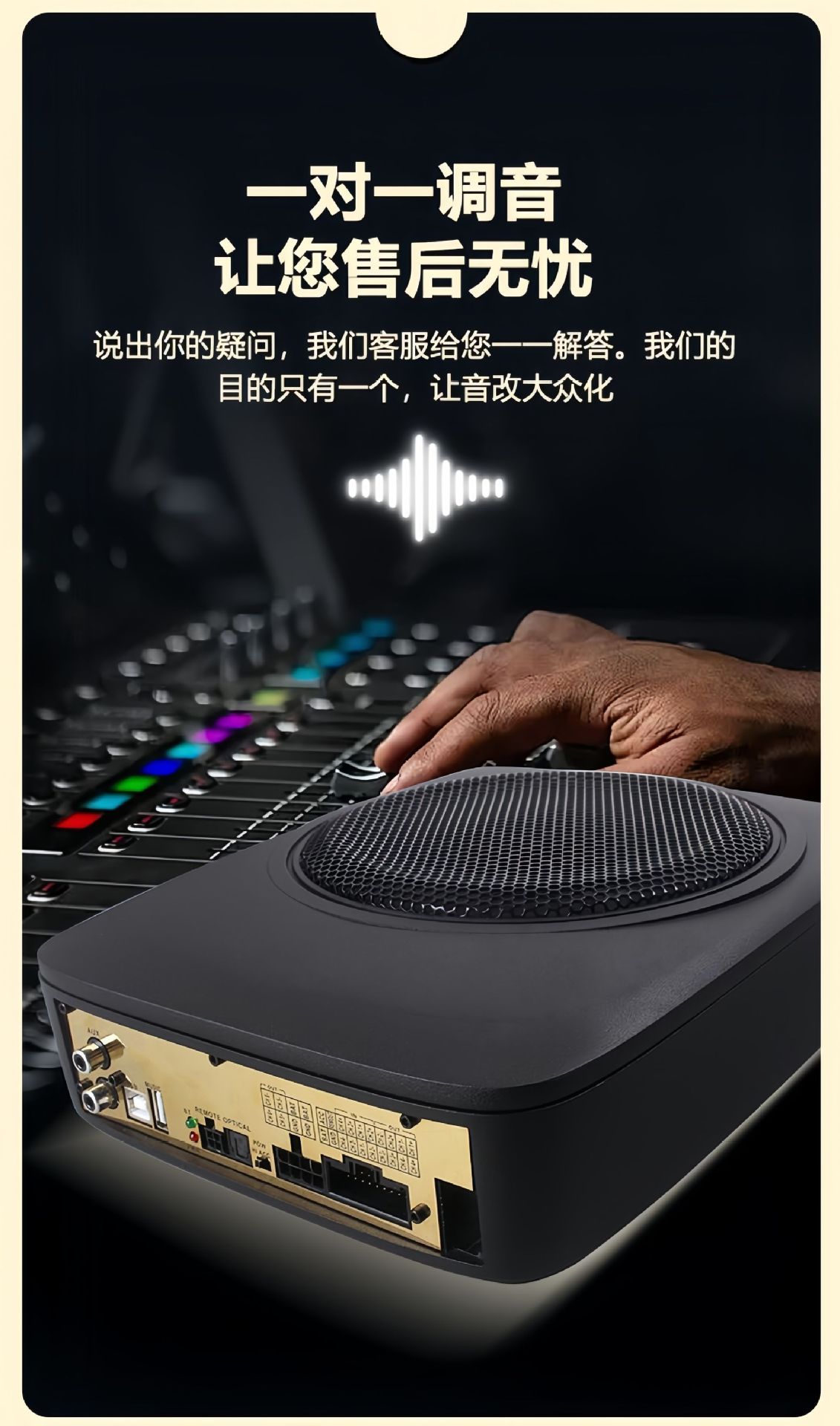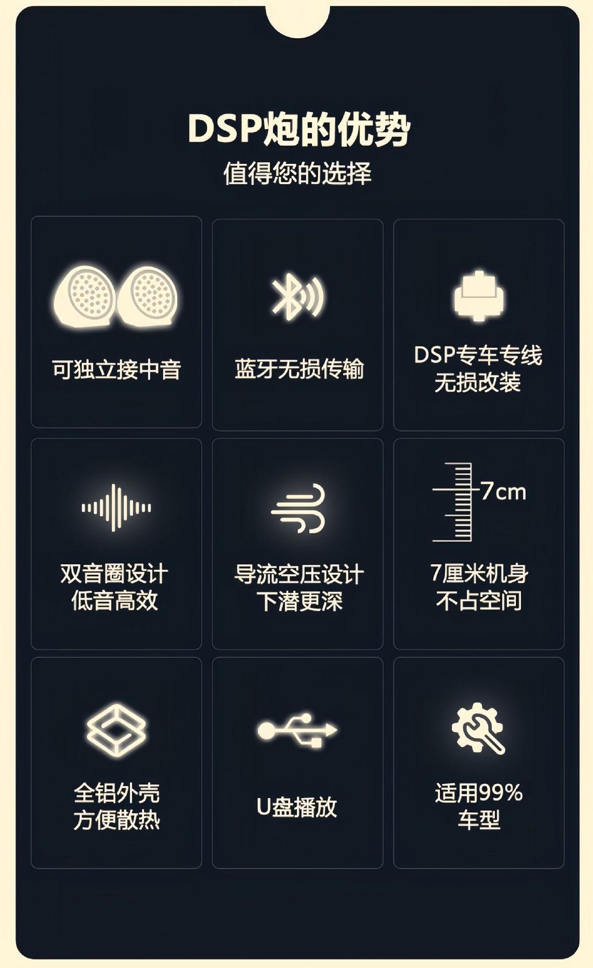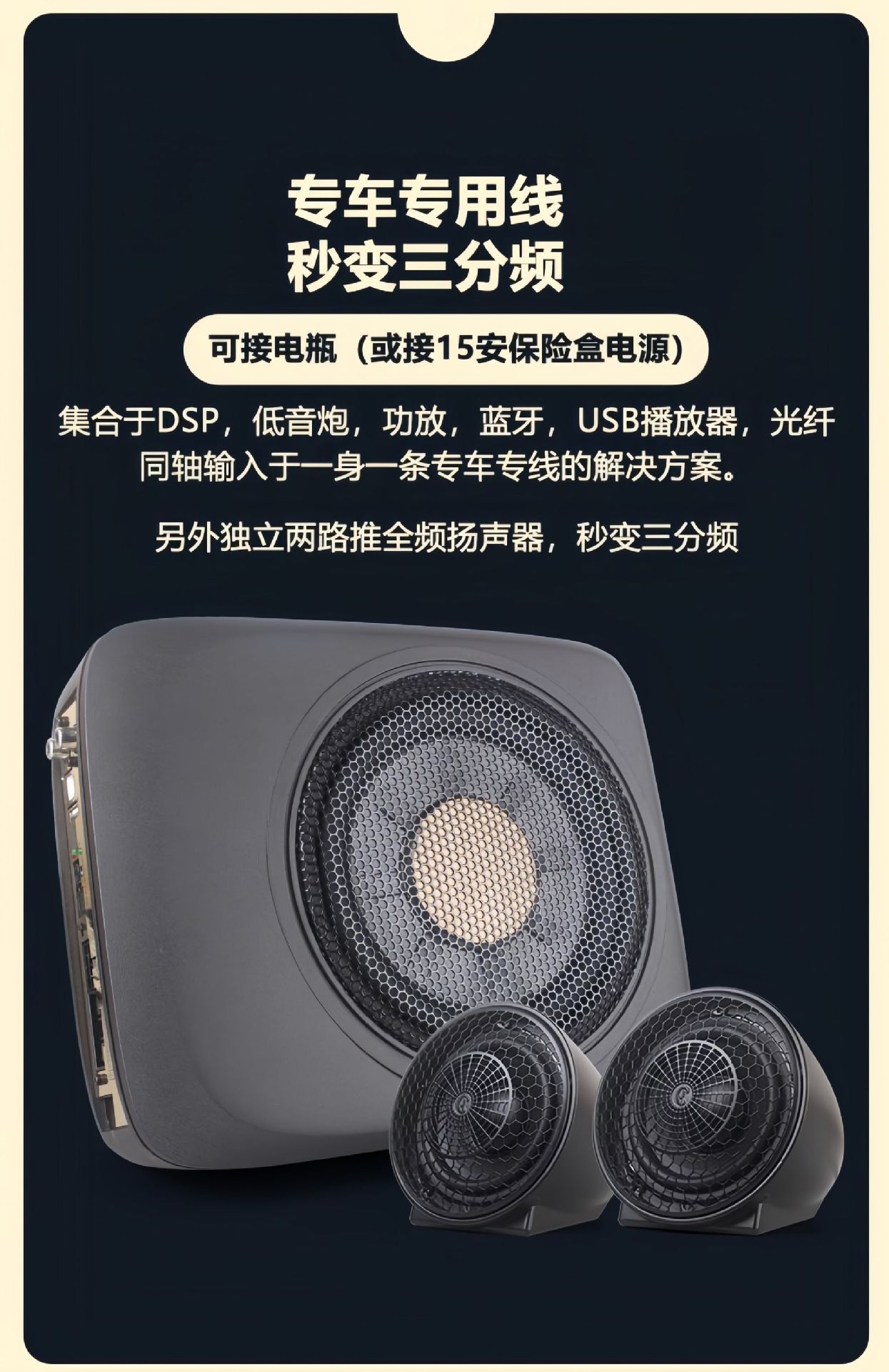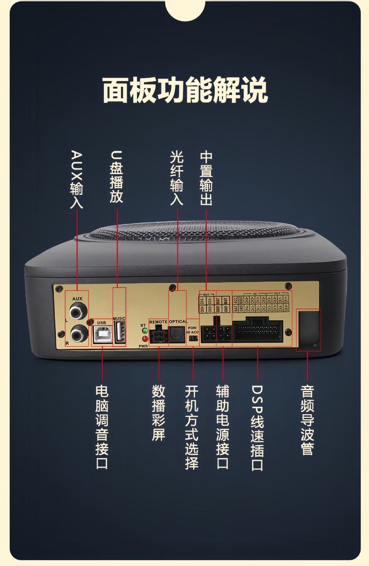 本产品是DSP功放一体的设备,产品自带6路功放,可以接中置喇叭和推4门喇叭,同时支持31段手机电脑调音,自带数播,可以选配显示屏,显示屏100元一个