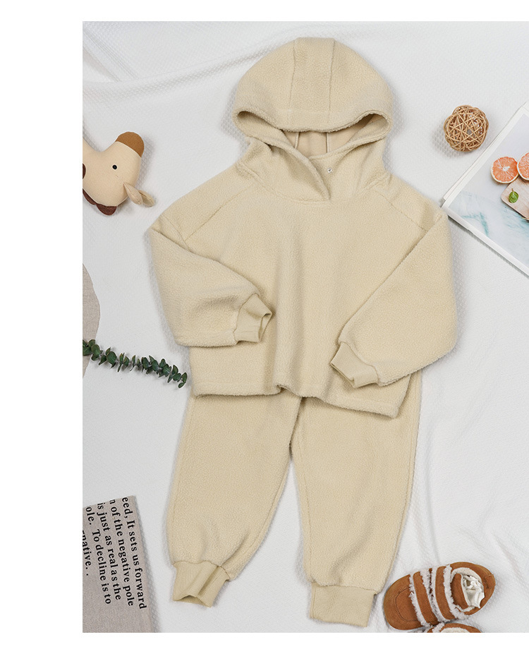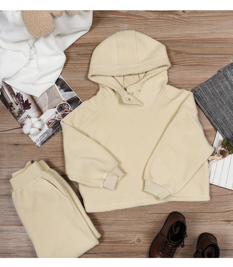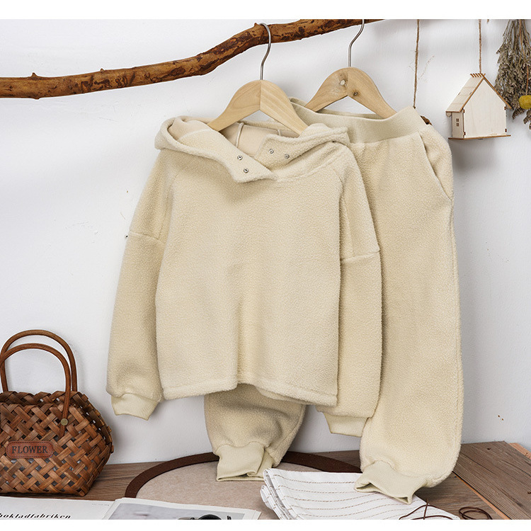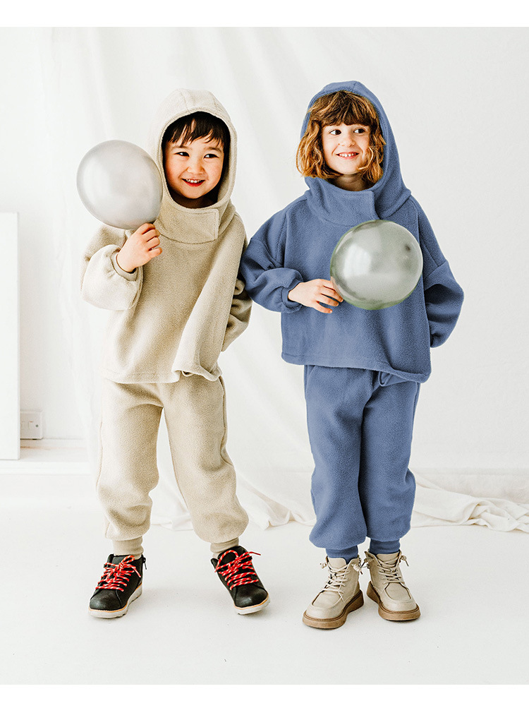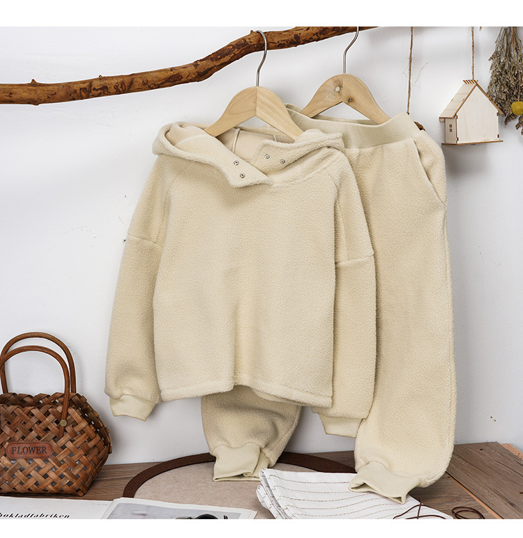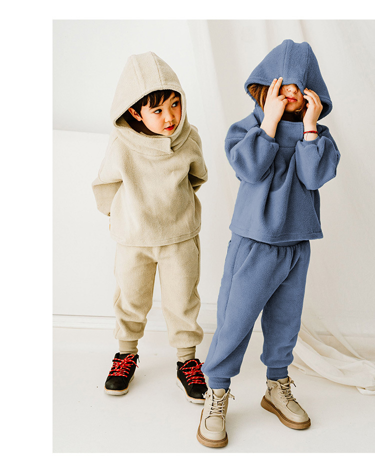 세트 양털 아기 소년과 소녀 가을과 겨울 따뜻한 단색 아동복 스카프 스냅 버튼 후드 풀오버 스웨터 투피스 세트