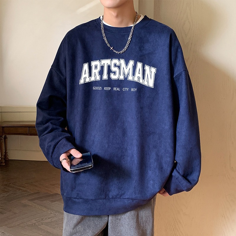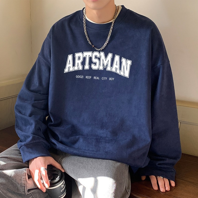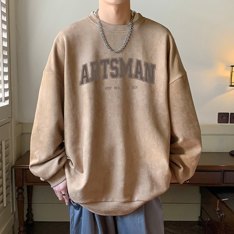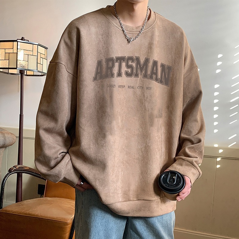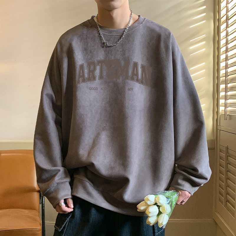 스웨이드 스웨터 남자의 봄과 가을 무거운 느슨한 플러스 사이즈 옷 소년 둥근 목 긴 소매베이스 셔츠스토어 가기