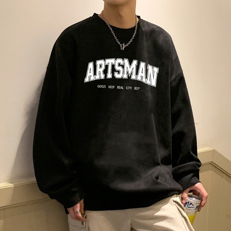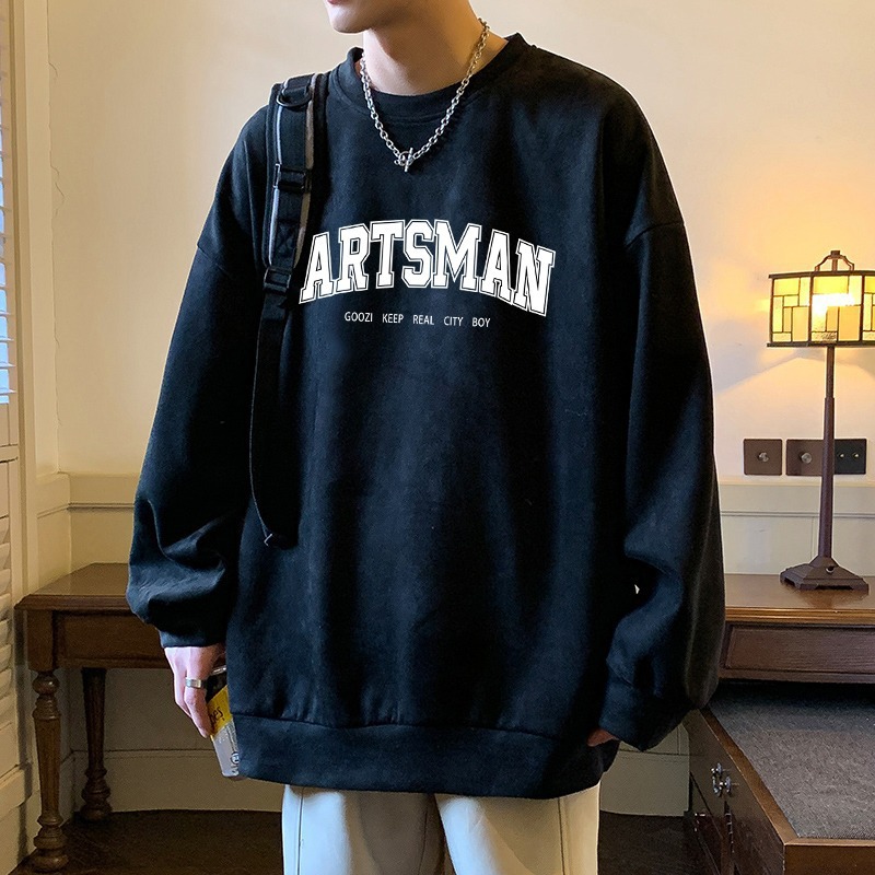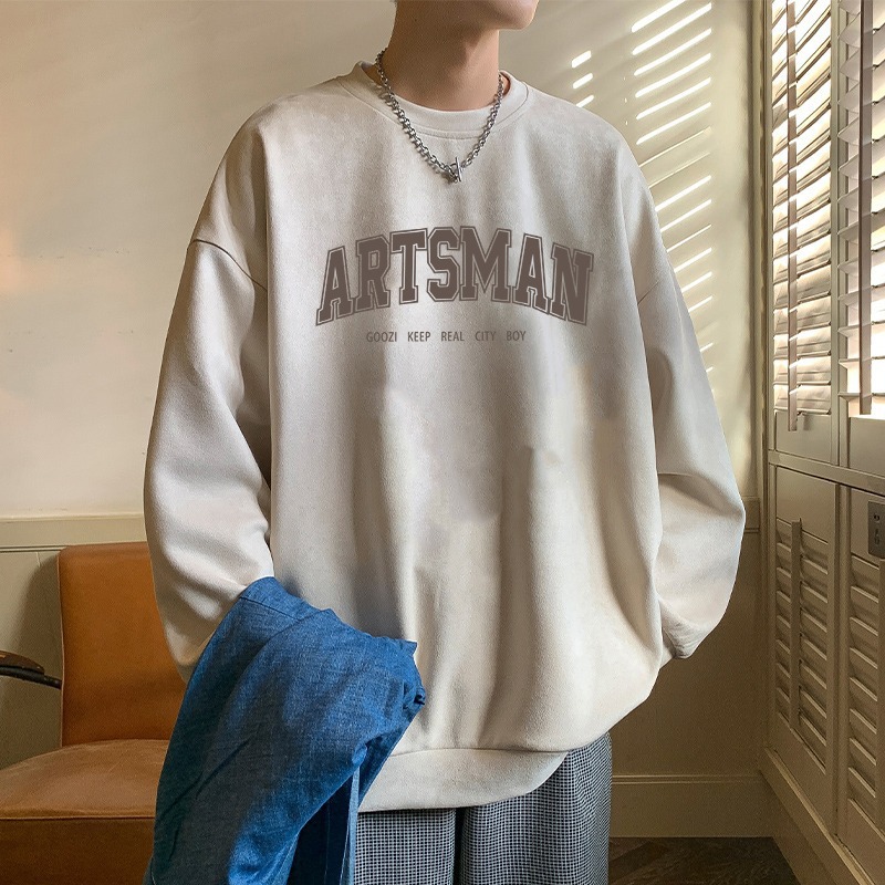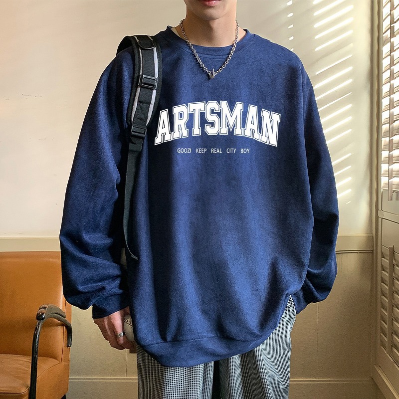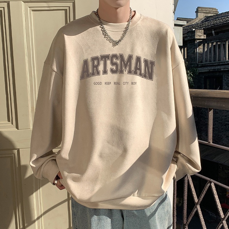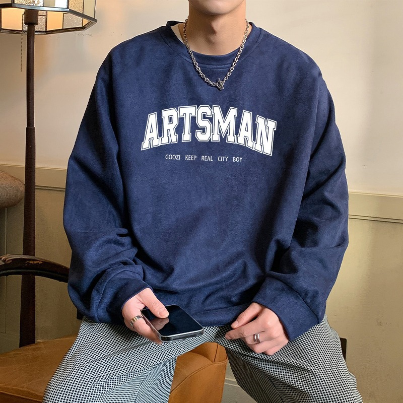 스웨이드 스웨터 남자의 봄과 가을 무거운 느슨한 플러스 사이즈 옷 소년 둥근 목 긴 소매베이스 셔츠스토어 가기