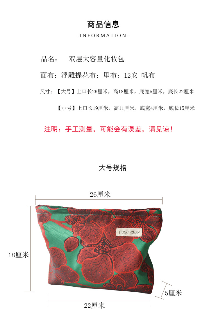 大号:长26厘米,高18厘米,底宽5厘米;小号:长19厘米,高11厘米,底宽4厘米。