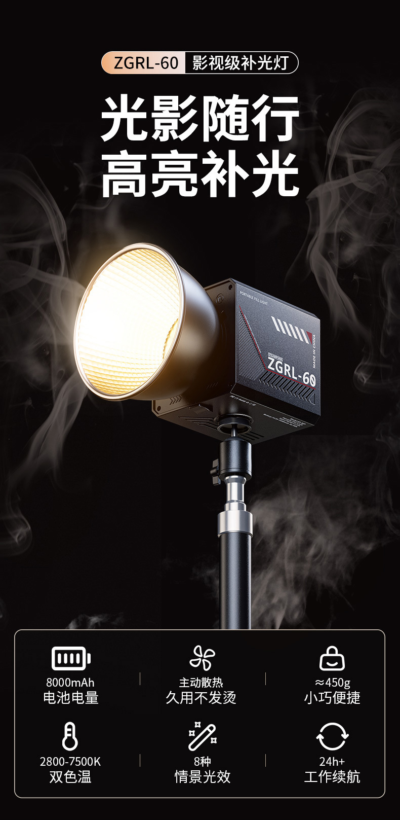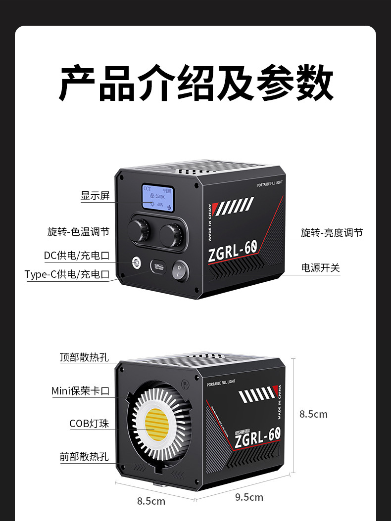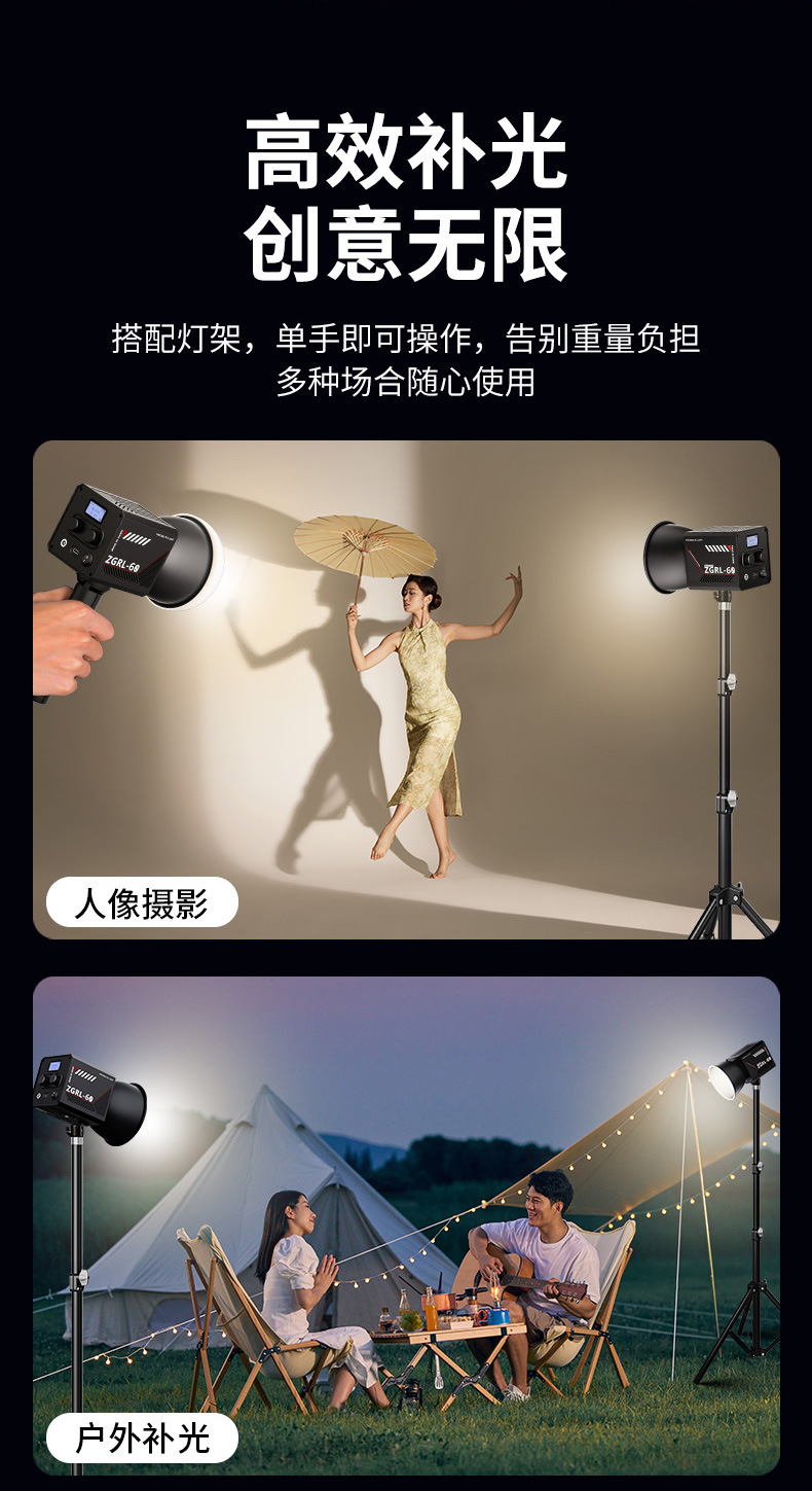 60W 휴대용 외부 촬영 램프 COB 고출력 채우기 조명 사진 램프 전문 비디오 촬영 무대 라이브 채우기 조명