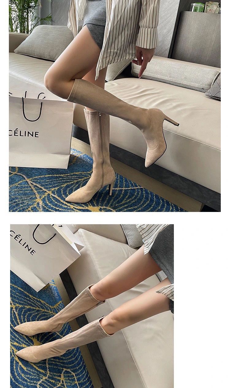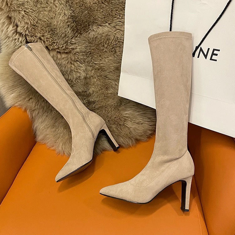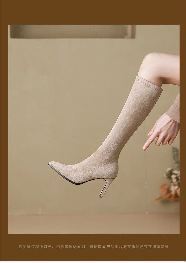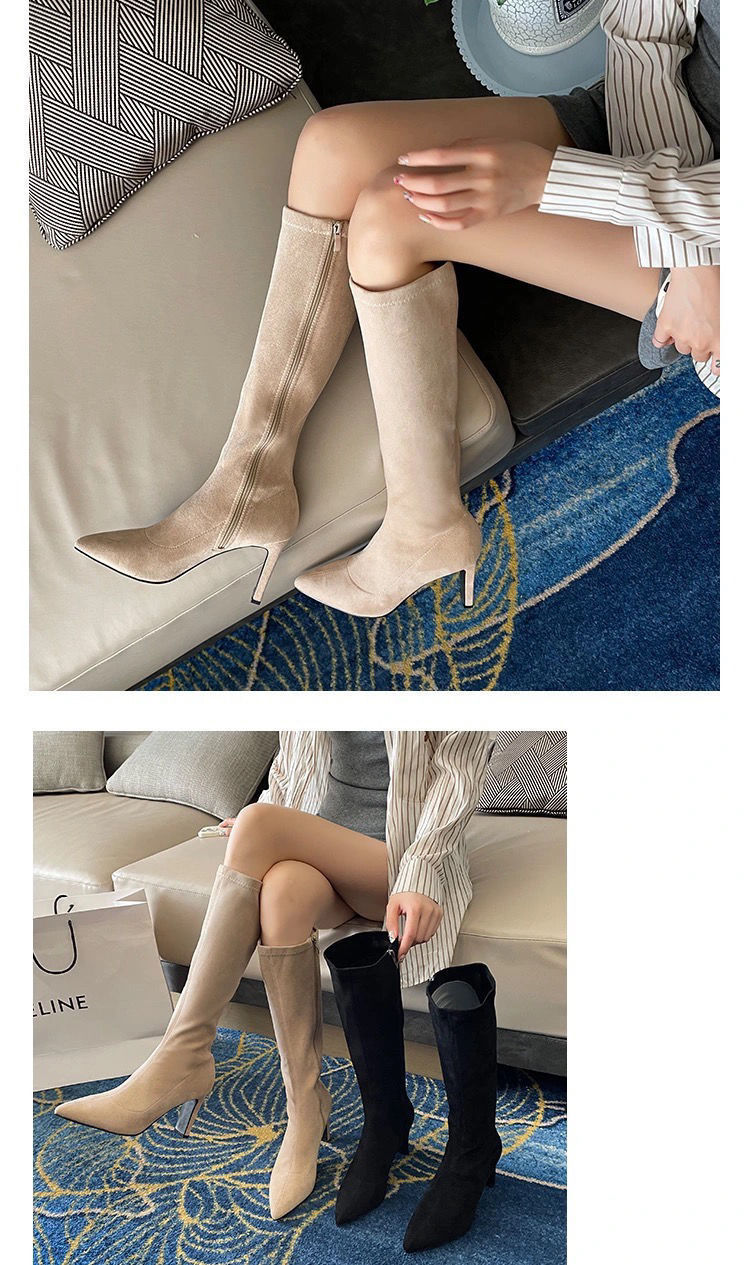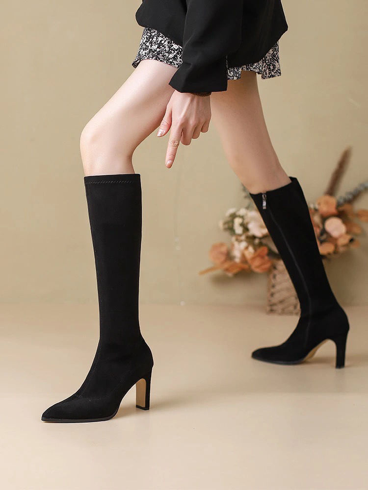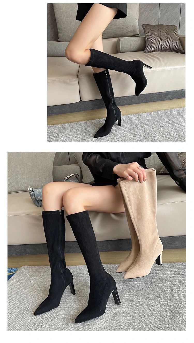 스키니 스웨이드 부츠 스트레치 얇은 부츠 하이 힐 오버 더-무릎 포인팅 부츠 두꺼운 힐 부츠 여자 겨울 2024