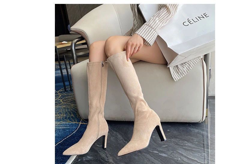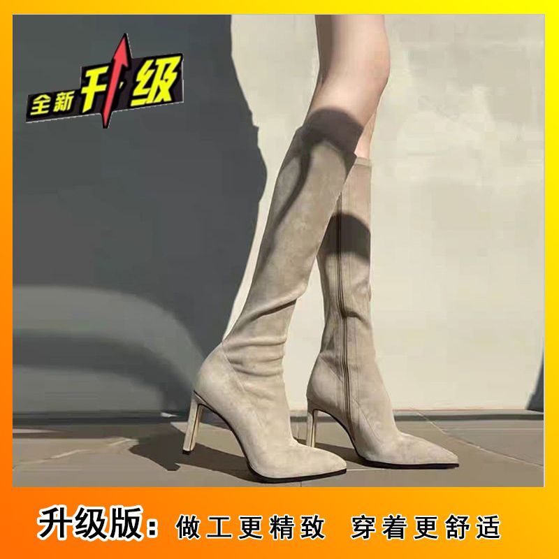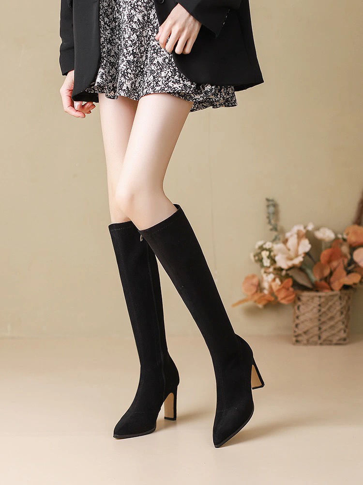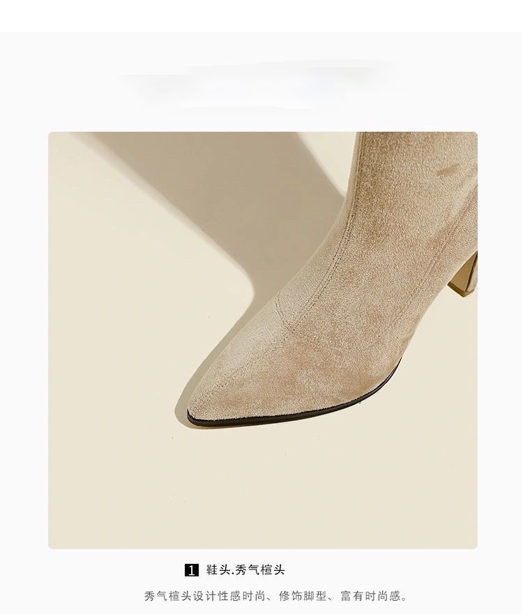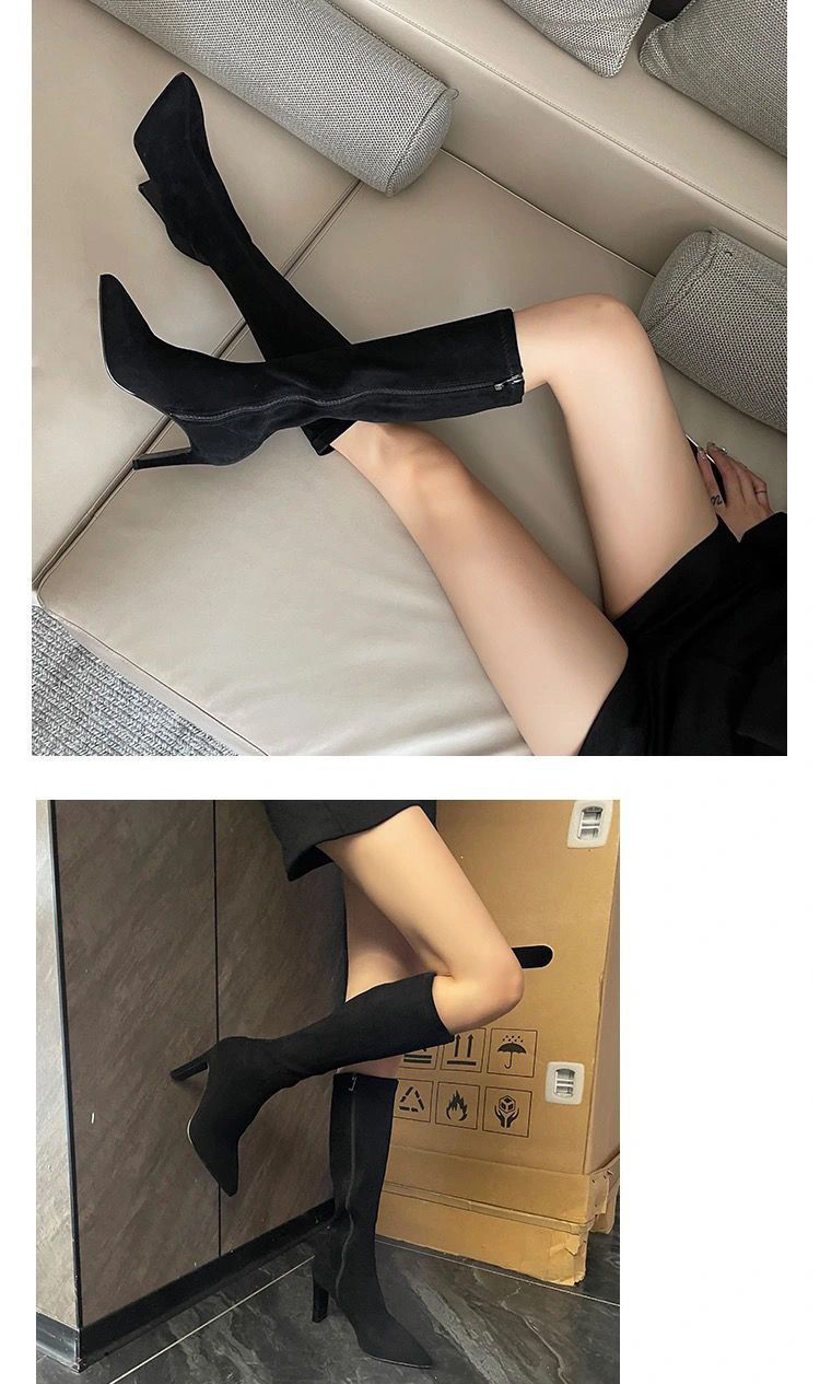 스키니 스웨이드 부츠 스트레치 얇은 부츠 하이 힐 오버 더-무릎 포인팅 부츠 두꺼운 힐 부츠 여자 겨울 2024스토어 가기
