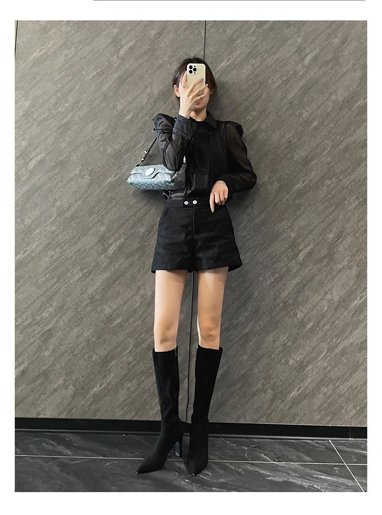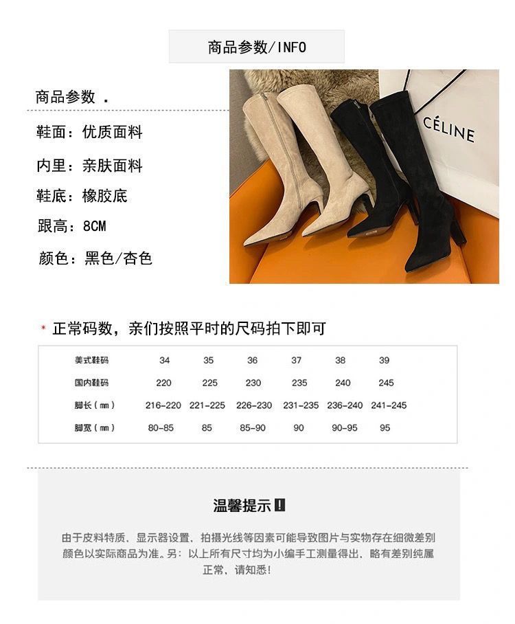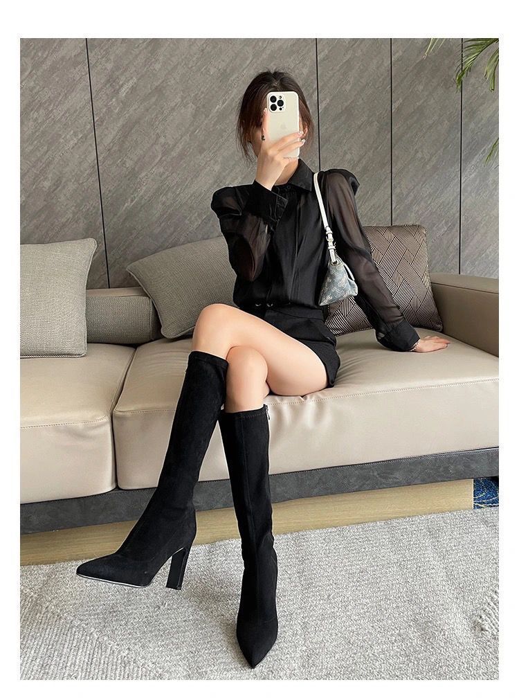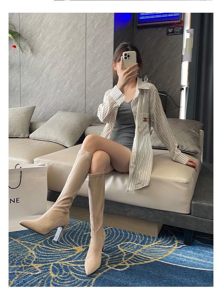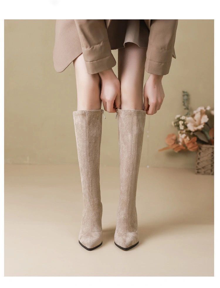 스키니 스웨이드 부츠 스트레치 얇은 부츠 하이 힐 오버 더-무릎 포인팅 부츠 두꺼운 힐 부츠 여자 겨울 2024스토어 가기