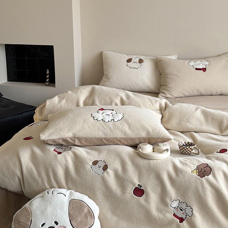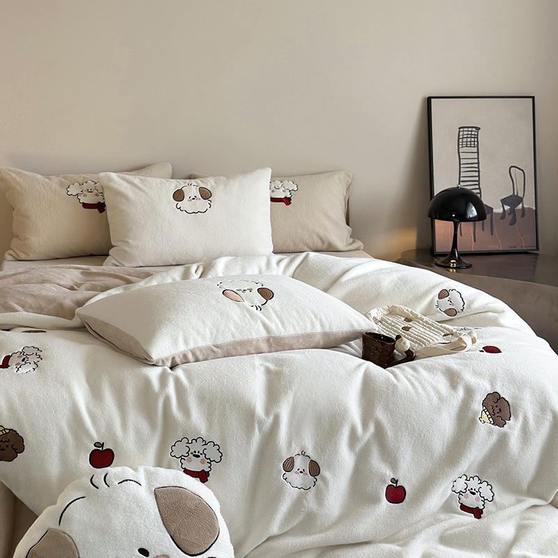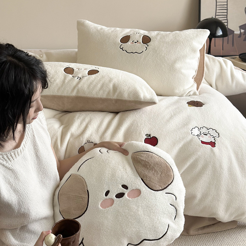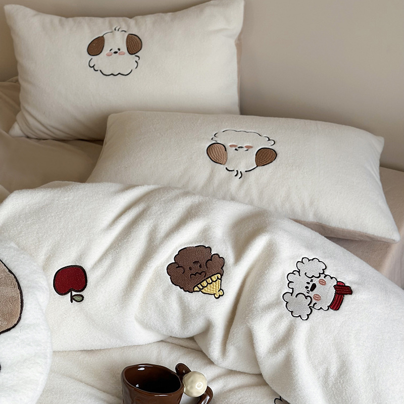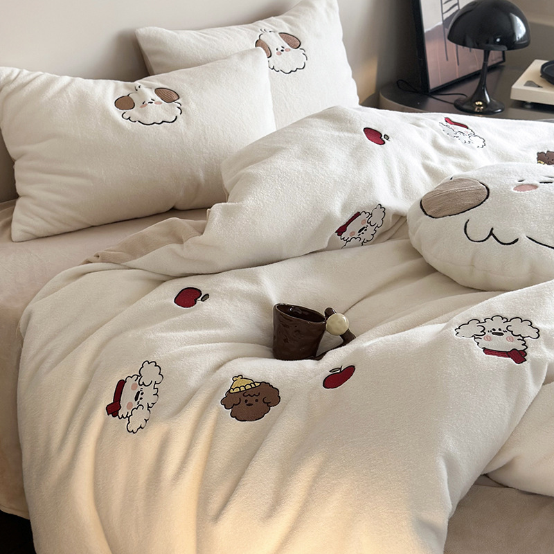 귀여운 따뜻한 모방 양 플러시 자수 우유 양털 4 피스 세트 만화 산호 양털 3 피스 세트 두꺼운 겨울 침구스토어 가기