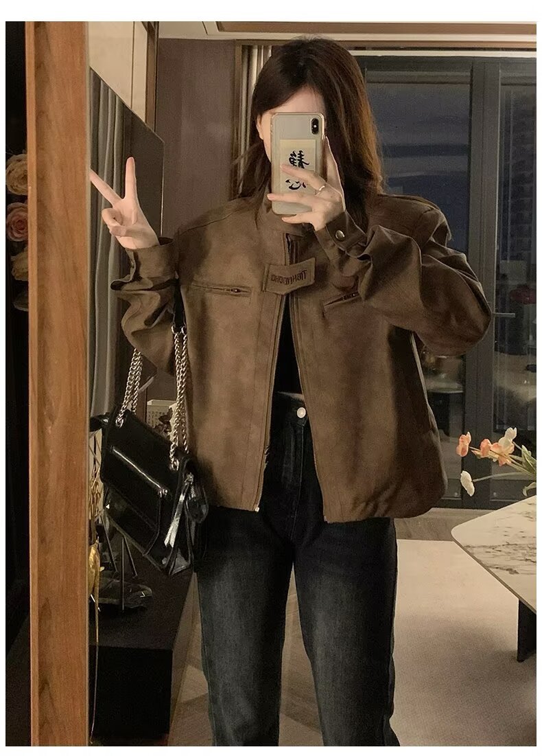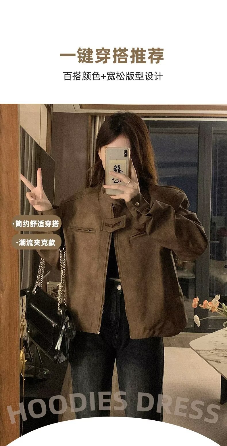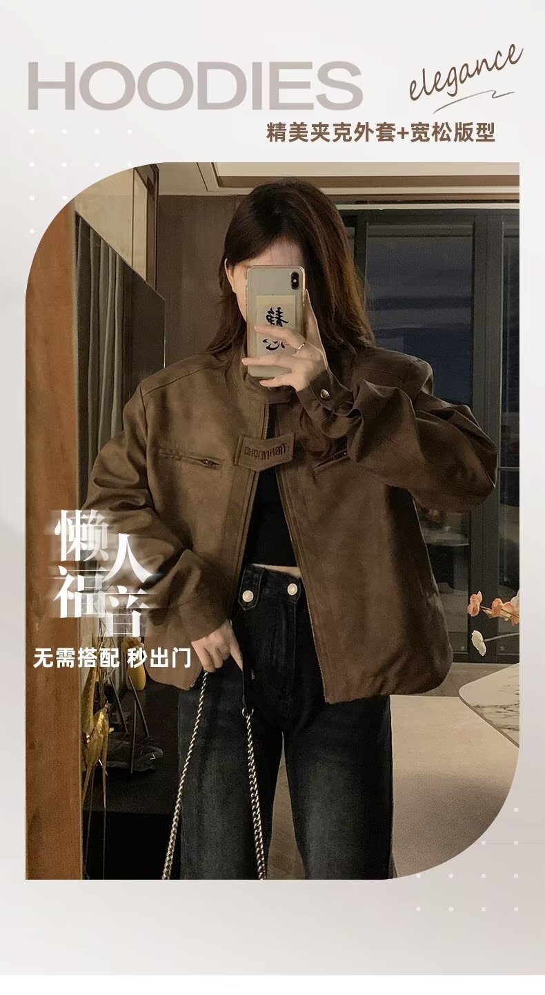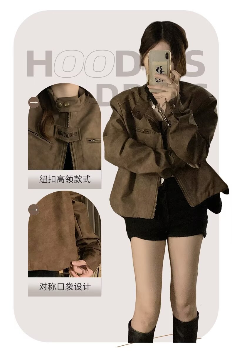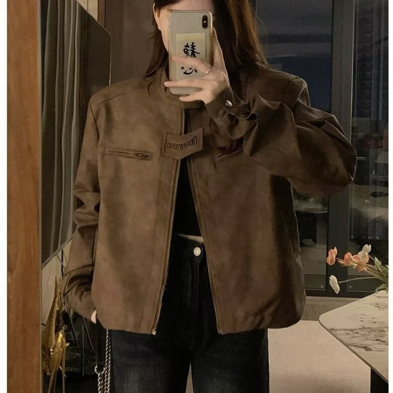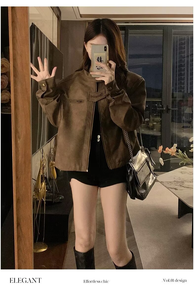 아메리칸 스타일 하이 스트리트 빈티지 다크 브라운 바이커 스웨이드 재킷 여성 가을 짧은 마일러 칼라 유행 올드 재킷스토어 가기