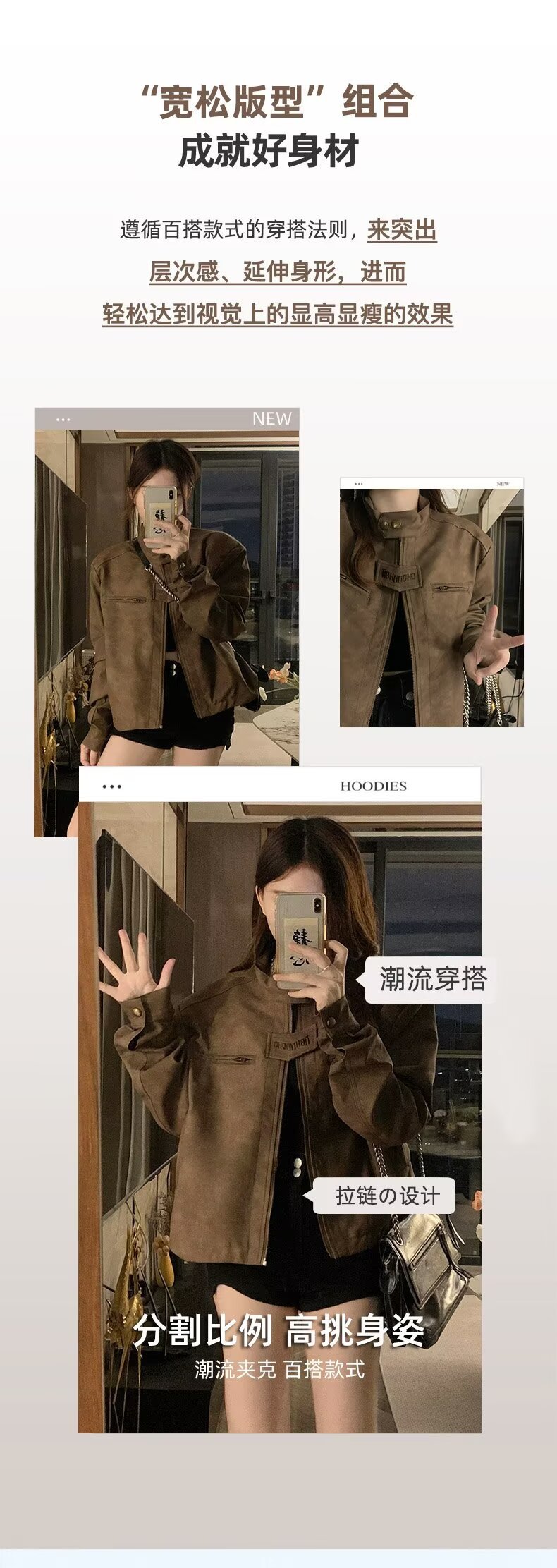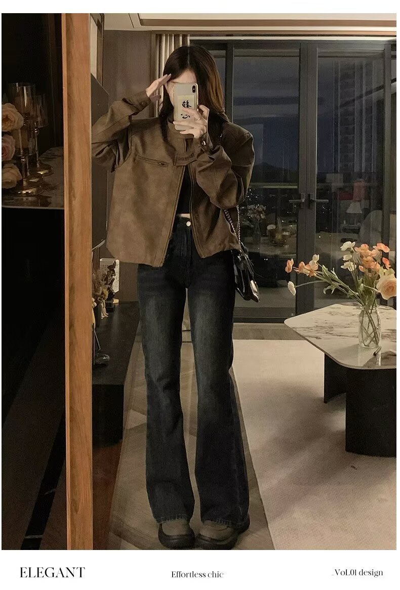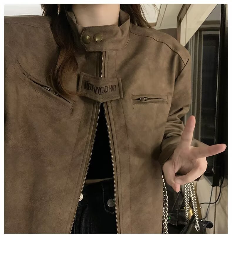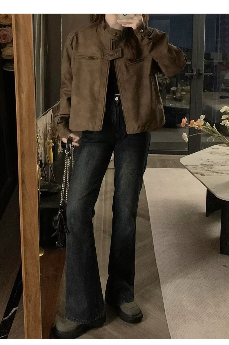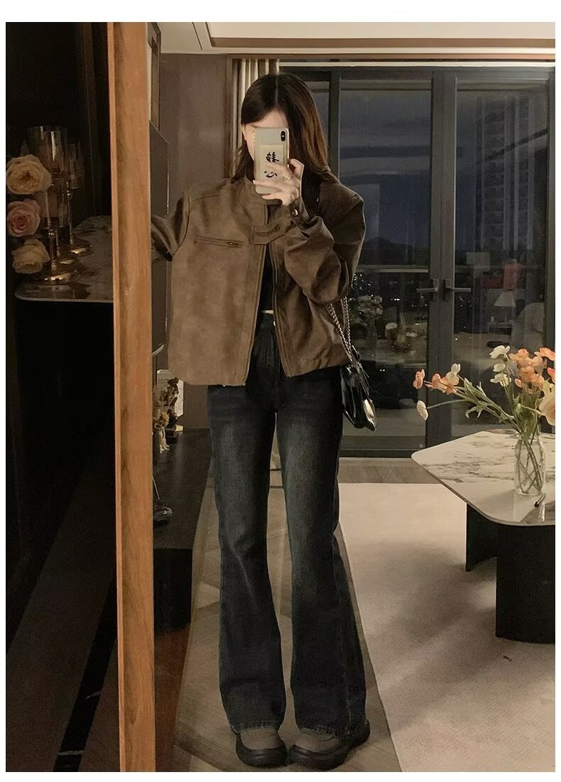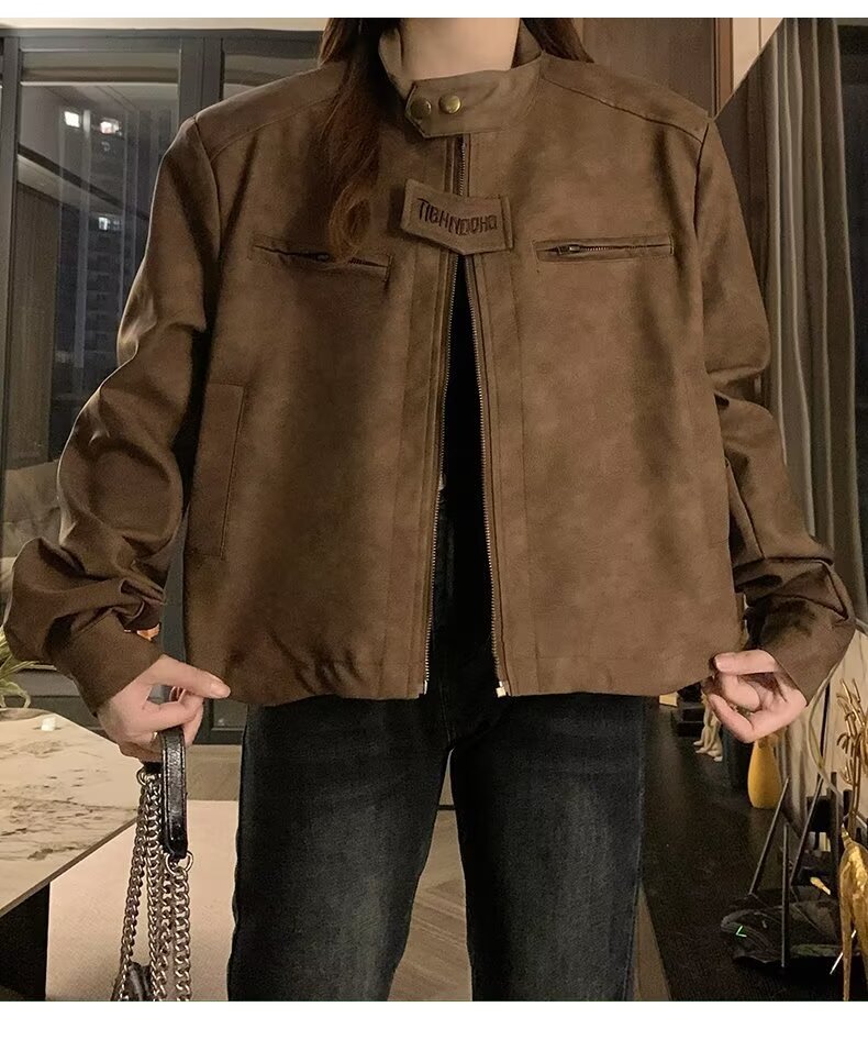 아메리칸 스타일 하이 스트리트 빈티지 다크 브라운 바이커 스웨이드 재킷 여성 가을 짧은 마일러 칼라 유행 올드 재킷스토어 가기