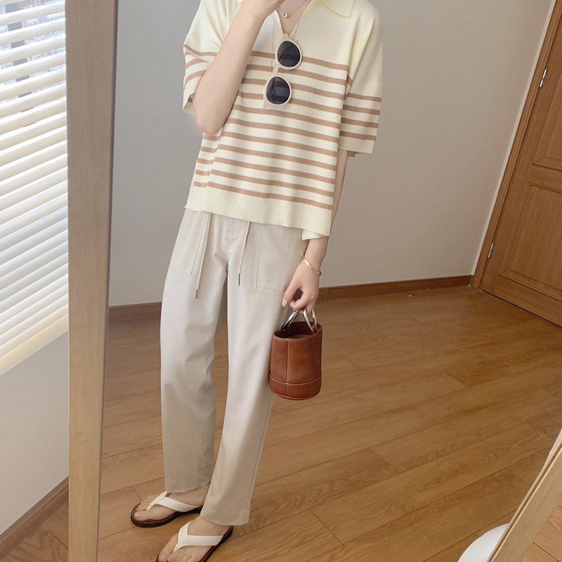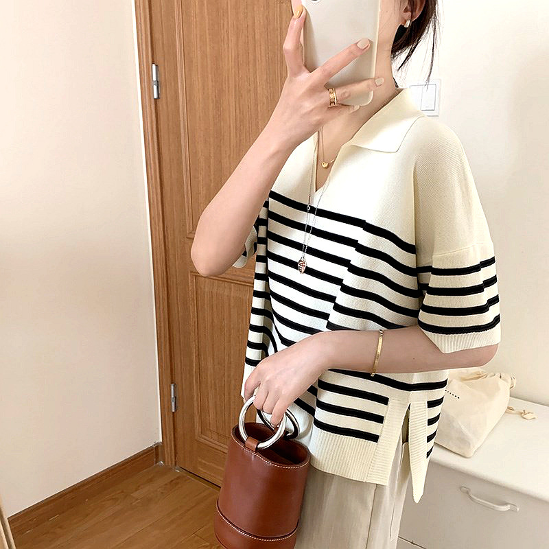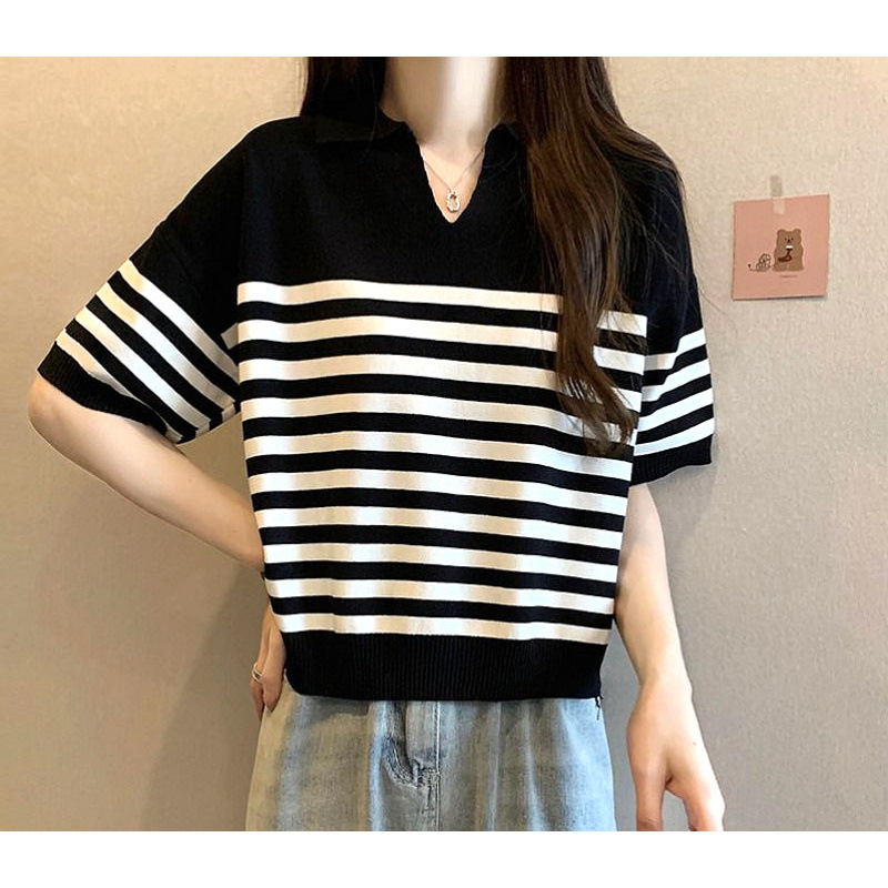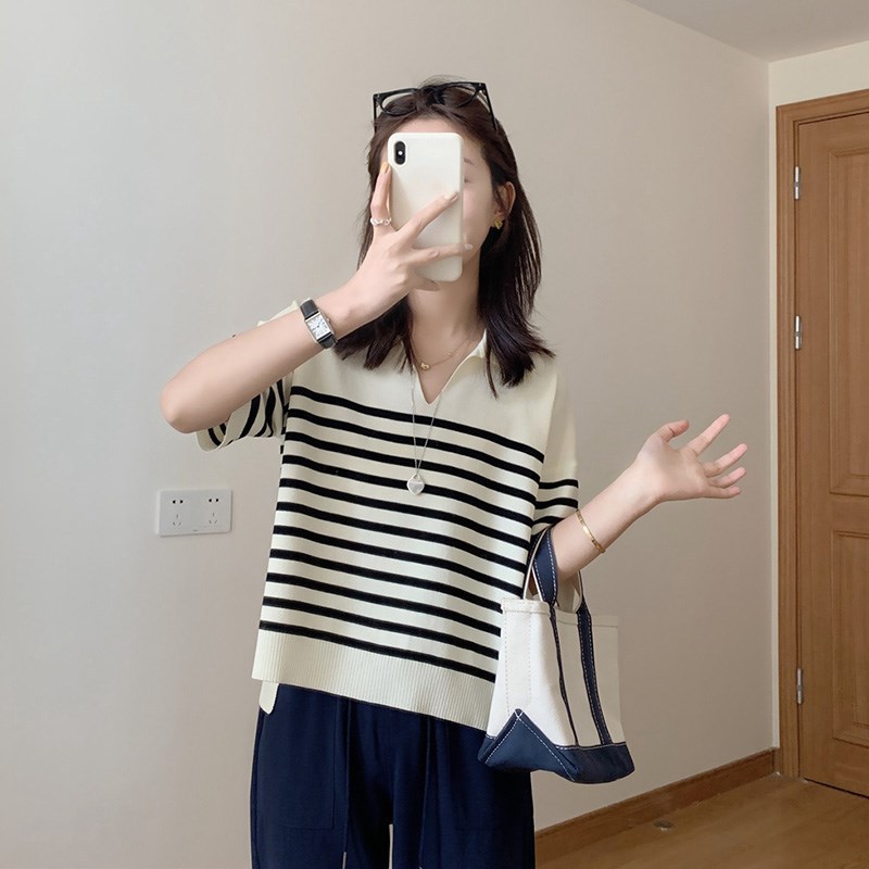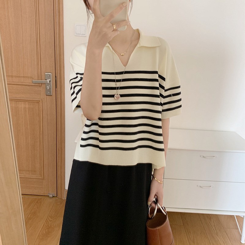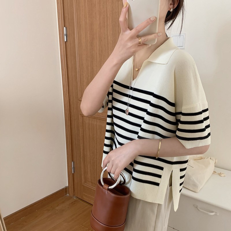 2023 새로운 폴로 칼라 스트라이프 루즈 반팔 니트 티셔츠 여성 여름 디자인 센스 니쉬 탑 트렌디스토어 가기