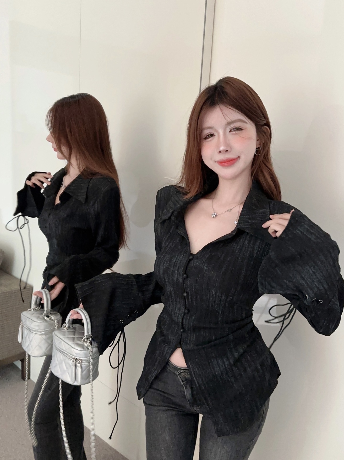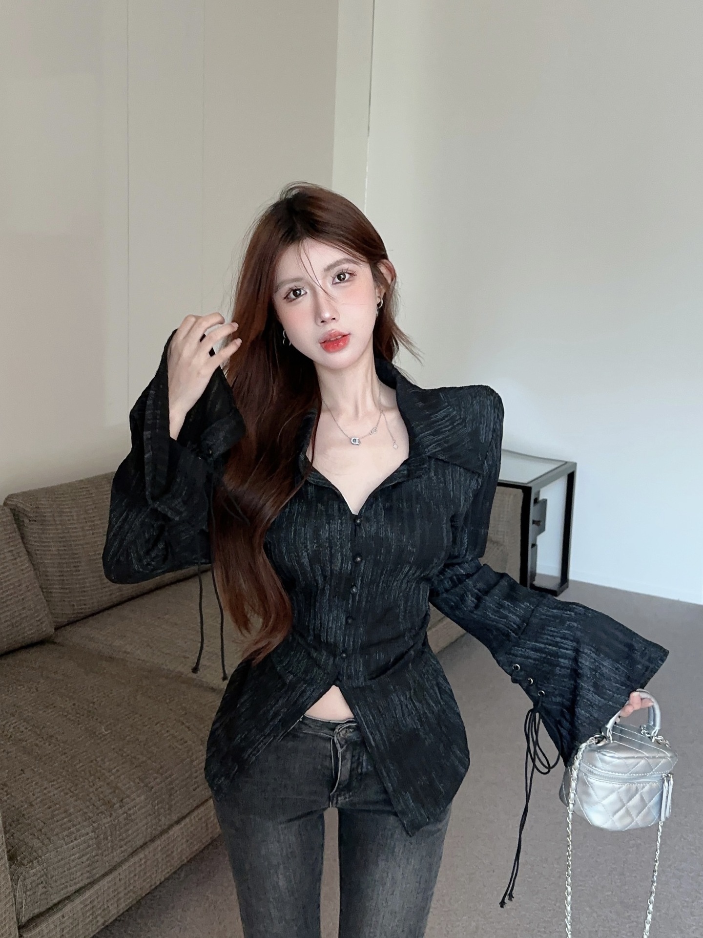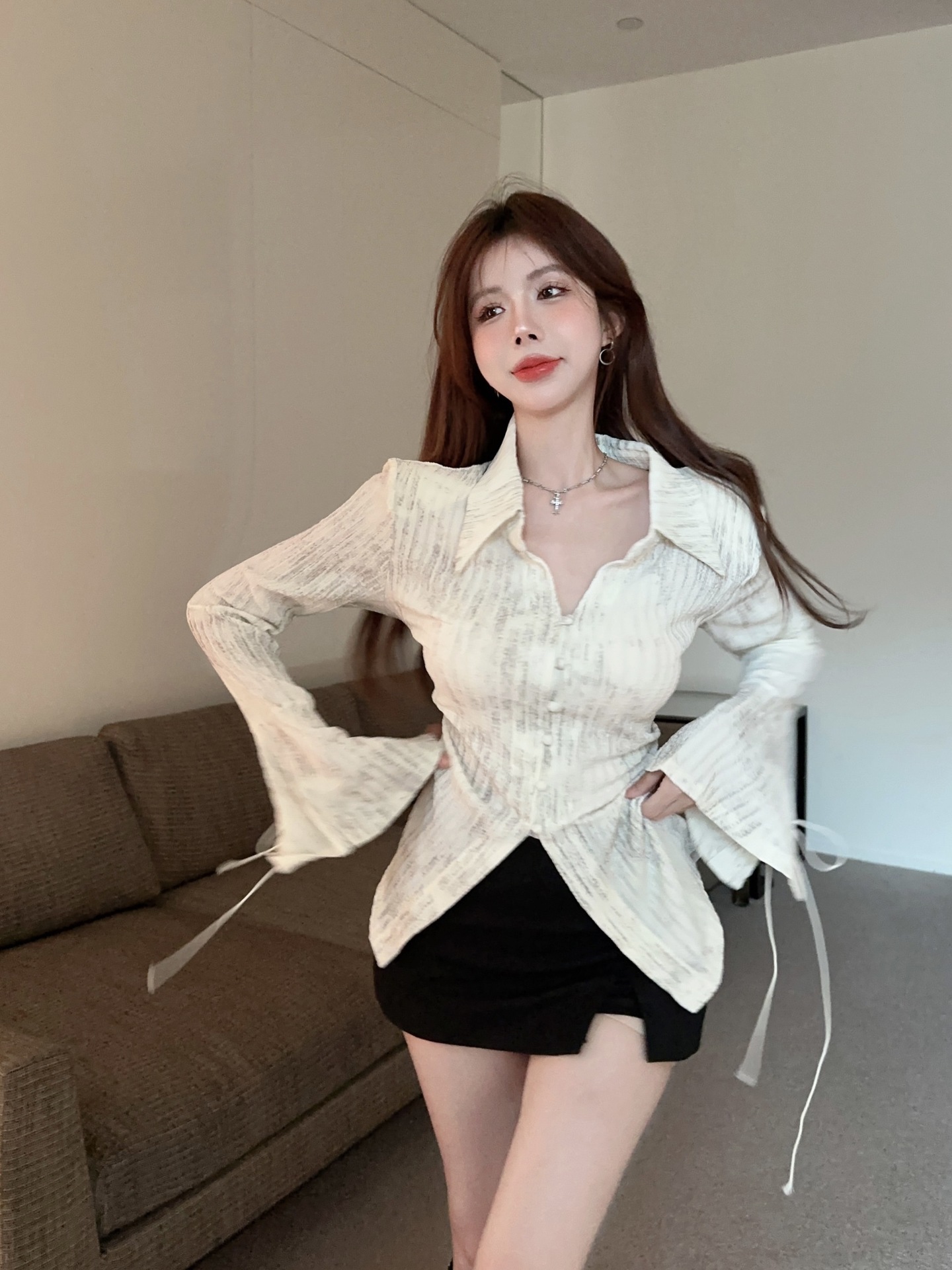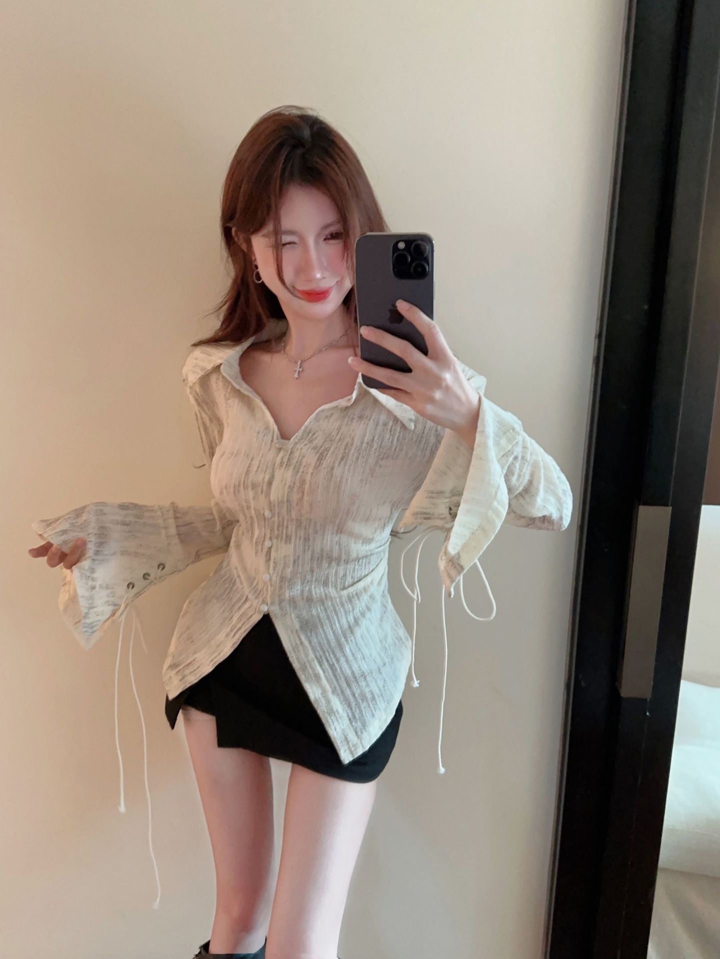 미국 넥타이 염색 V 넥 셔츠 여성의 봄과 가을 새로운 디자인 센스 레이스 업 경적 슬리브 타이트 허리 셔츠 순수한 소원 옷스토어 가기