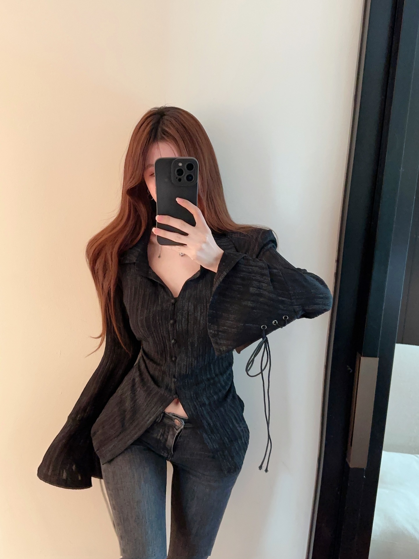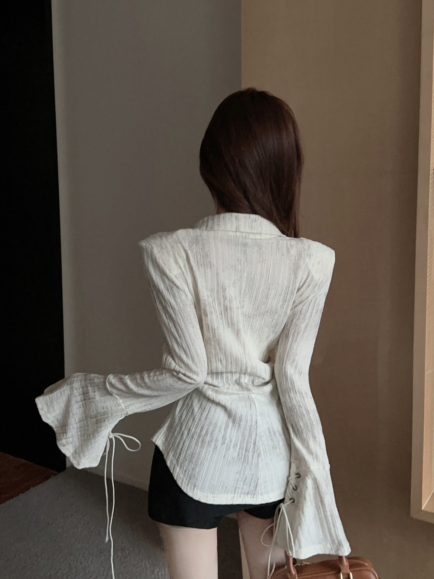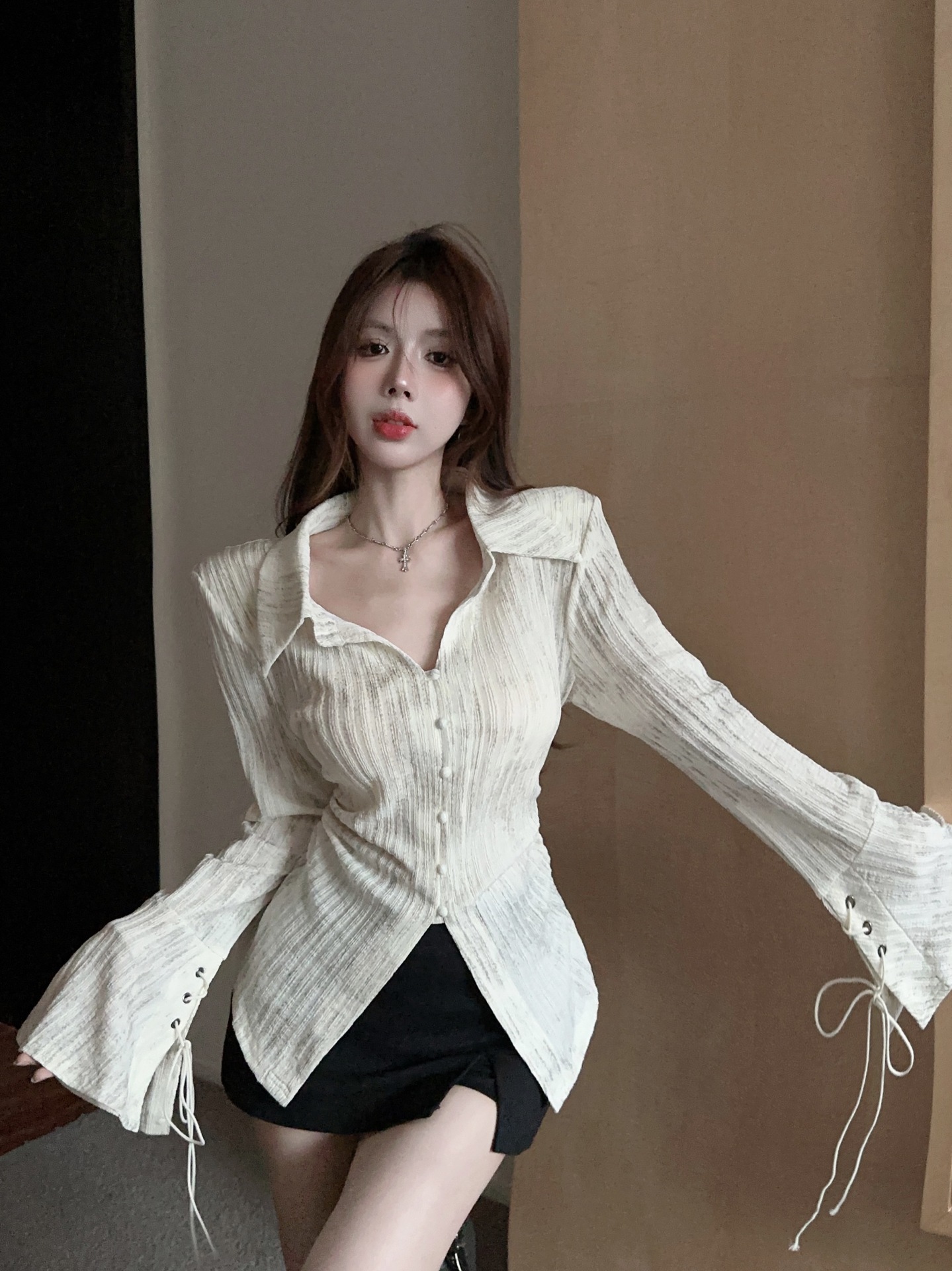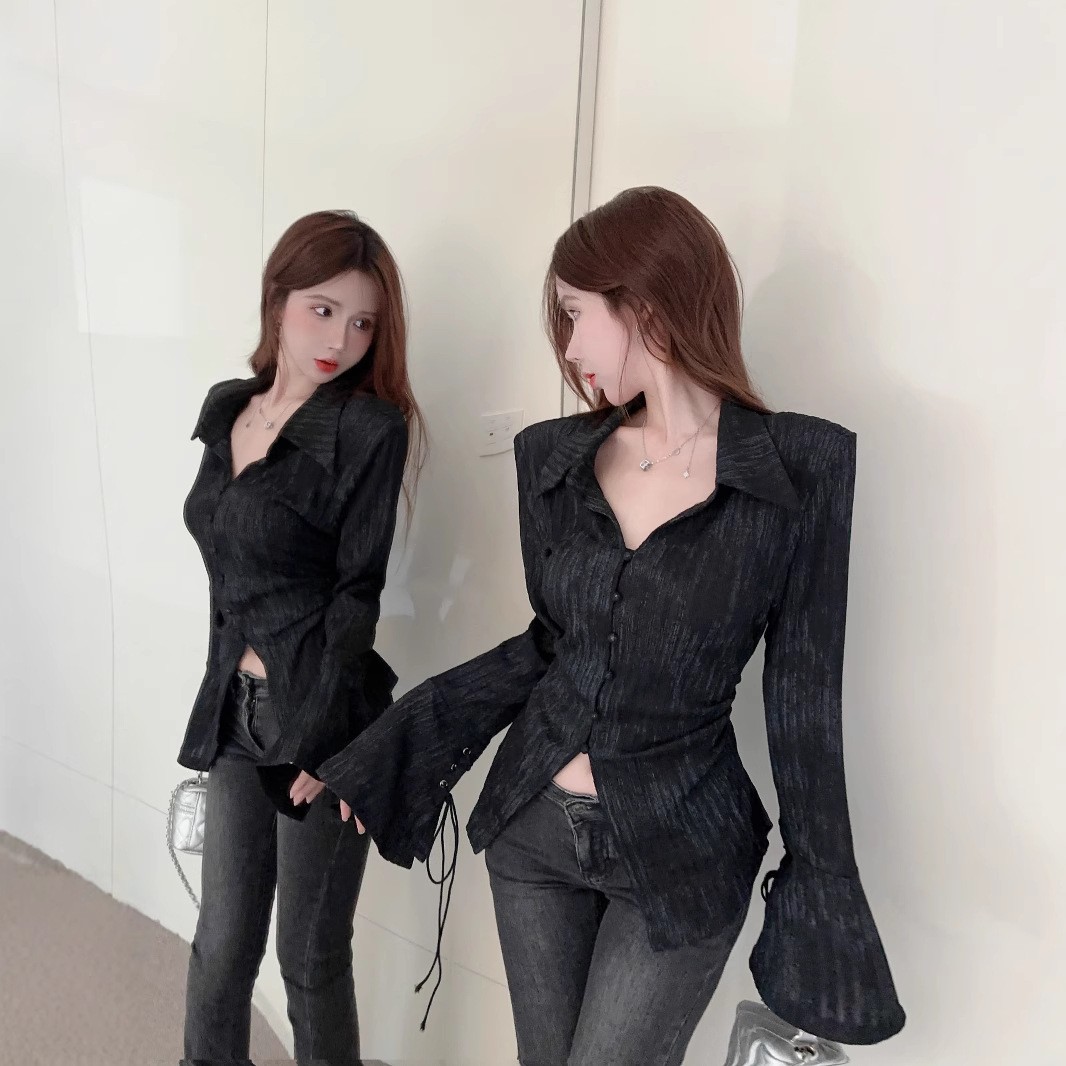 미국 넥타이 염색 V 넥 셔츠 여성의 봄과 가을 새로운 디자인 센스 레이스 업 경적 슬리브 타이트 허리 셔츠 순수한 소원 옷스토어 가기