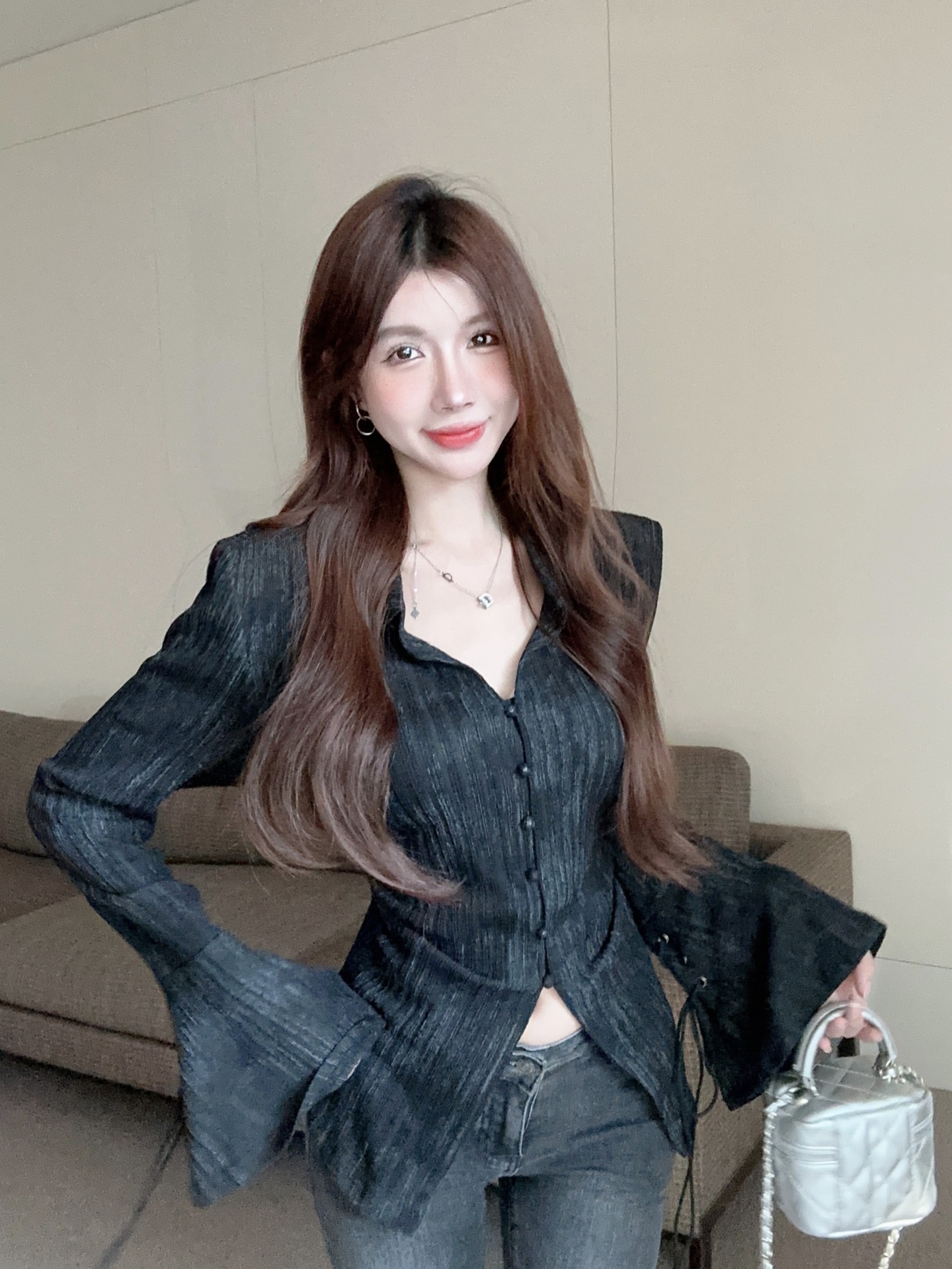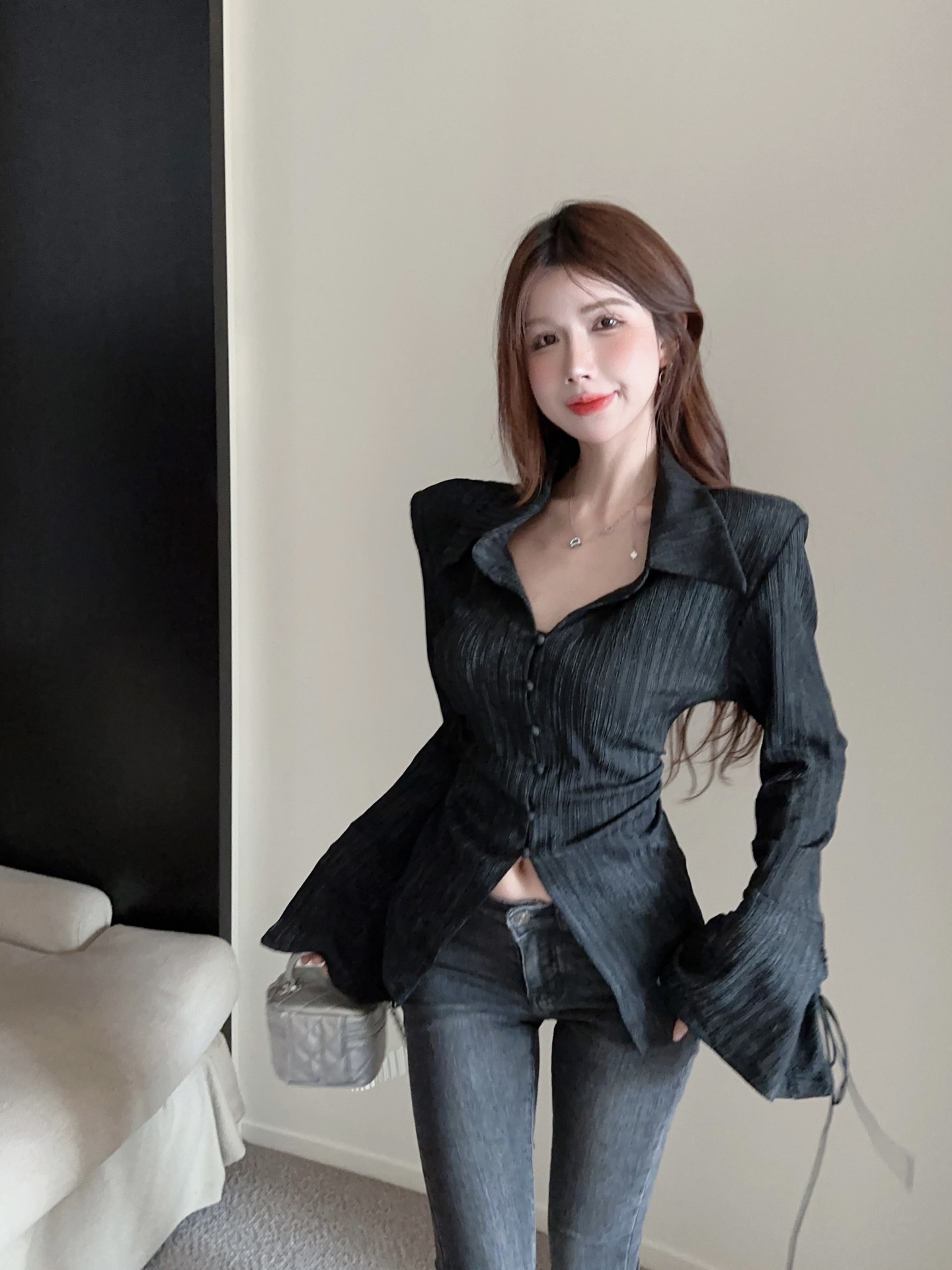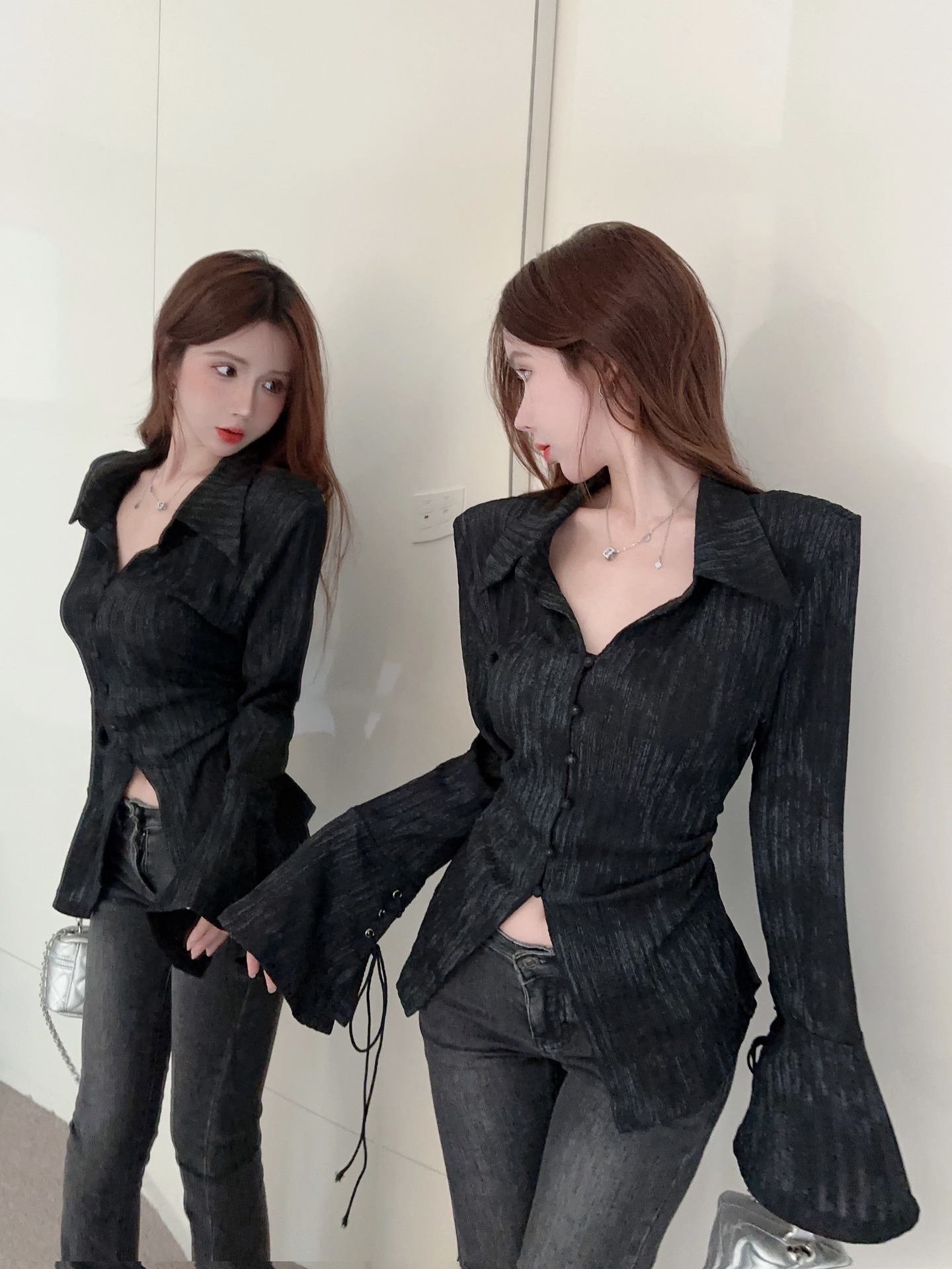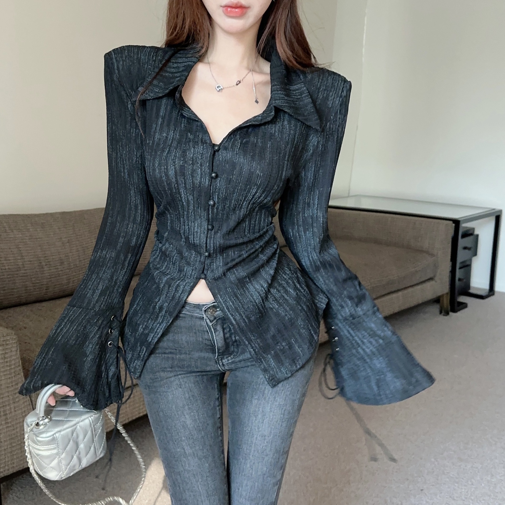 미국 넥타이 염색 V 넥 셔츠 여성의 봄과 가을 새로운 디자인 센스 레이스 업 경적 슬리브 타이트 허리 셔츠 순수한 소원 옷스토어 가기