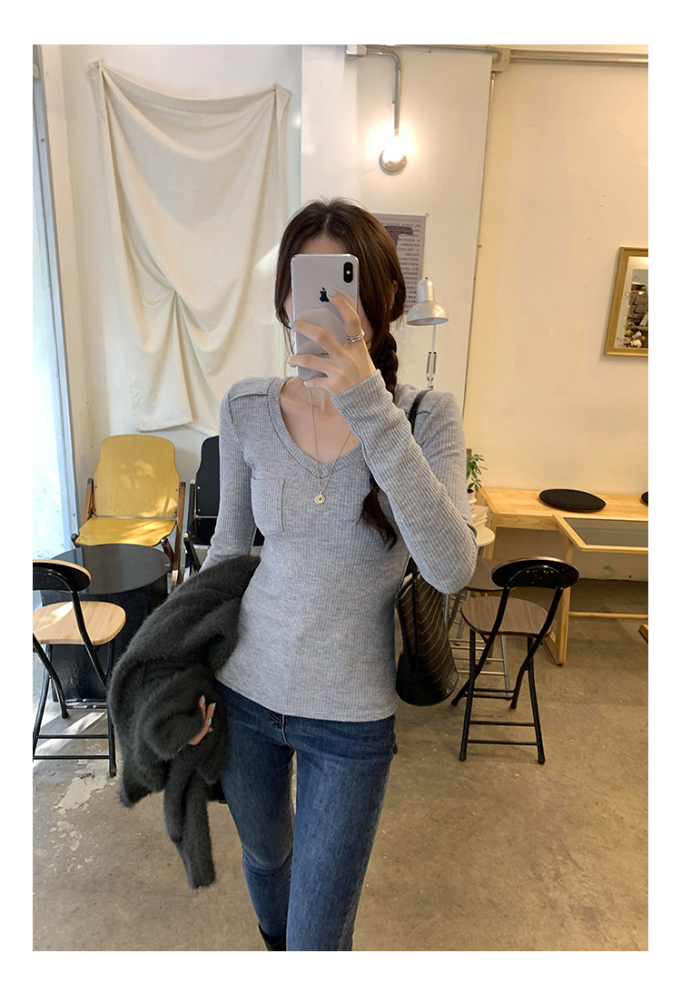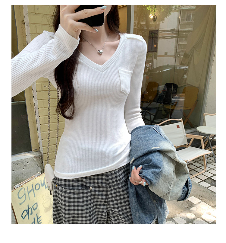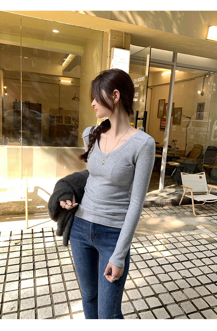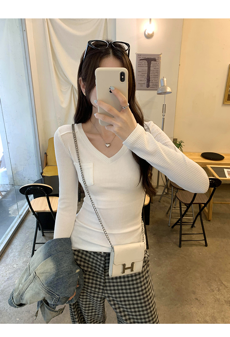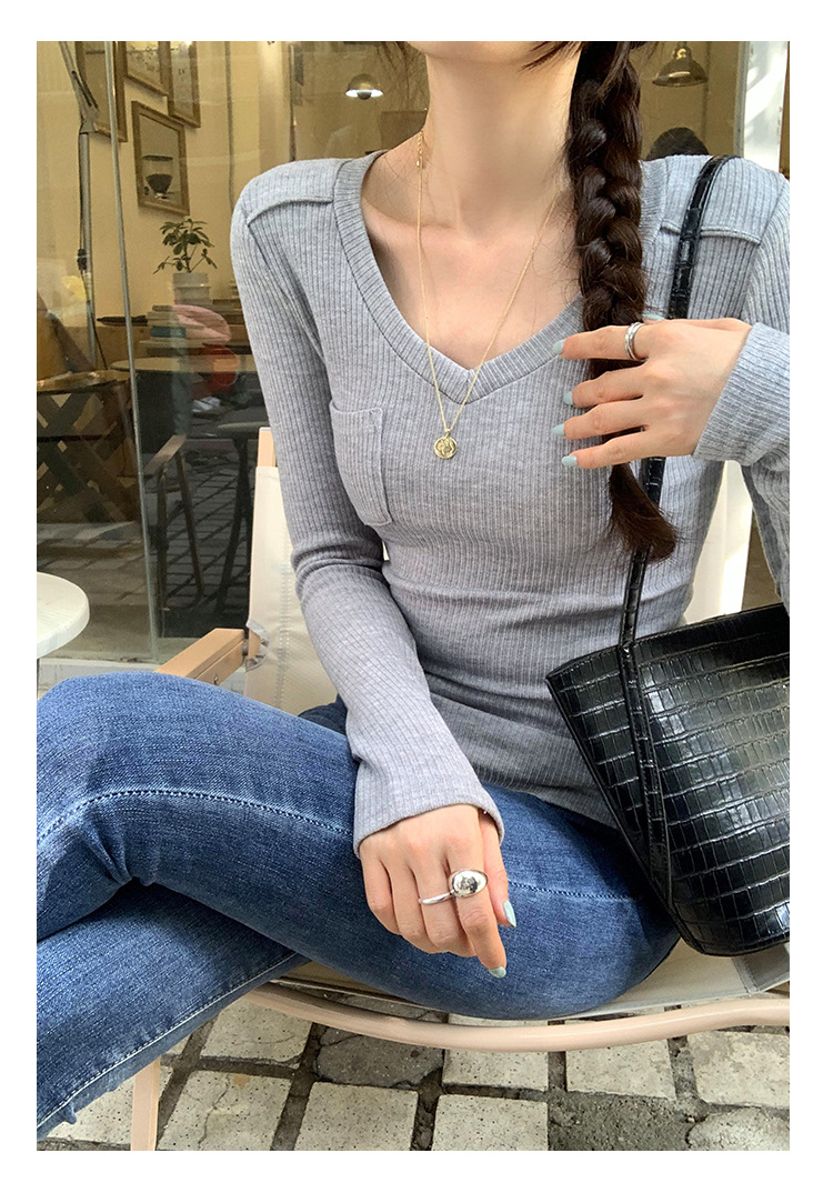 한국식 V 넥 포켓 슬림핏 슬리밍 탄성 니트 베이스 셔츠 여성의 2024 가을 및 겨울 새로운 긴팔 티셔츠 탑스토어 가기