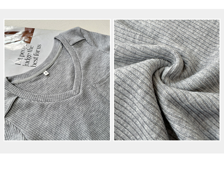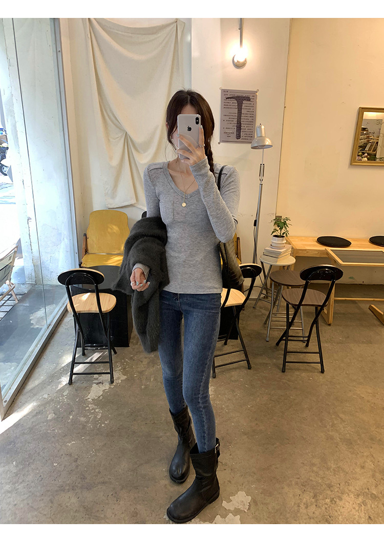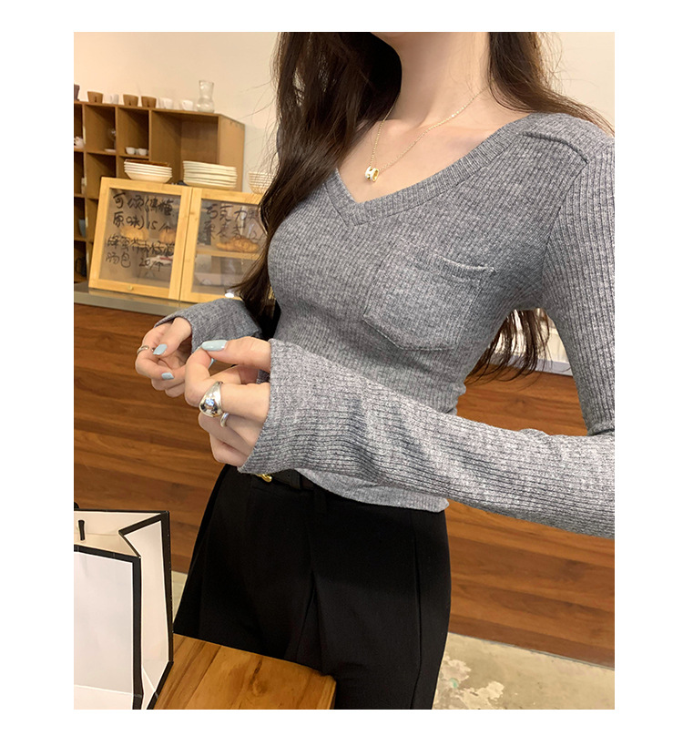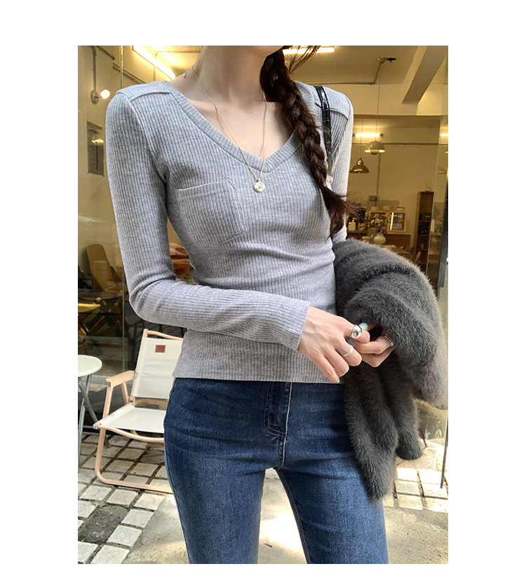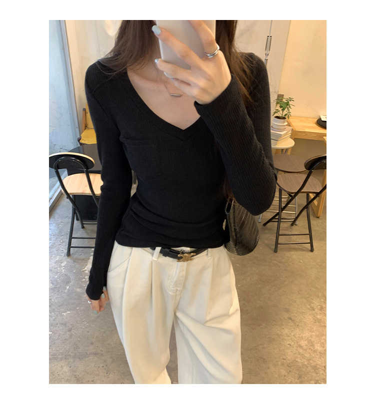 한국식 V 넥 포켓 슬림핏 슬리밍 탄성 니트 베이스 셔츠 여성의 2024 가을 및 겨울 새로운 긴팔 티셔츠 탑스토어 가기