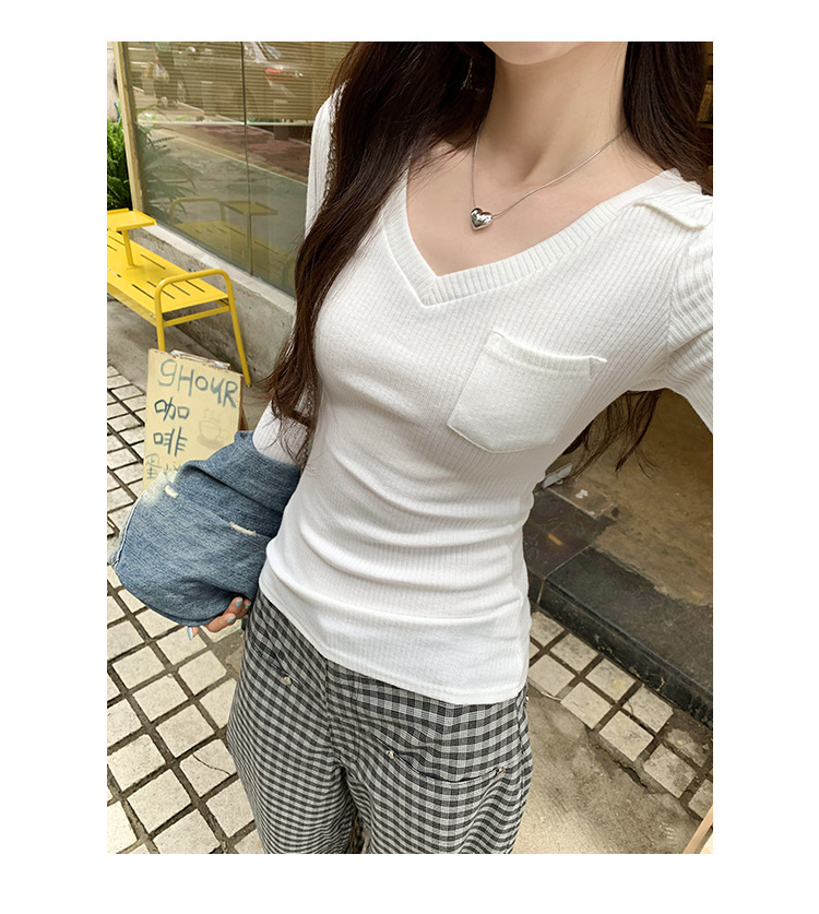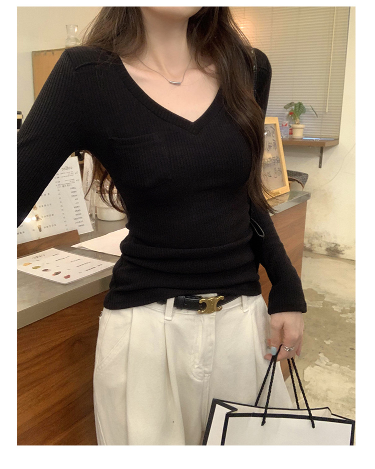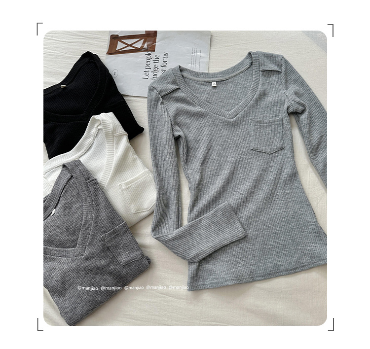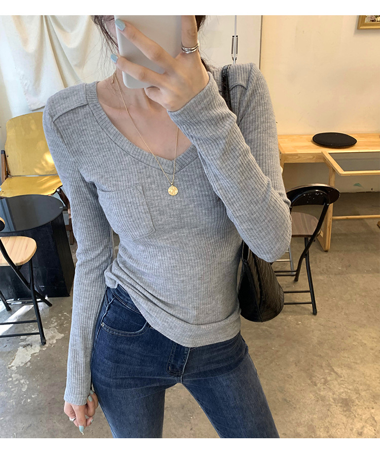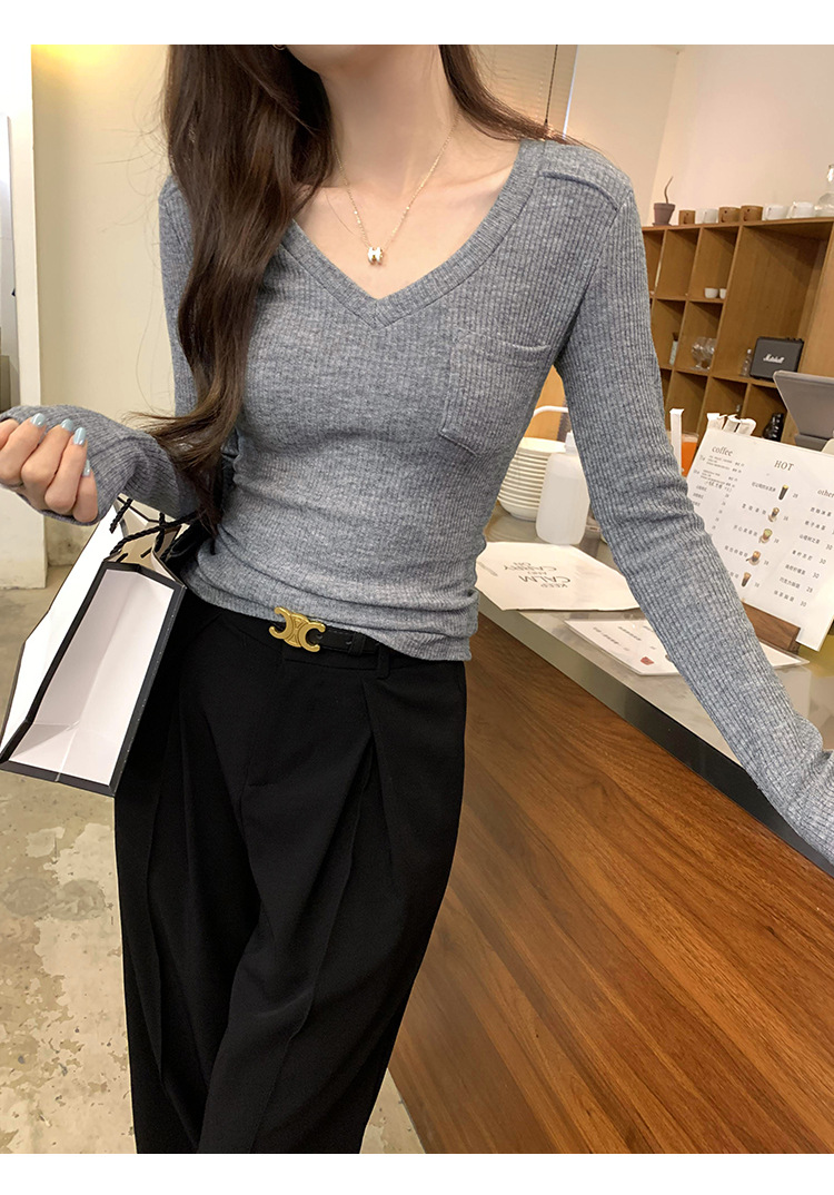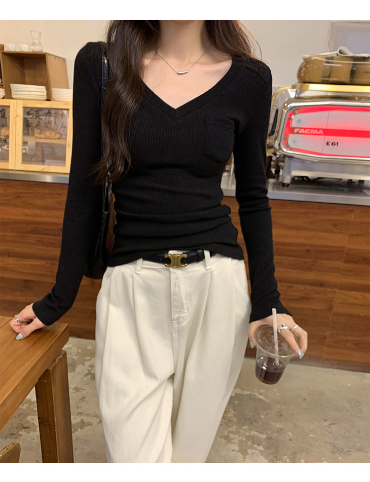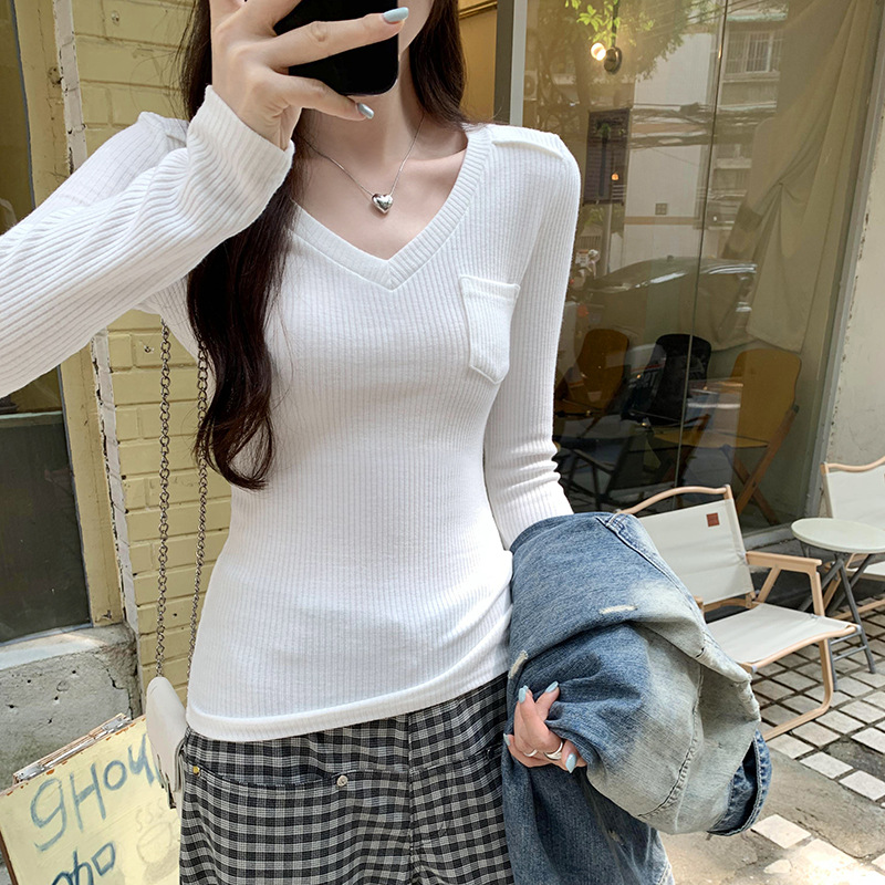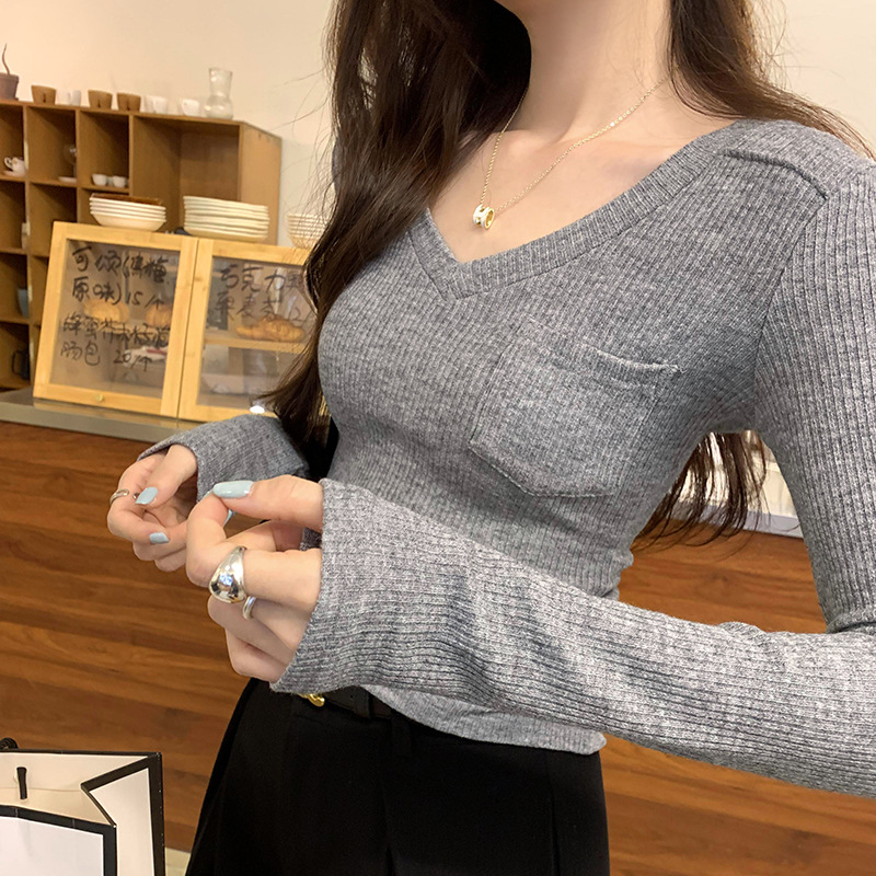 한국식 V 넥 포켓 슬림핏 슬리밍 탄성 니트 베이스 셔츠 여성의 2024 가을 및 겨울 새로운 긴팔 티셔츠 탑
