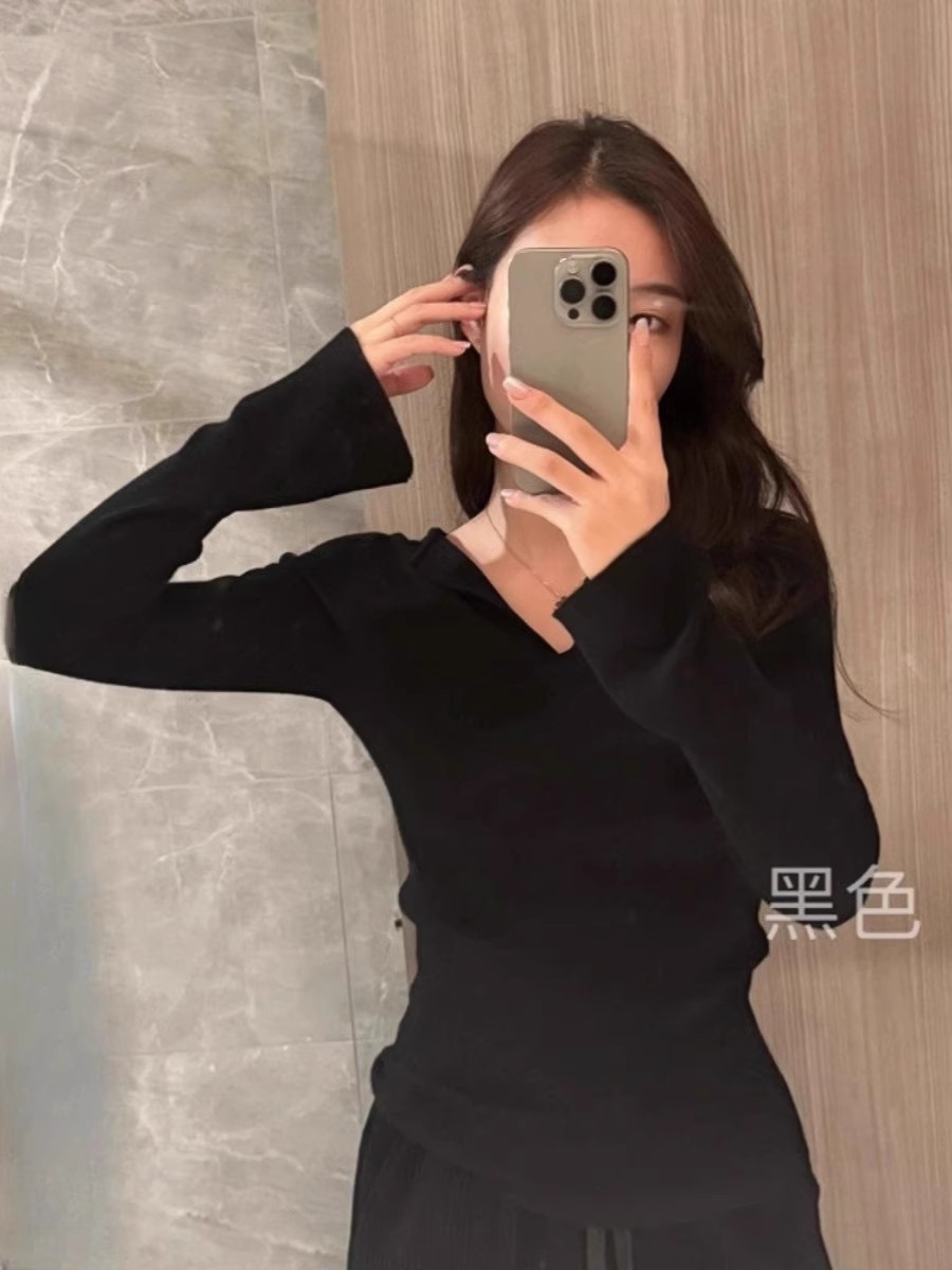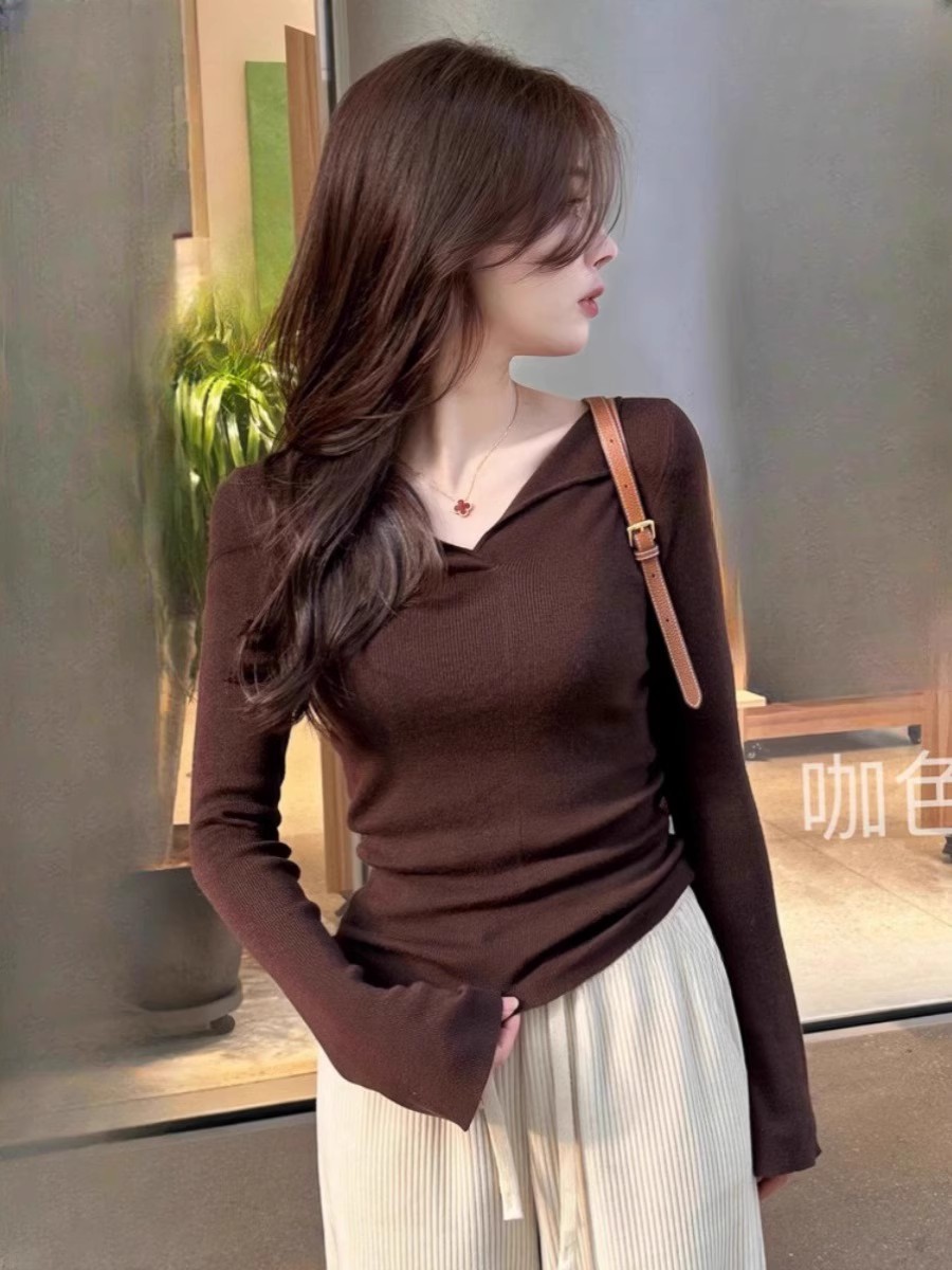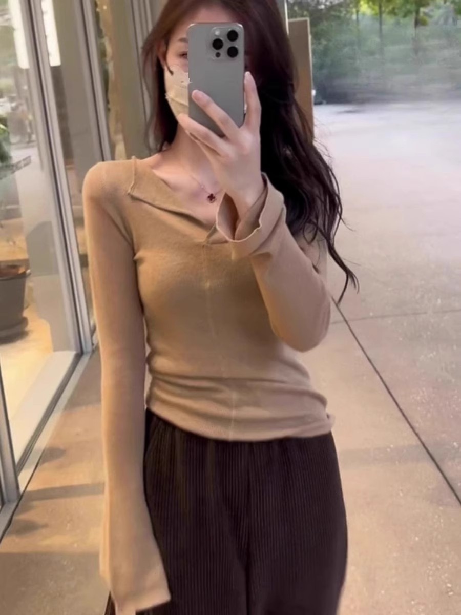 봄, 가을, 겨울용 보라색 브이넥 니트 스웨터 여성 슬림 핏 긴팔 이너웨어 탑스토어 가기