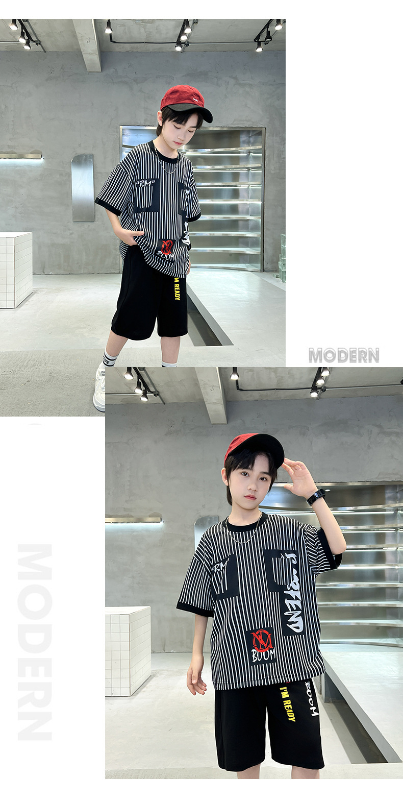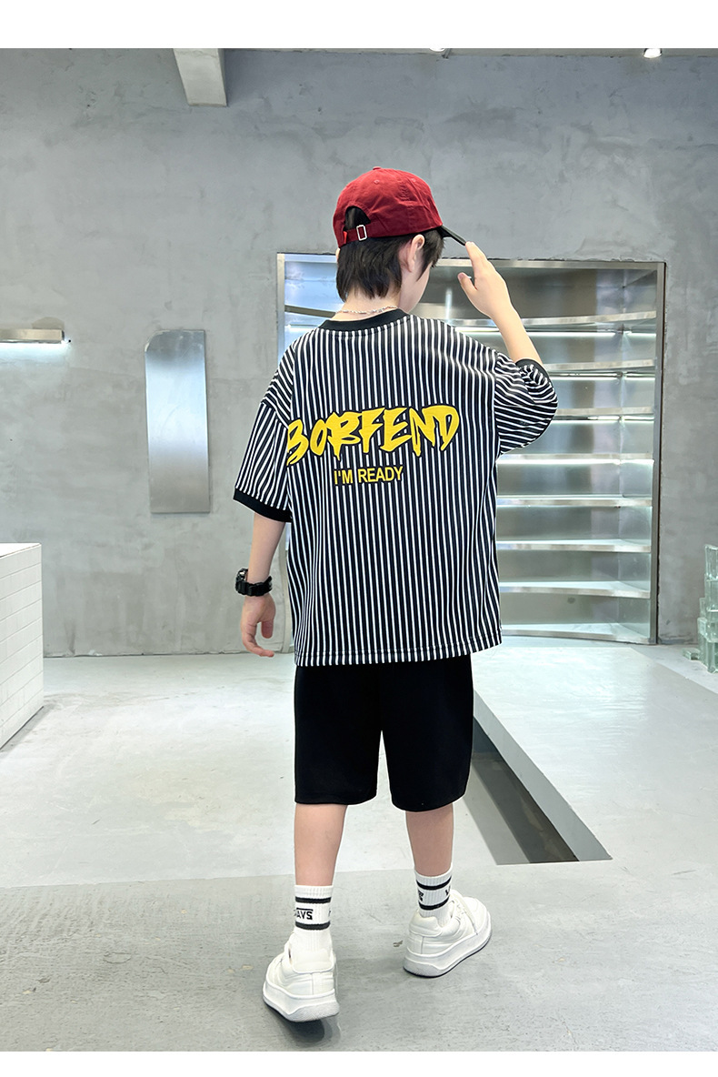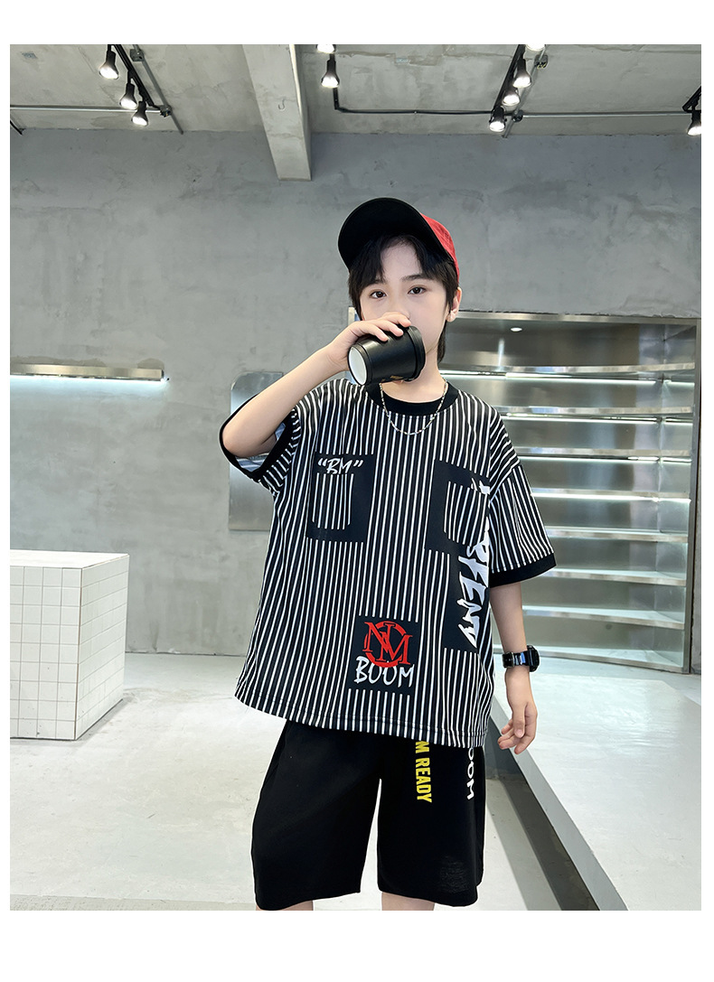 2024 여름 어린이 반팔 반바지 세트 유행 수직 줄무늬 느슨한 투피스 세트스토어 가기