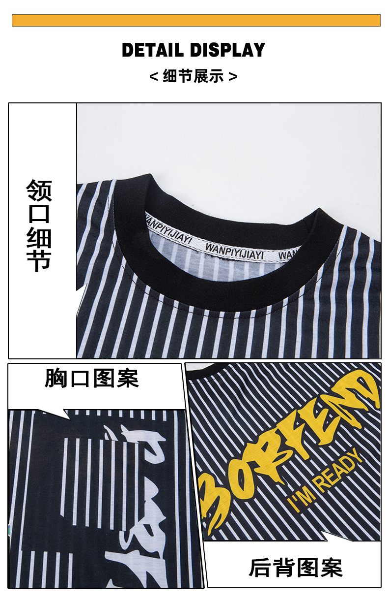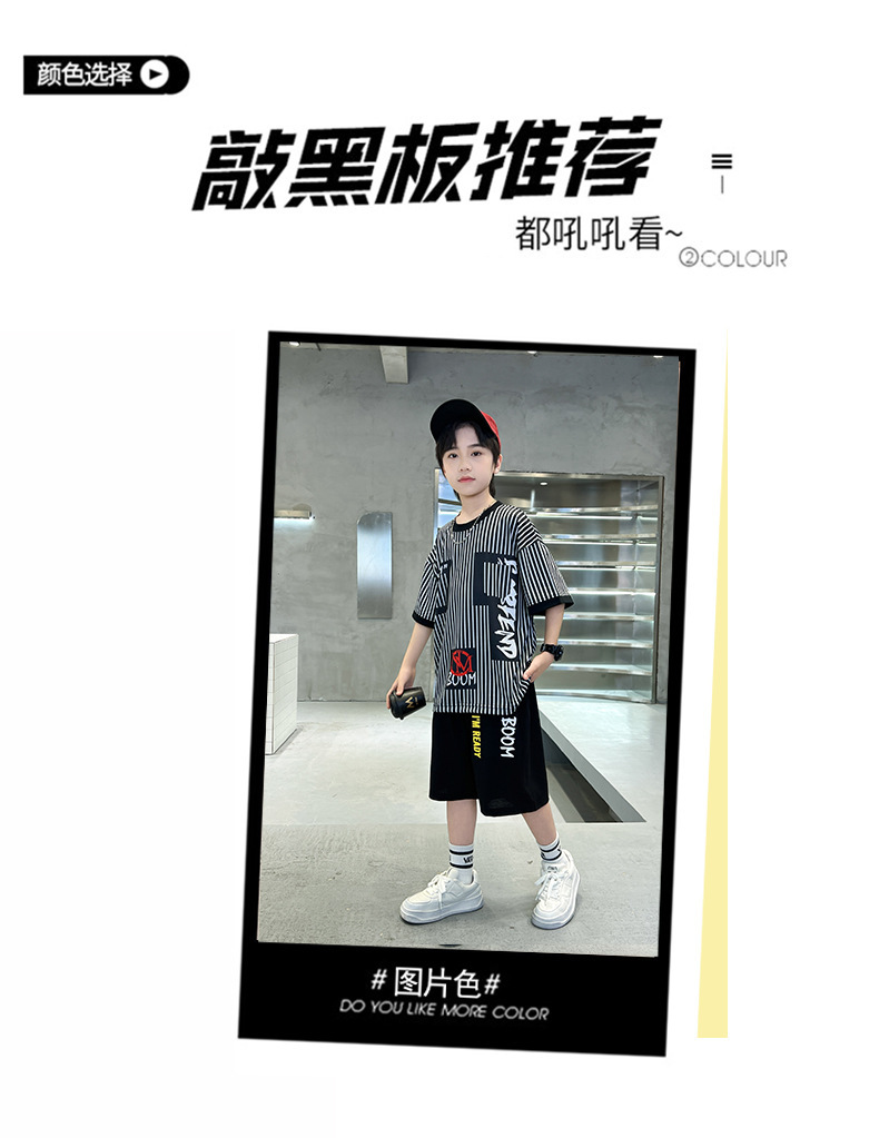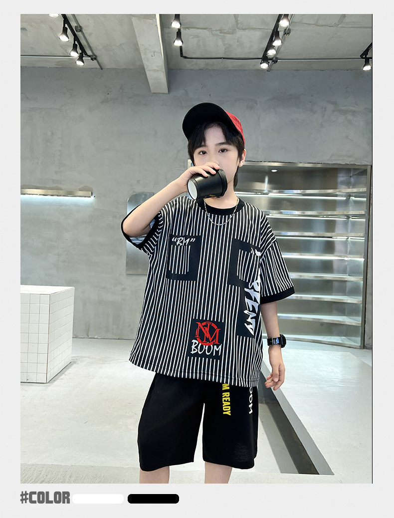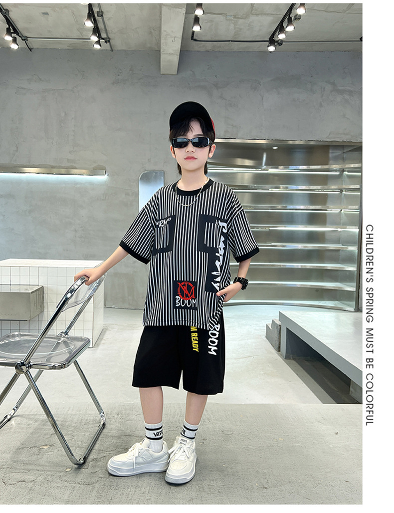 2024 여름 어린이 반팔 반바지 세트 유행 수직 줄무늬 느슨한 투피스 세트스토어 가기