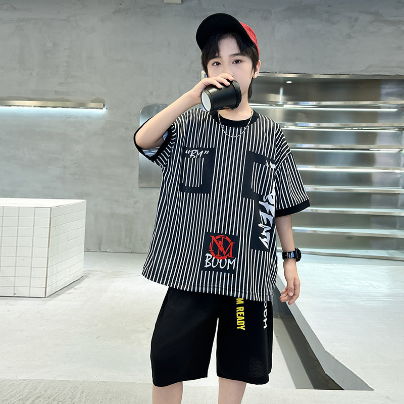 2024 여름 어린이 반팔 반바지 세트 유행 수직 줄무늬 느슨한 투피스 세트