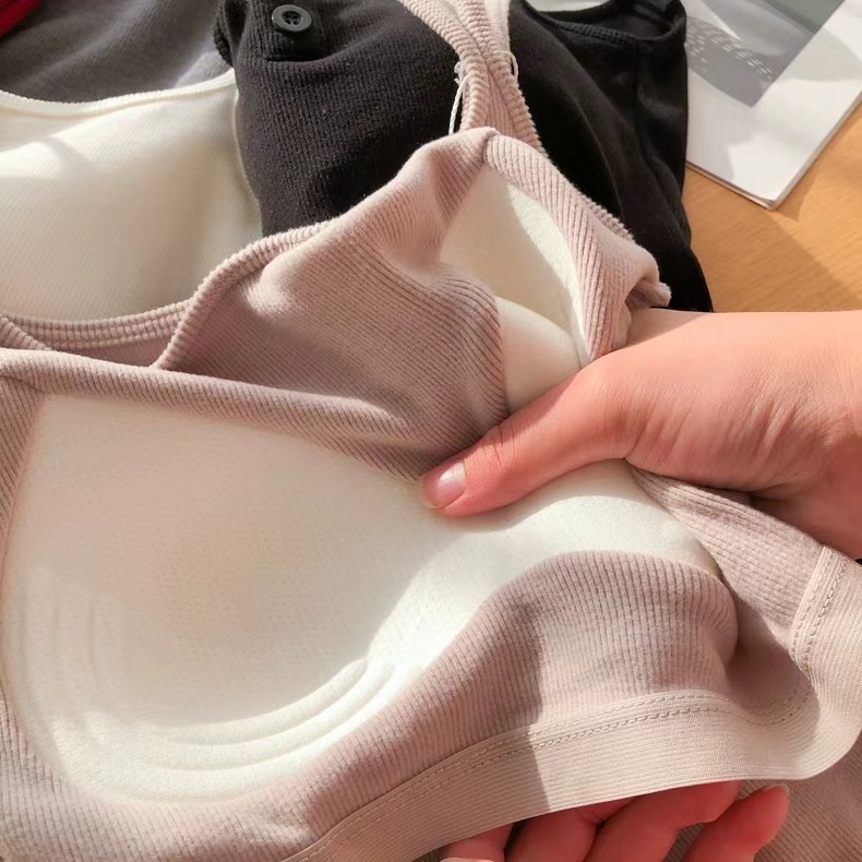 가을과 겨울 샌딩 솔리드 컬러 스퀘어 칼라 더블 숄더 스트랩 작은 슬링 슬림 핏 슬림 조끼 여성 통합 가슴 패드 따뜻한베이스 셔츠