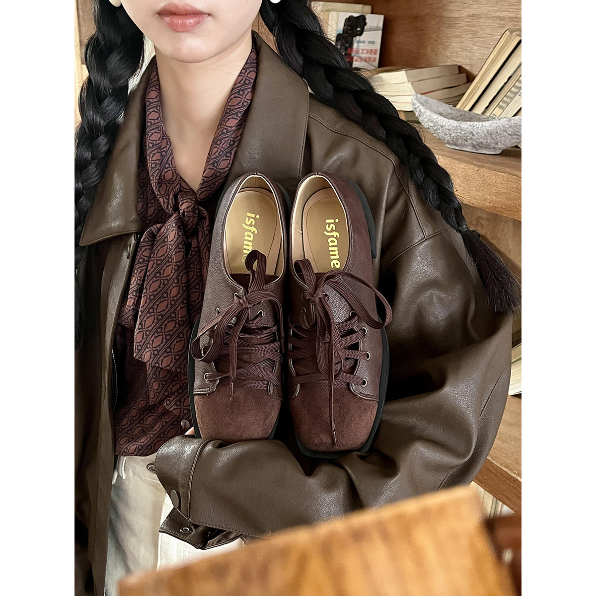 2024 년 가을을위한 "서양 핸드북" 틈새 레트로 스타일 작은 가죽 신발 여성의 새로운 레이스 업 두꺼운 힐 스퀘어 발가락 신발스토어 가기