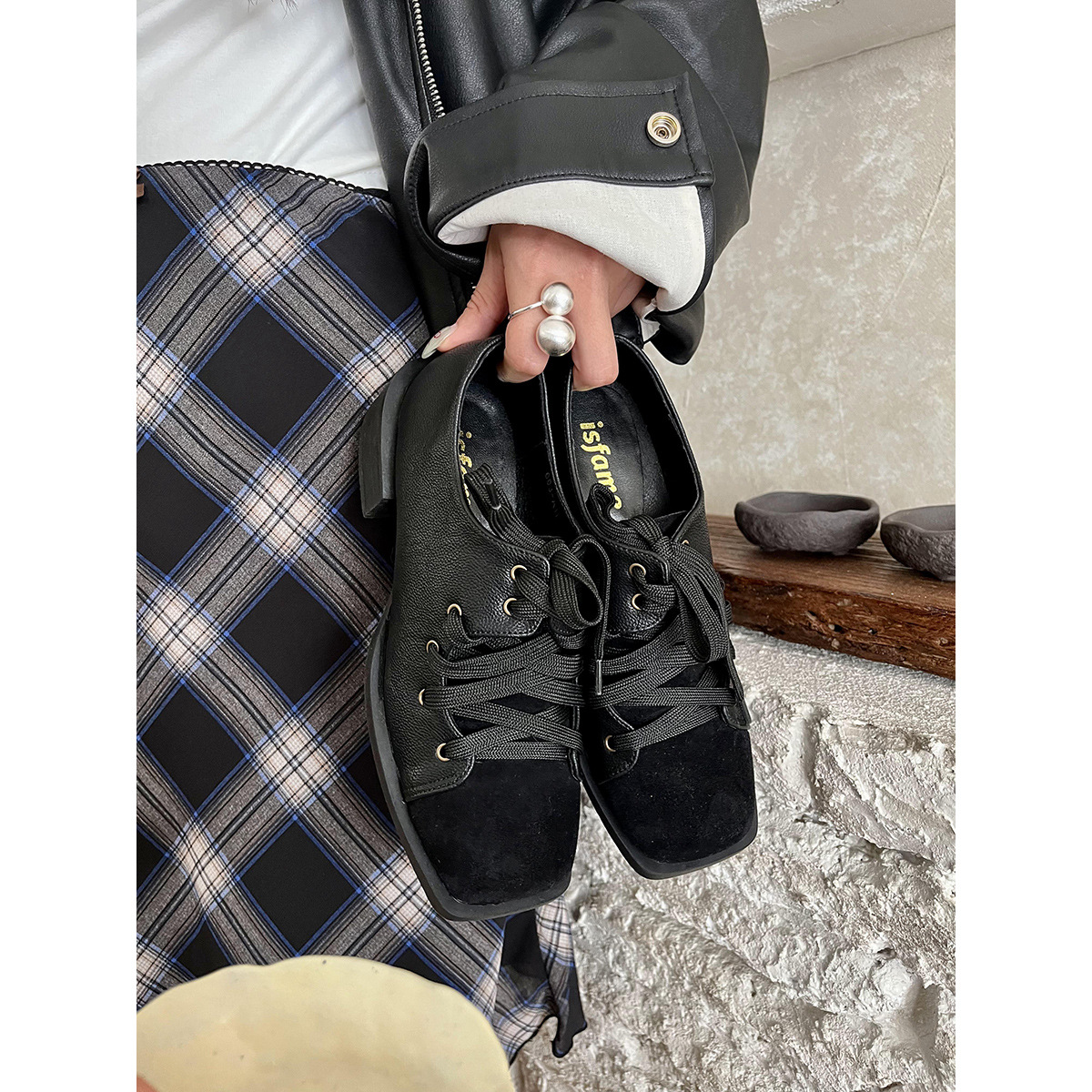 2024 년 가을을위한 "서양 핸드북" 틈새 레트로 스타일 작은 가죽 신발 여성의 새로운 레이스 업 두꺼운 힐 스퀘어 발가락 신발