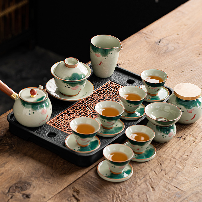 얼음 균열 유약 순수한 손으로 그린 세라믹 페어 컵 차 세트 차 세트 티 컵 홈 쿵푸 차 세트 액세서리 페어 컵 차 바다