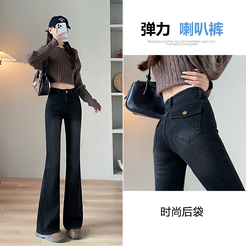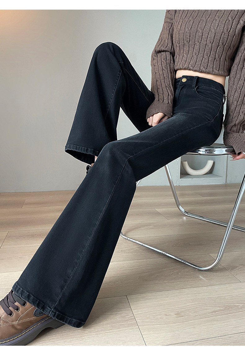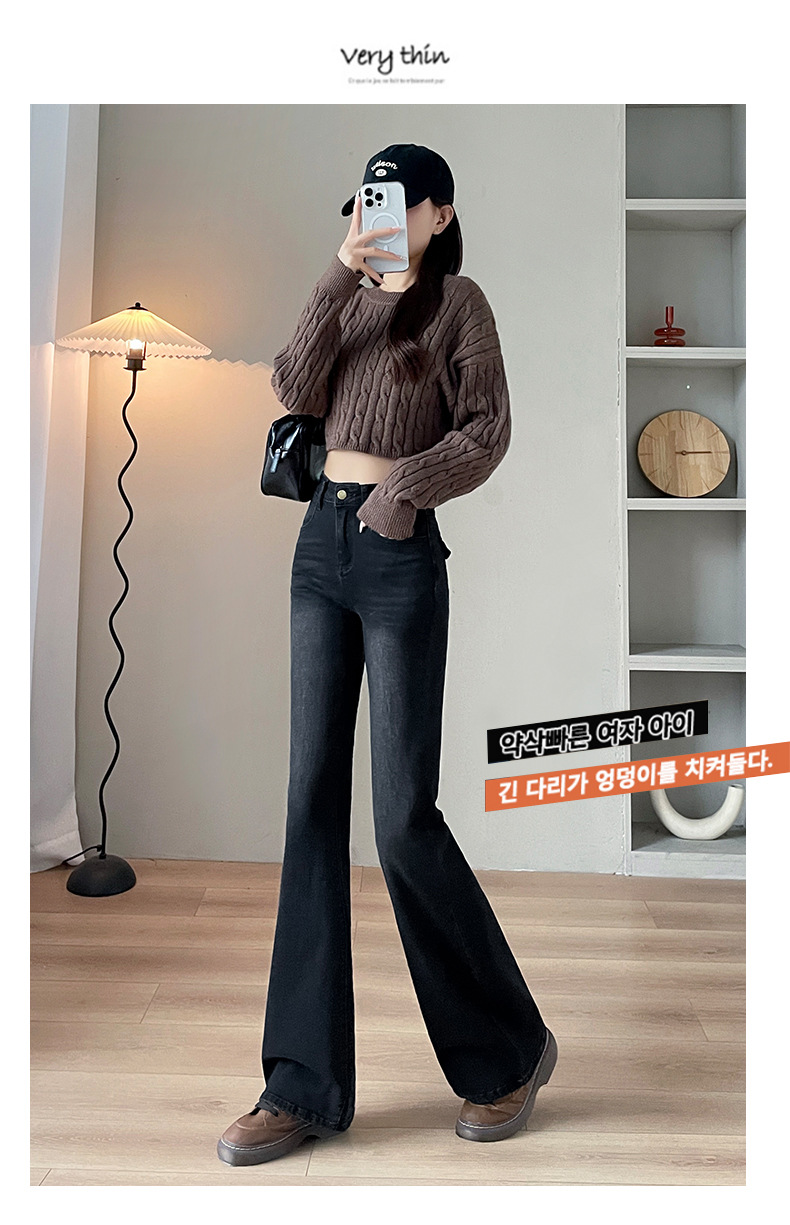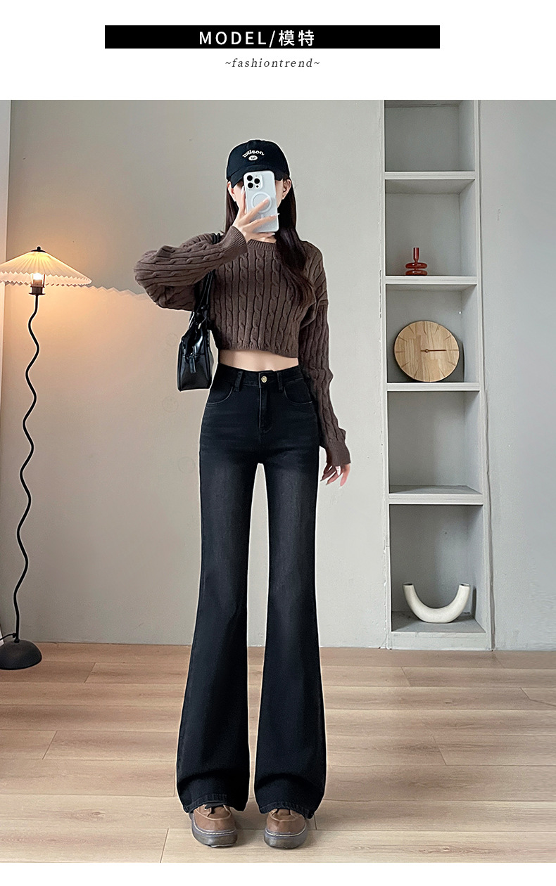 블랙 그레이 하이웨이스트 부츠컷 플리스 데님 팬츠 여성용 가을 겨울 2025 신상 슬림핏 소녀용 말굽형 바지스토어 가기