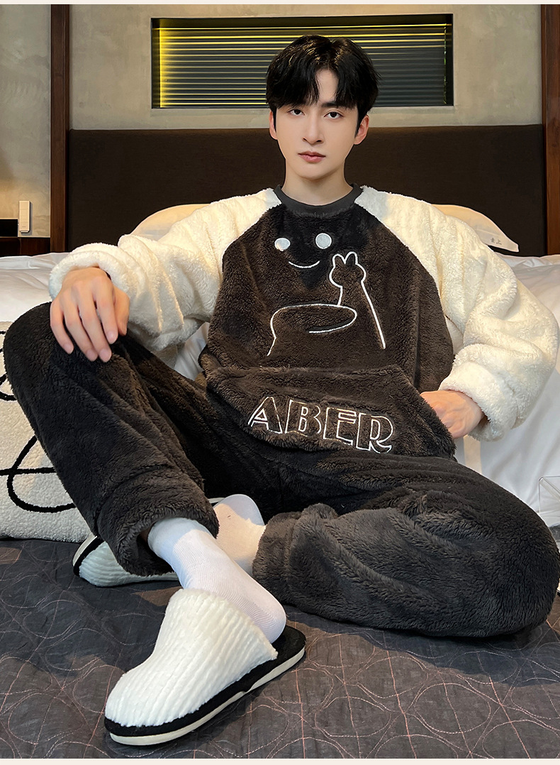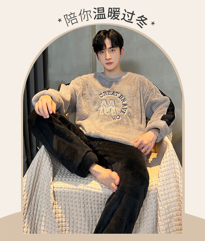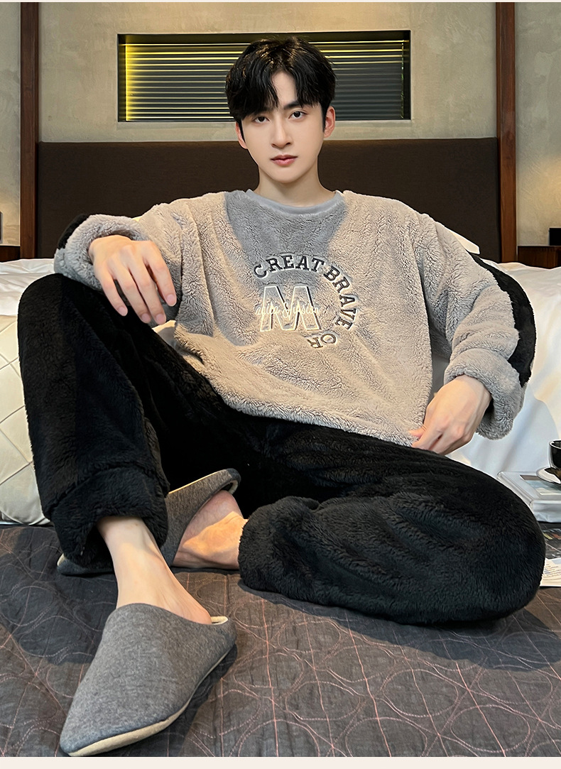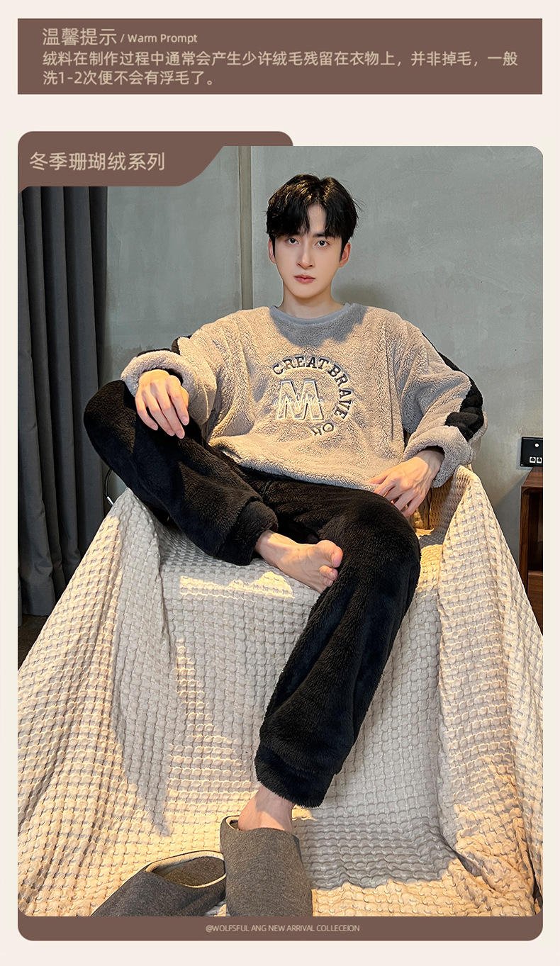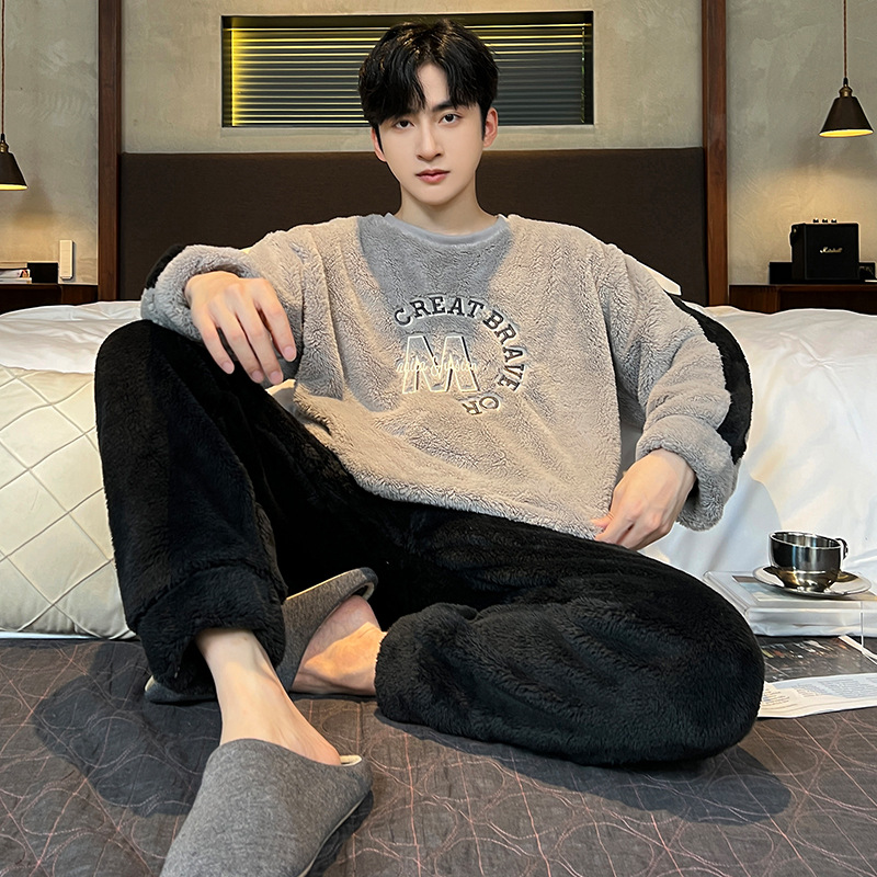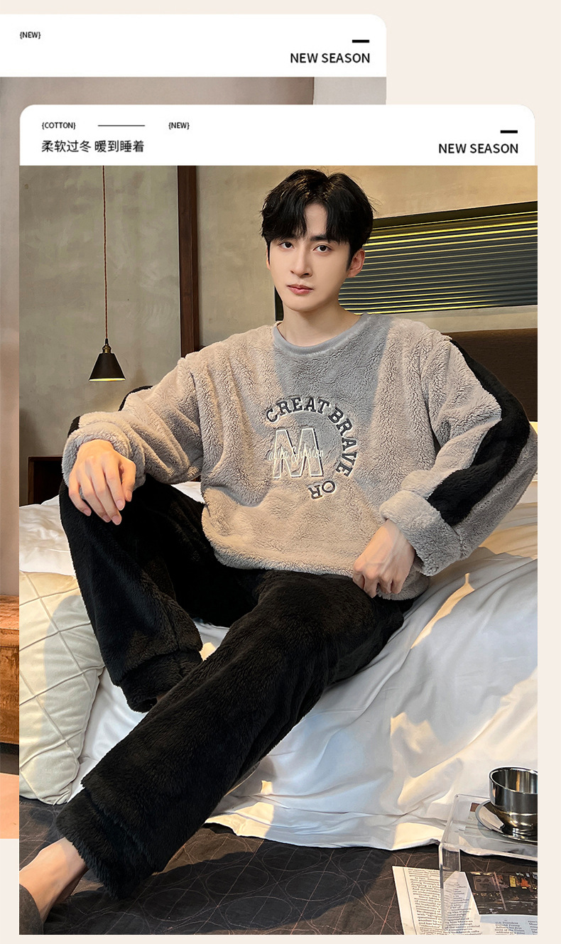 새로운 남자 겨울 잠옷 긴 소매 산호 양털 크루 넥 따뜻한 홈 착용 청소년 학생 플러스 사이즈 세트.-스토어 가기