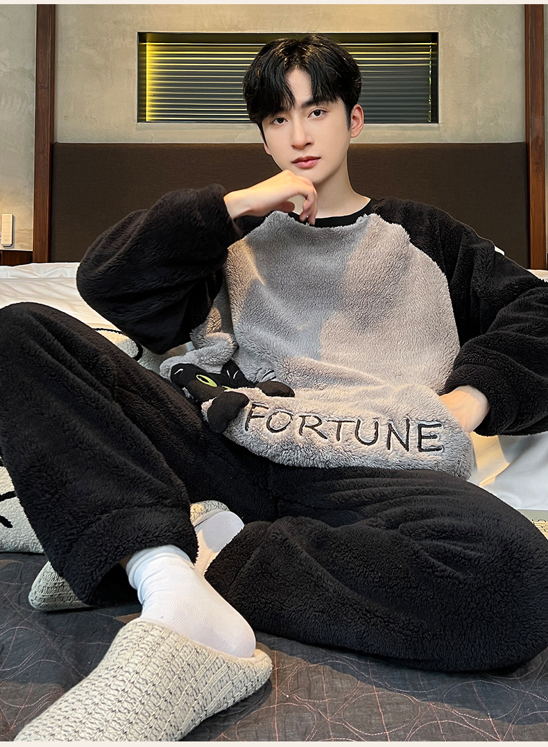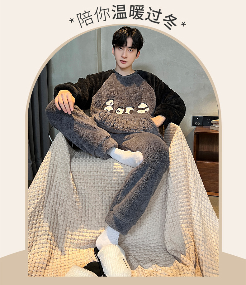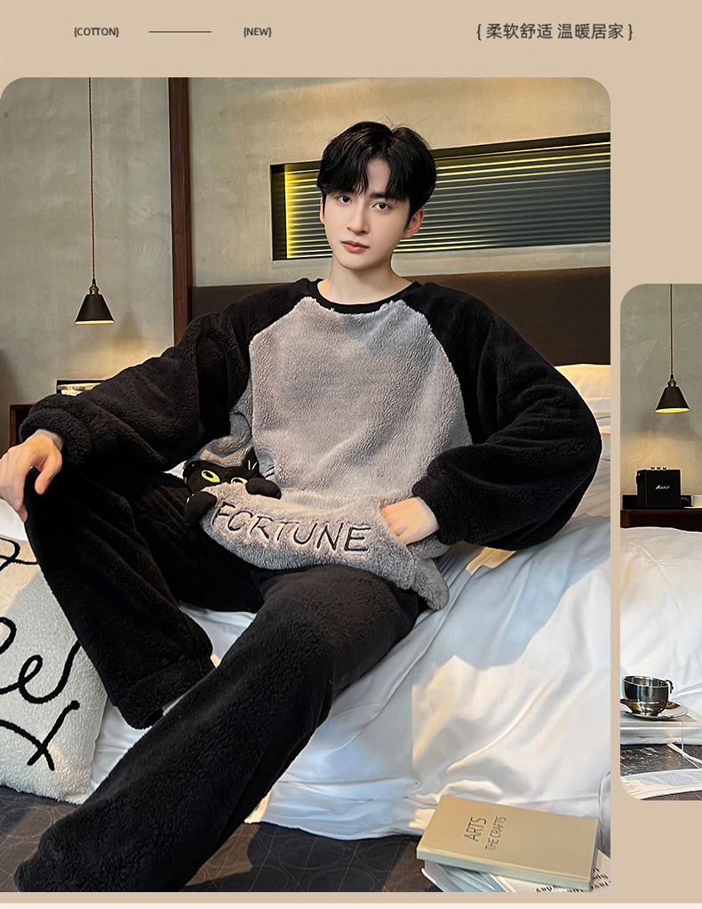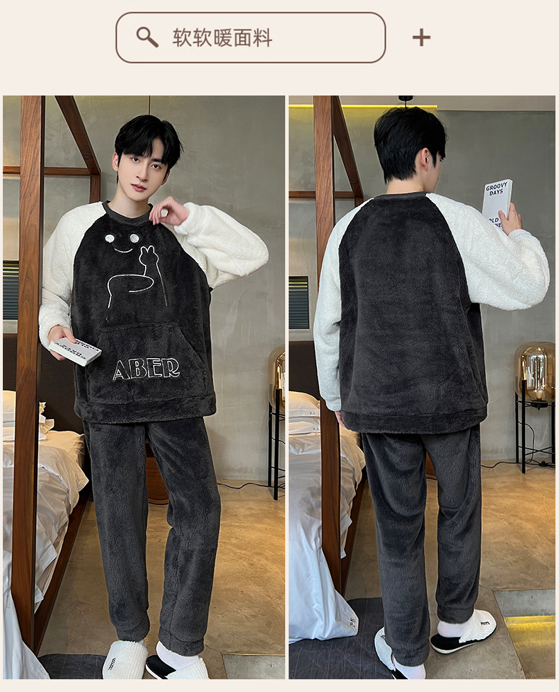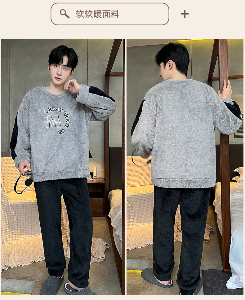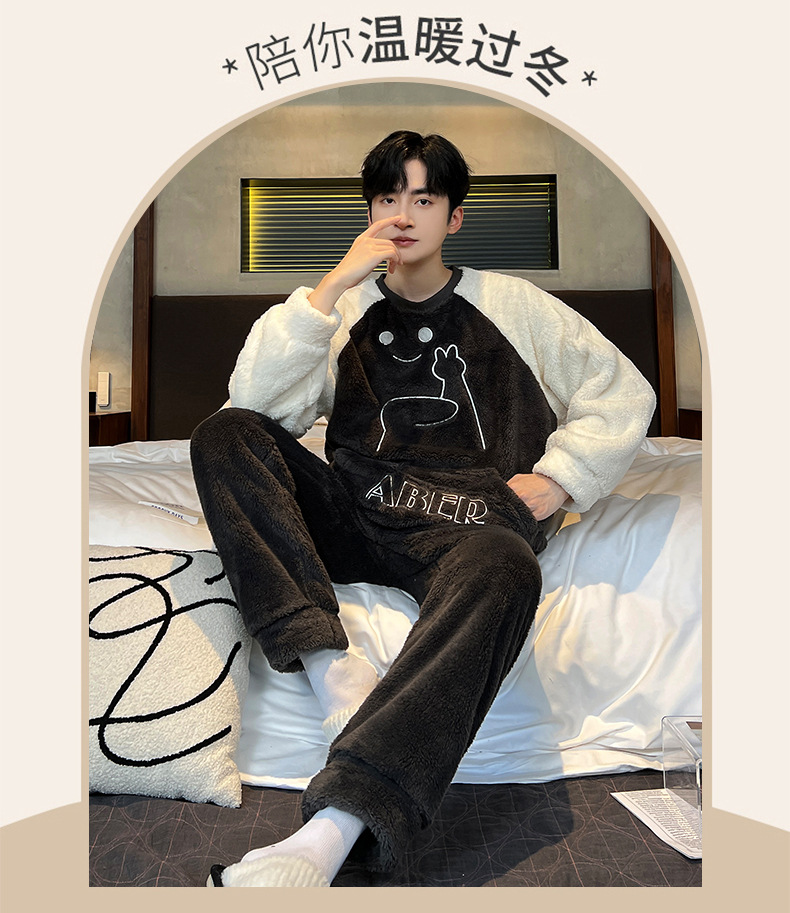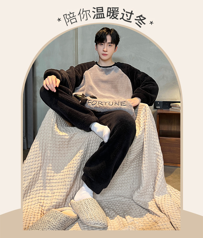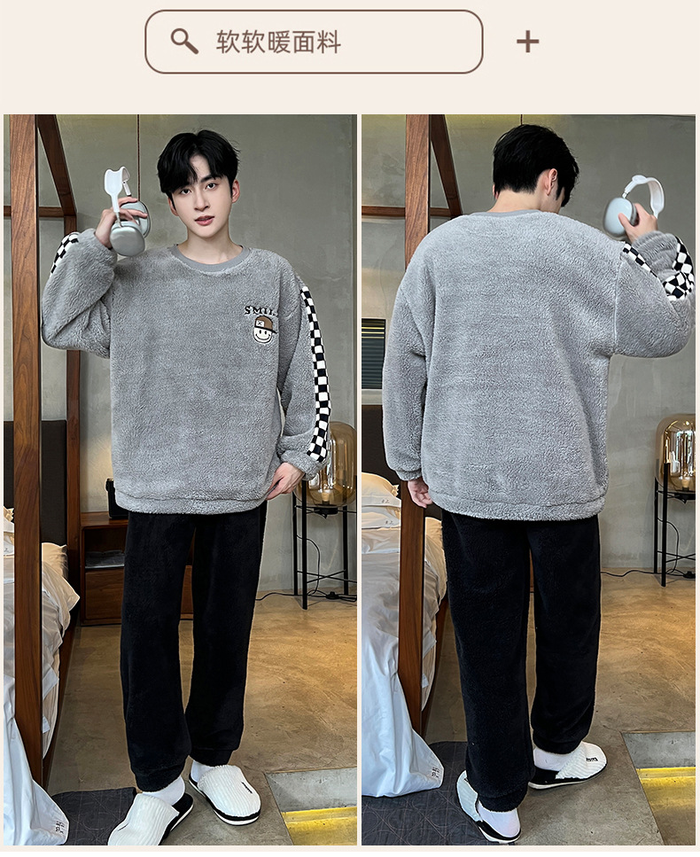 새로운 남자 겨울 잠옷 긴 소매 산호 양털 크루 넥 따뜻한 홈 착용 청소년 학생 플러스 사이즈 세트.-스토어 가기