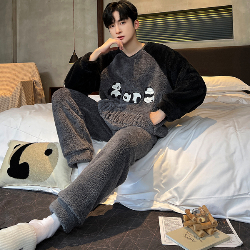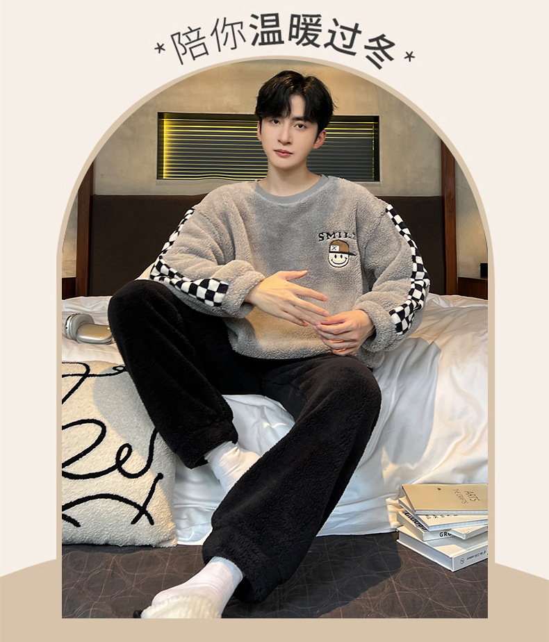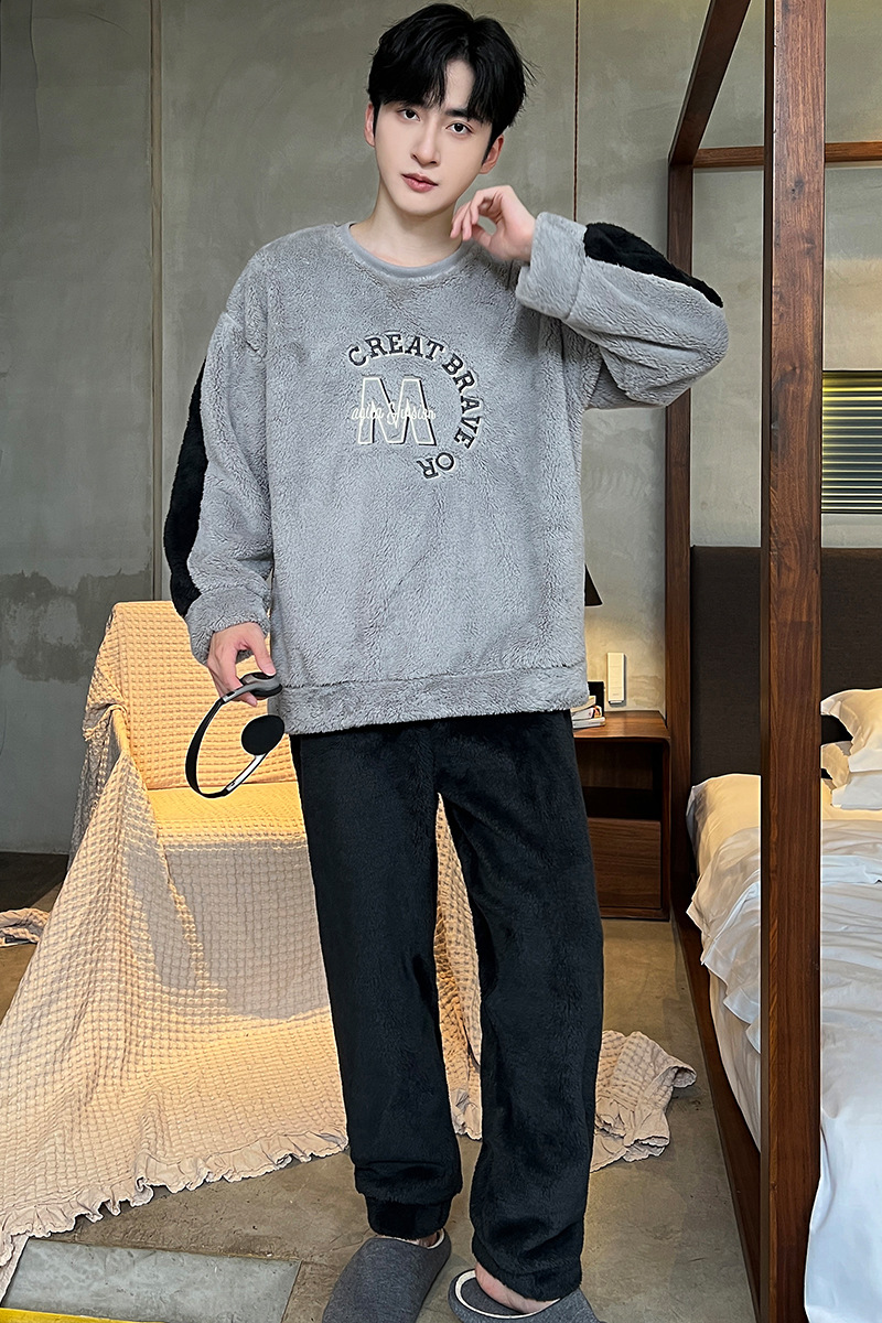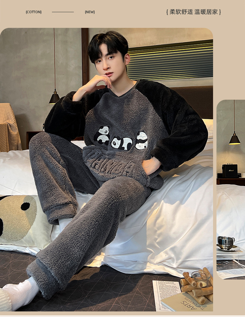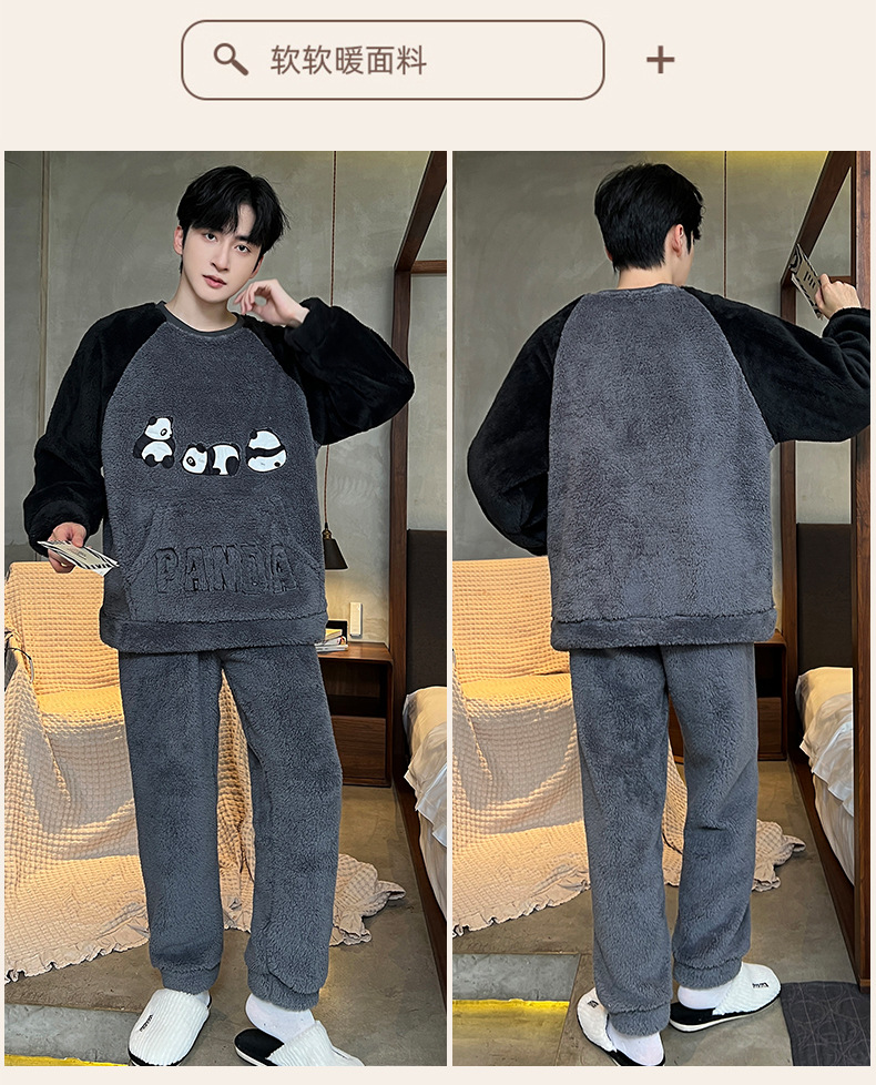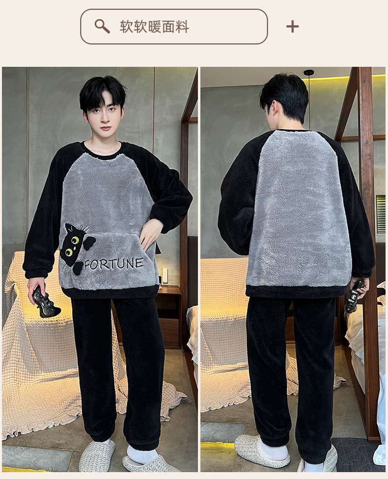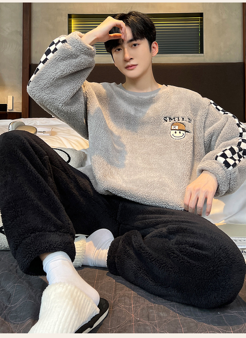 새로운 남자 겨울 잠옷 긴 소매 산호 양털 크루 넥 따뜻한 홈 착용 청소년 학생 플러스 사이즈 세트.-스토어 가기