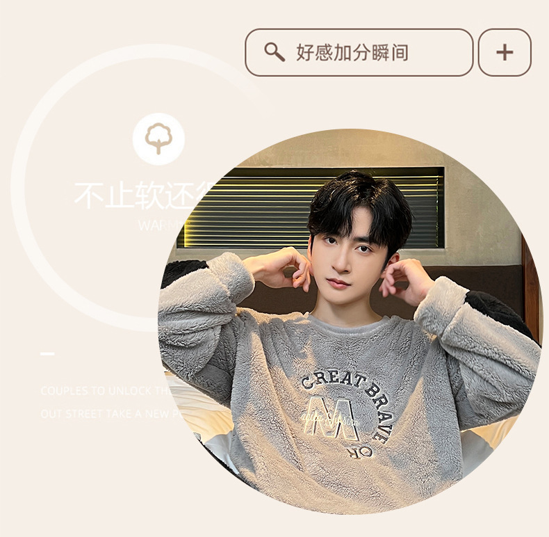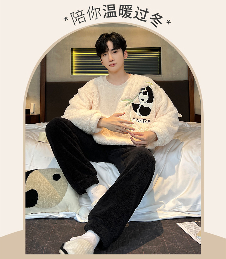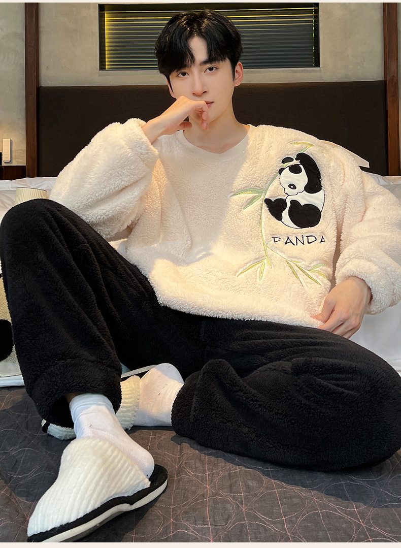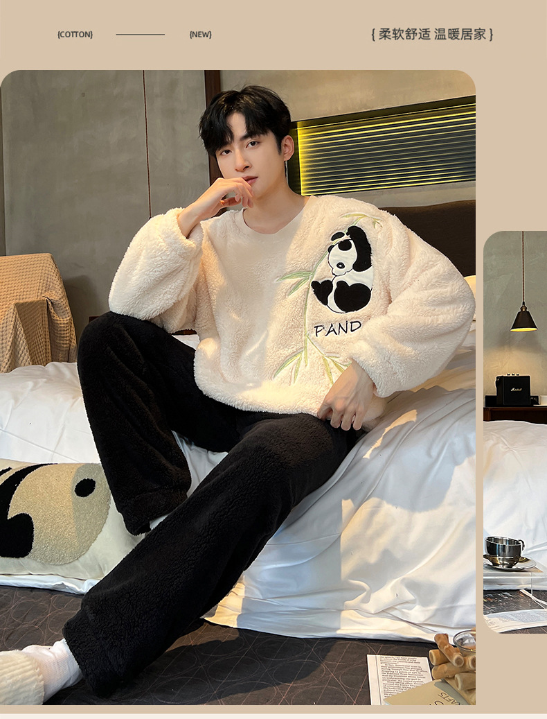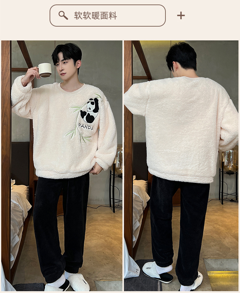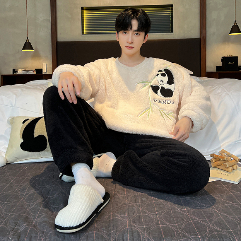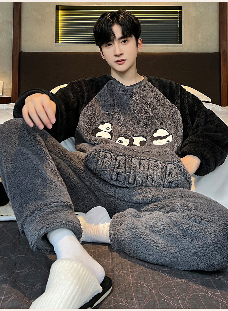 새로운 남자 겨울 잠옷 긴 소매 산호 양털 크루 넥 따뜻한 홈 착용 청소년 학생 플러스 사이즈 세트.-스토어 가기