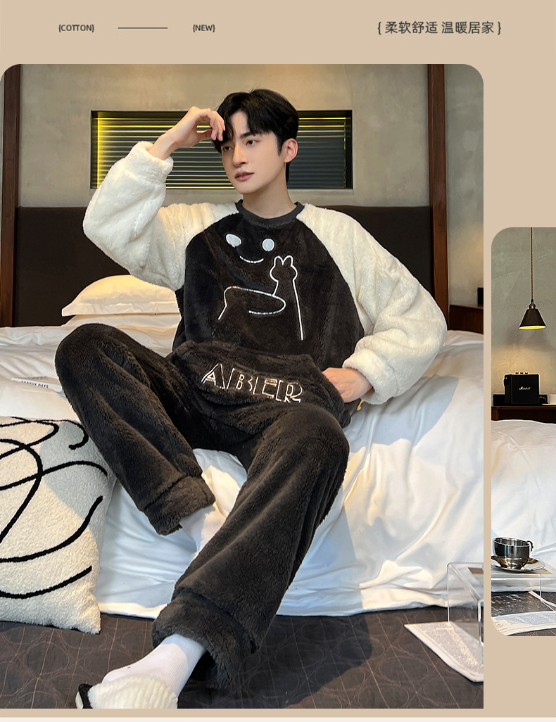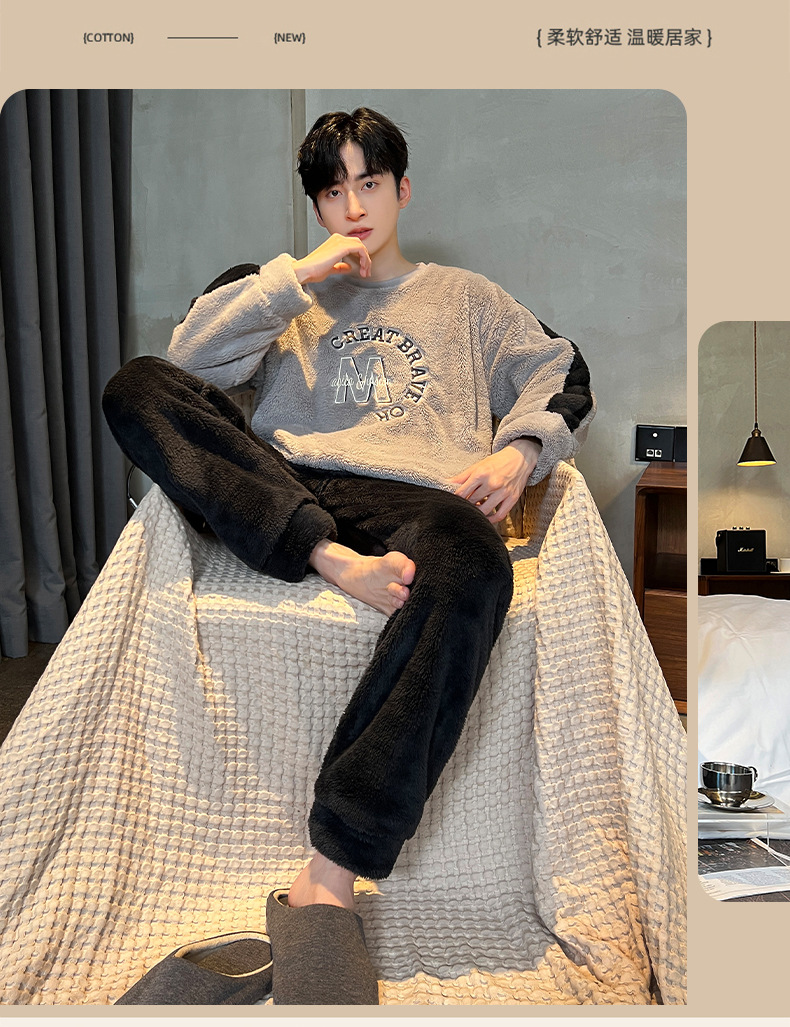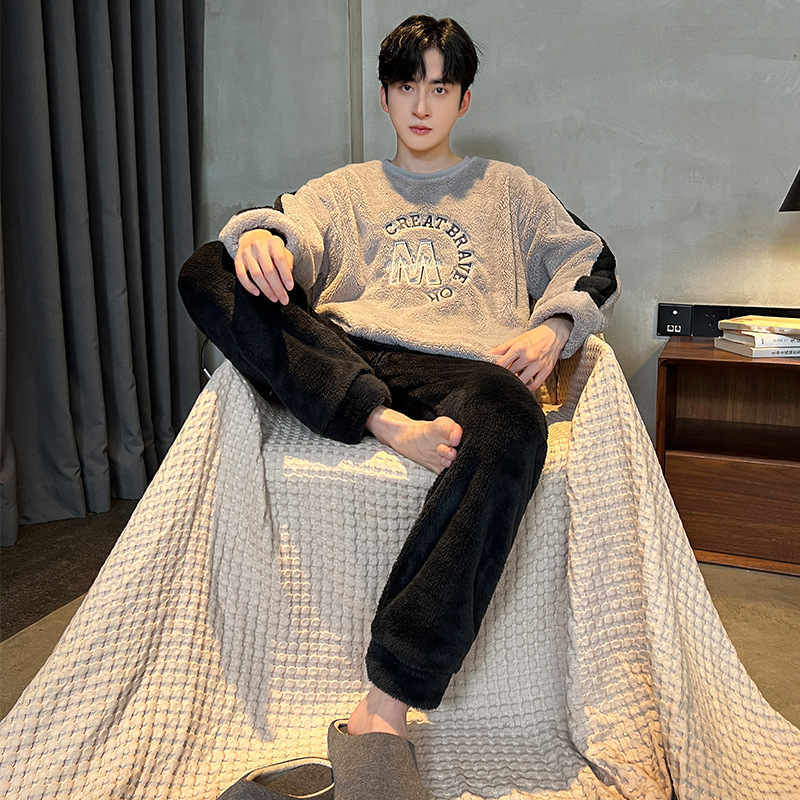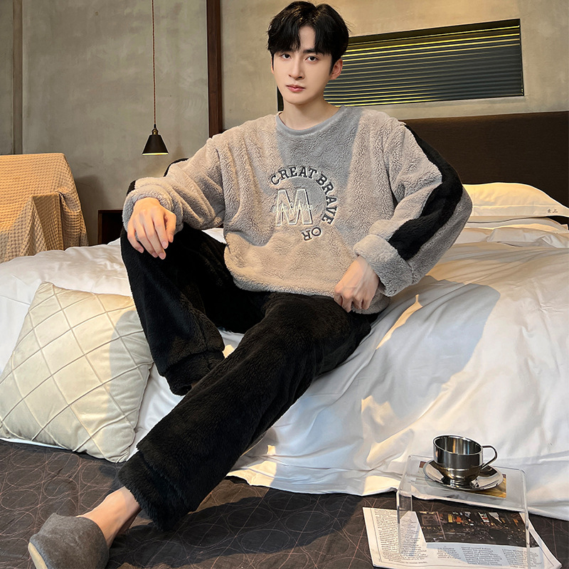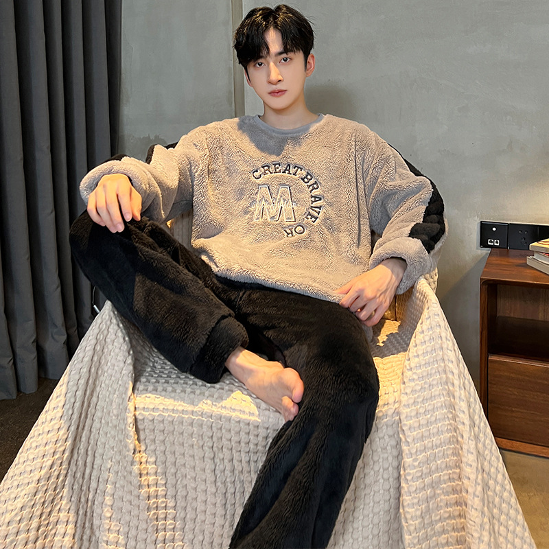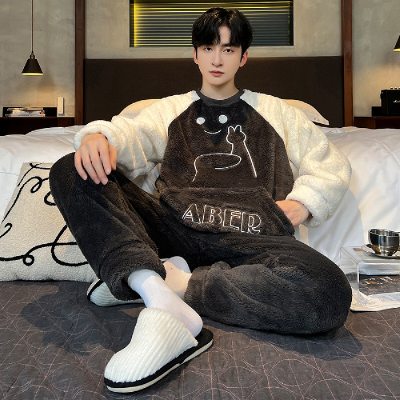 새로운 남자 겨울 잠옷 긴 소매 산호 양털 크루 넥 따뜻한 홈 착용 청소년 학생 플러스 사이즈 세트.-