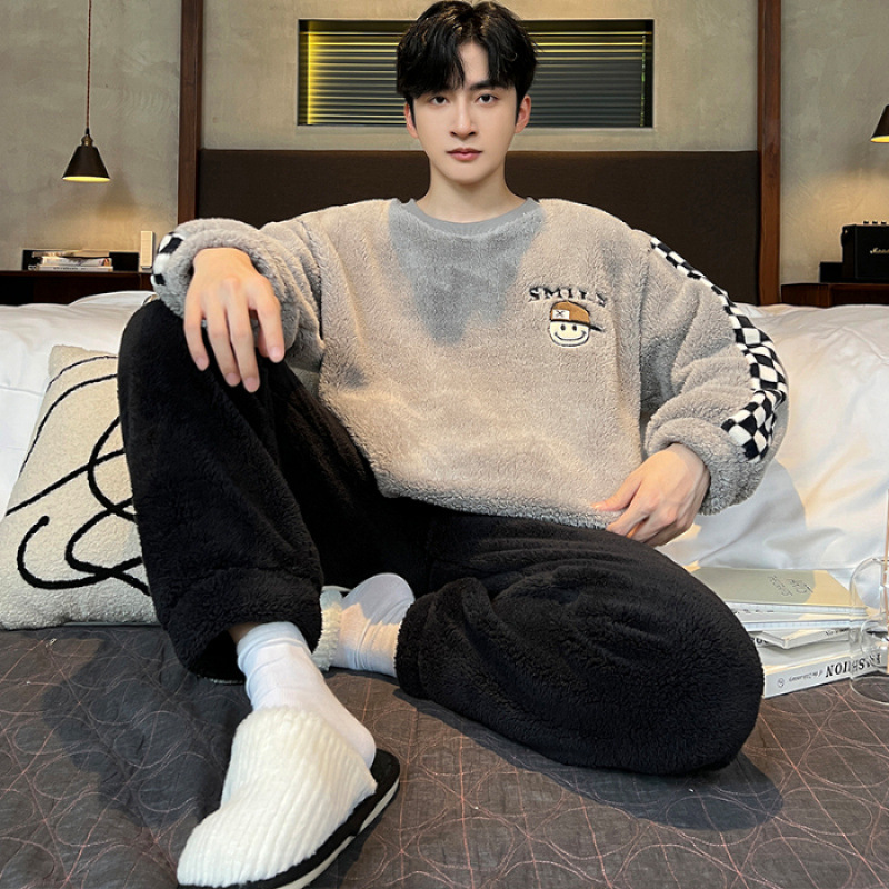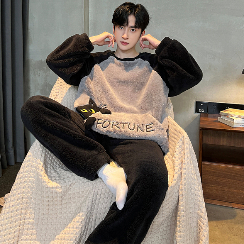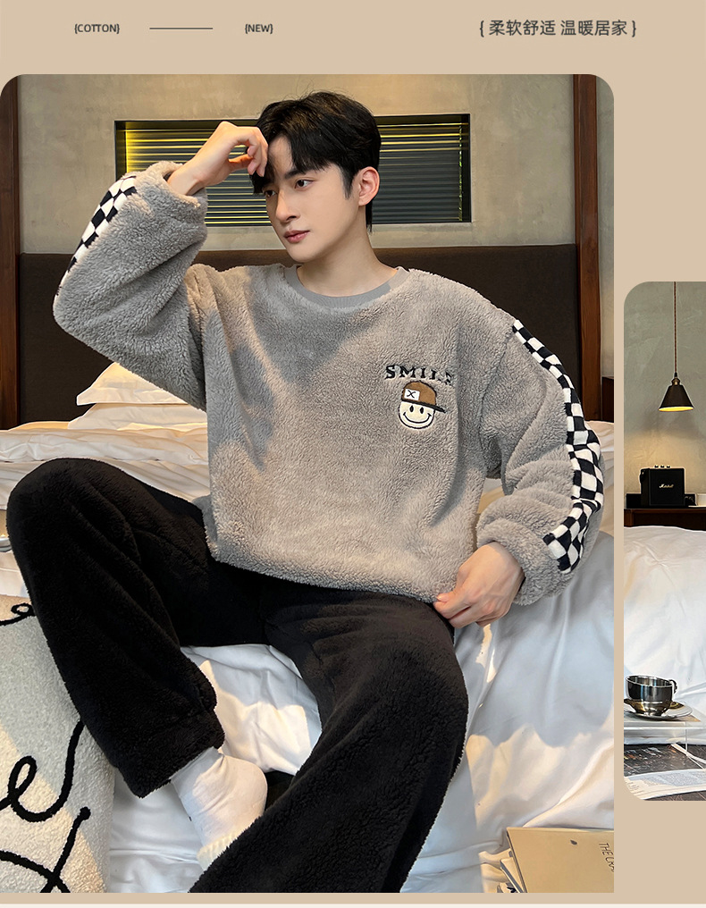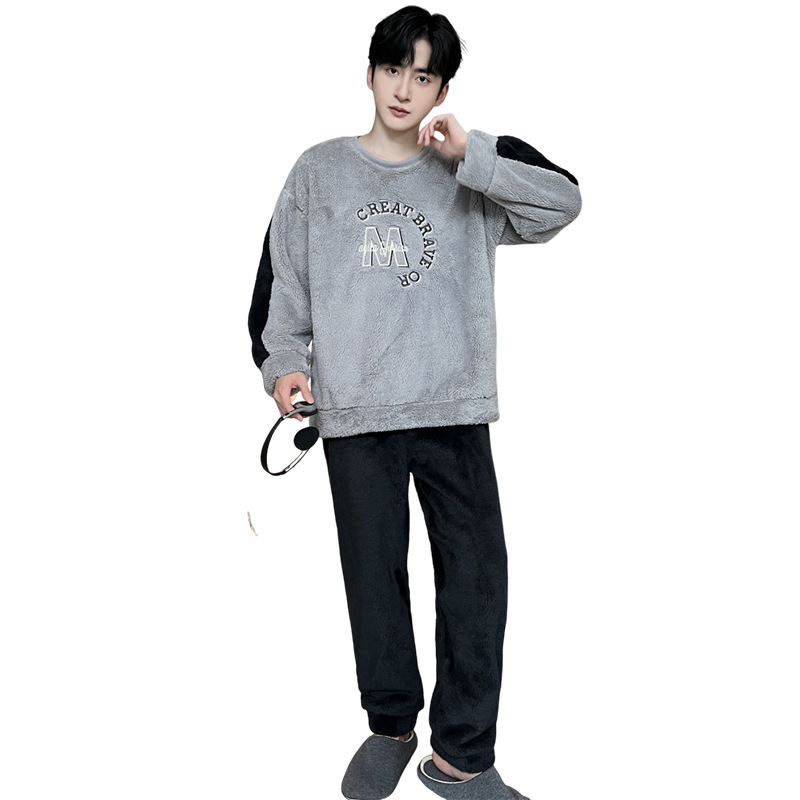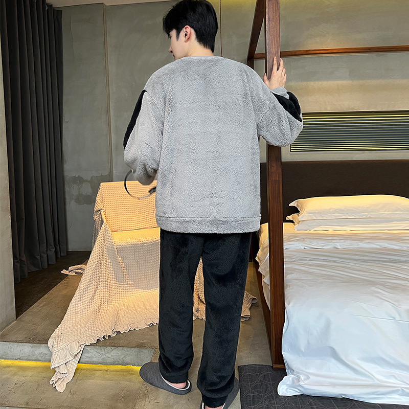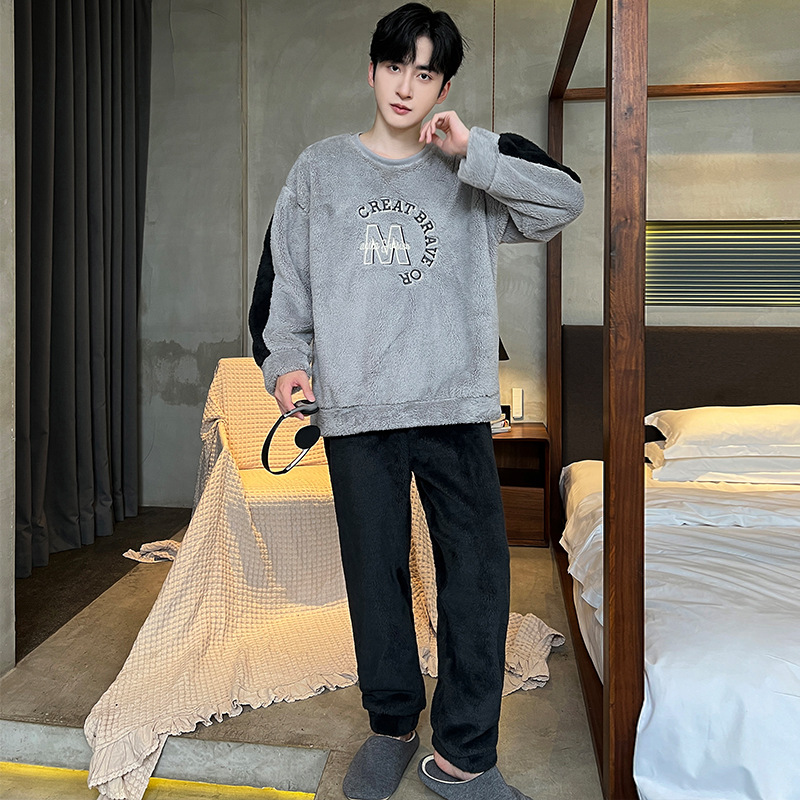 새로운 남자 겨울 잠옷 긴 소매 산호 양털 크루 넥 따뜻한 홈 착용 청소년 학생 플러스 사이즈 세트.-